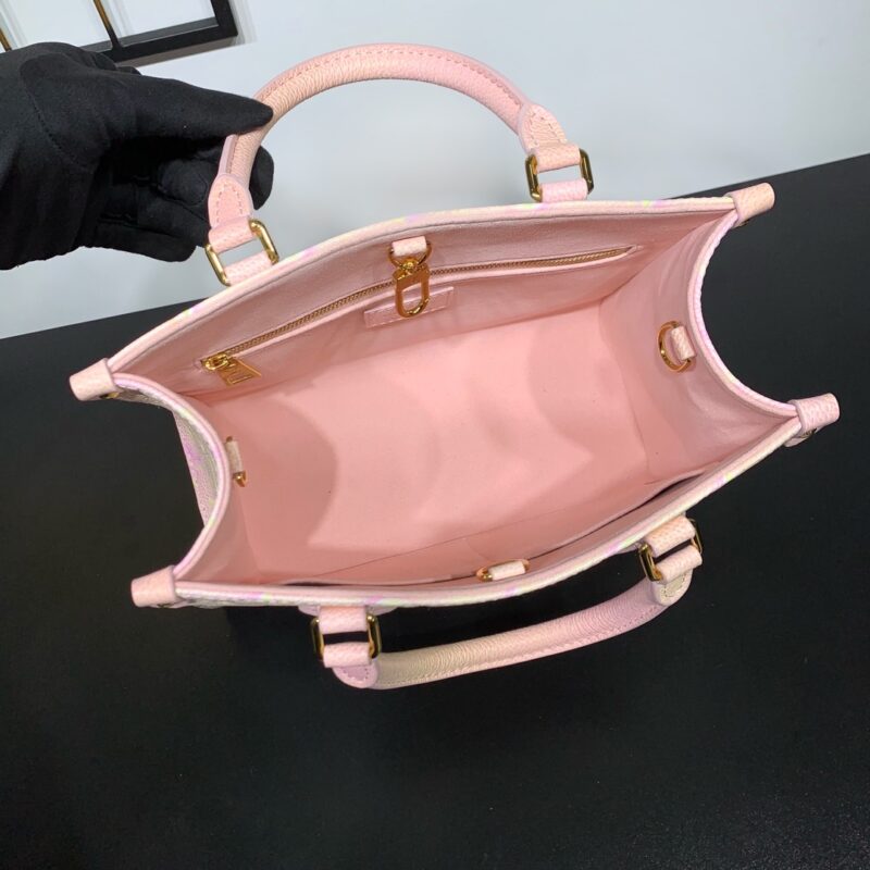 Style number: M46168 The Onthego small bag uses Louis Vuitton’s three-step spray-painting technique to render Monogram Empreinte leather in a psychedelic new color. Rolled leather handles and a slim shoulder strap allow for versatile carrying. 25 x 19 x 11.5 cm (length x height x width)