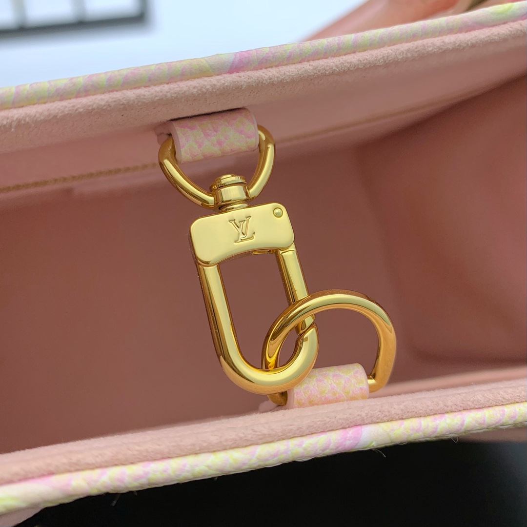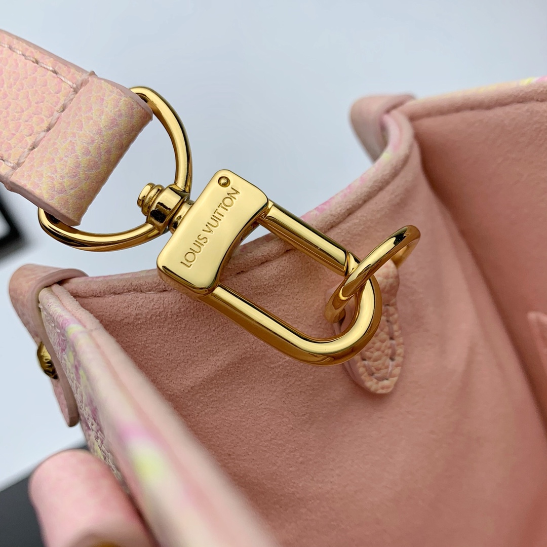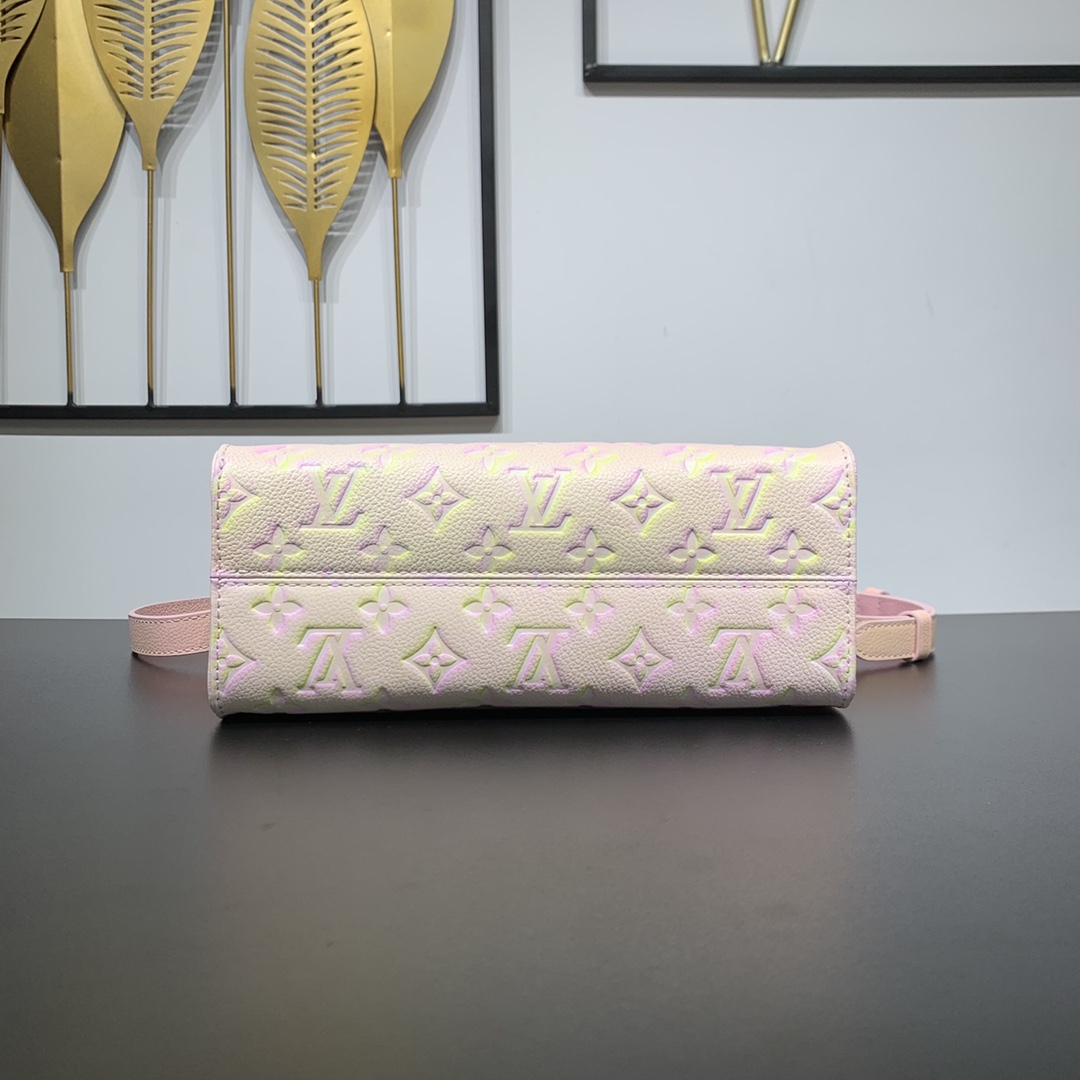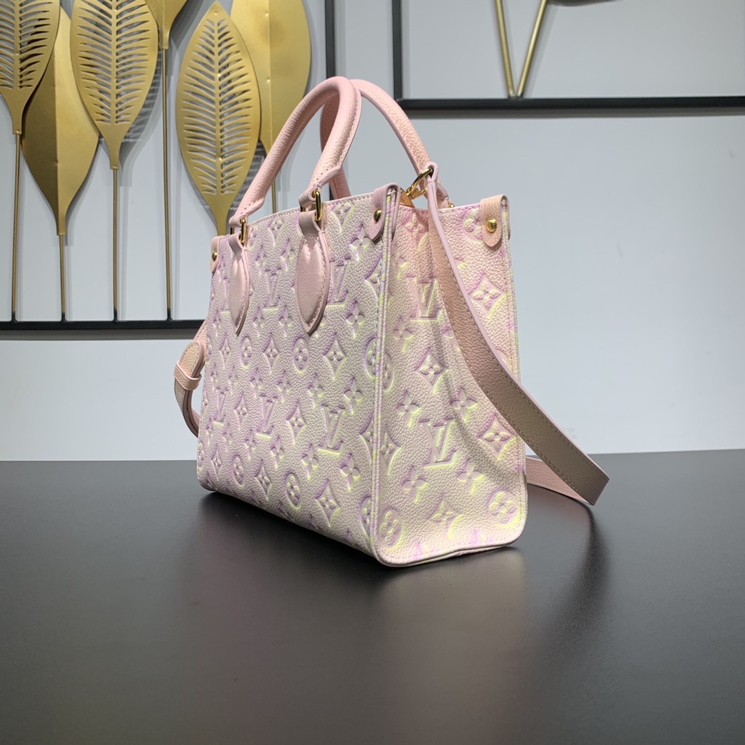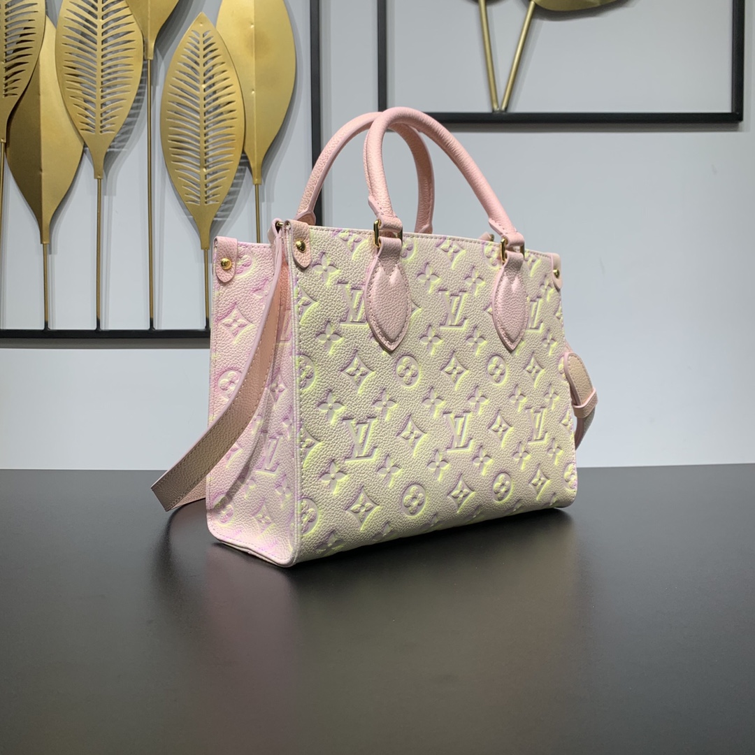 Style number: M46168 The Onthego small bag uses Louis Vuitton’s three-step spray-painting technique to render Monogram Empreinte leather in a psychedelic new color. Rolled leather handles and a slim shoulder strap allow for versatile carrying. 25 x 19 x 11.5 cm (length x height x width)