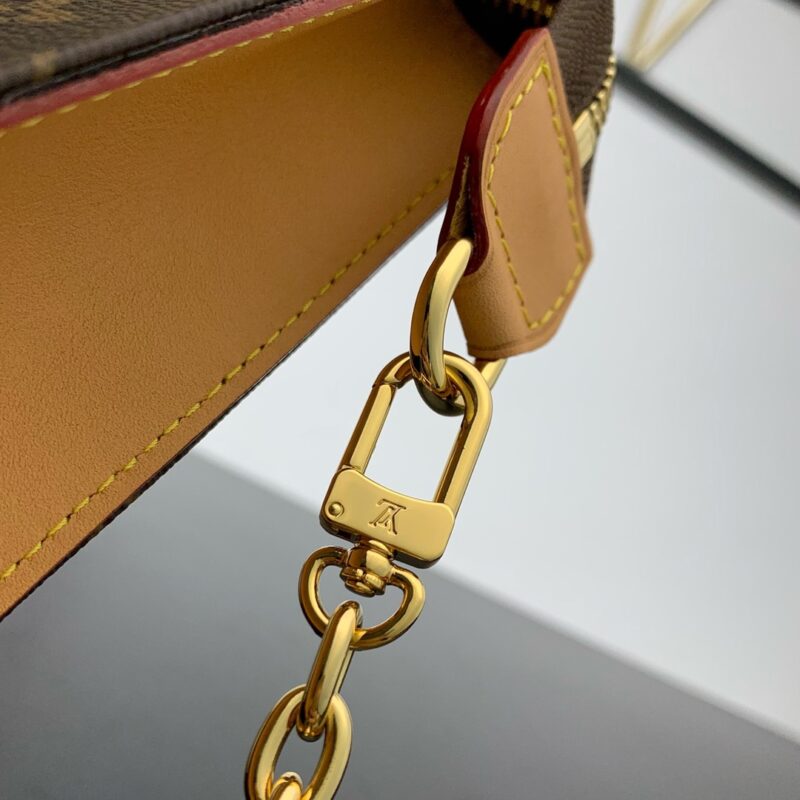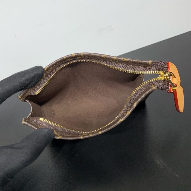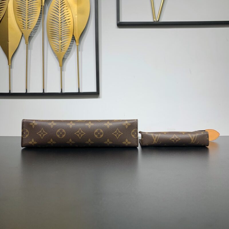 Style number: M81412 The Toiletry Pouch On Chain is based on the Monogram Toiletry Pouch that doubles as a clutch, created in 1901, and features leather trim and a detachable chain, making it ideal for hand and shoulder carry. The built-in small storage bag can be used alone. 25 x 20 x 5.5 cm (length x height x width)