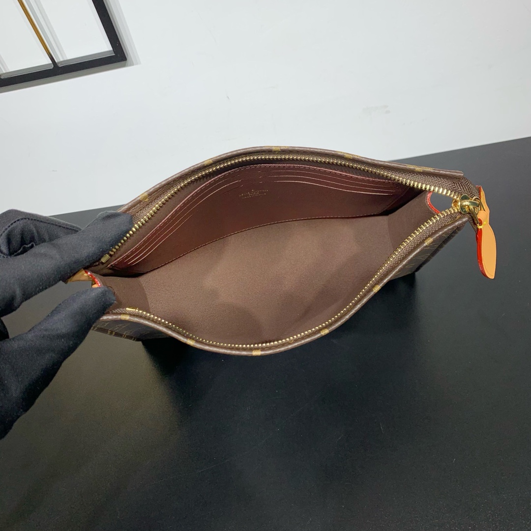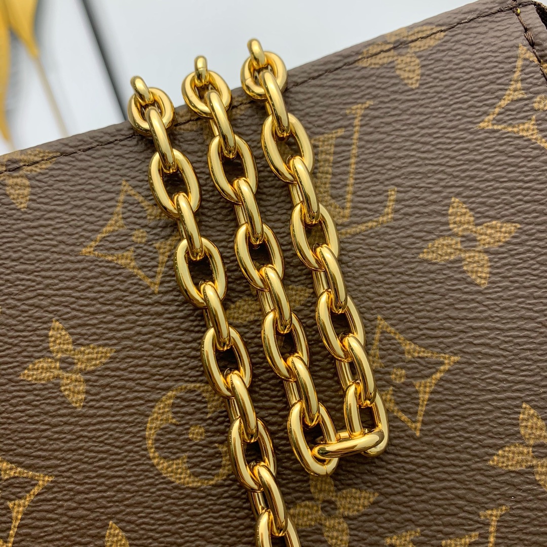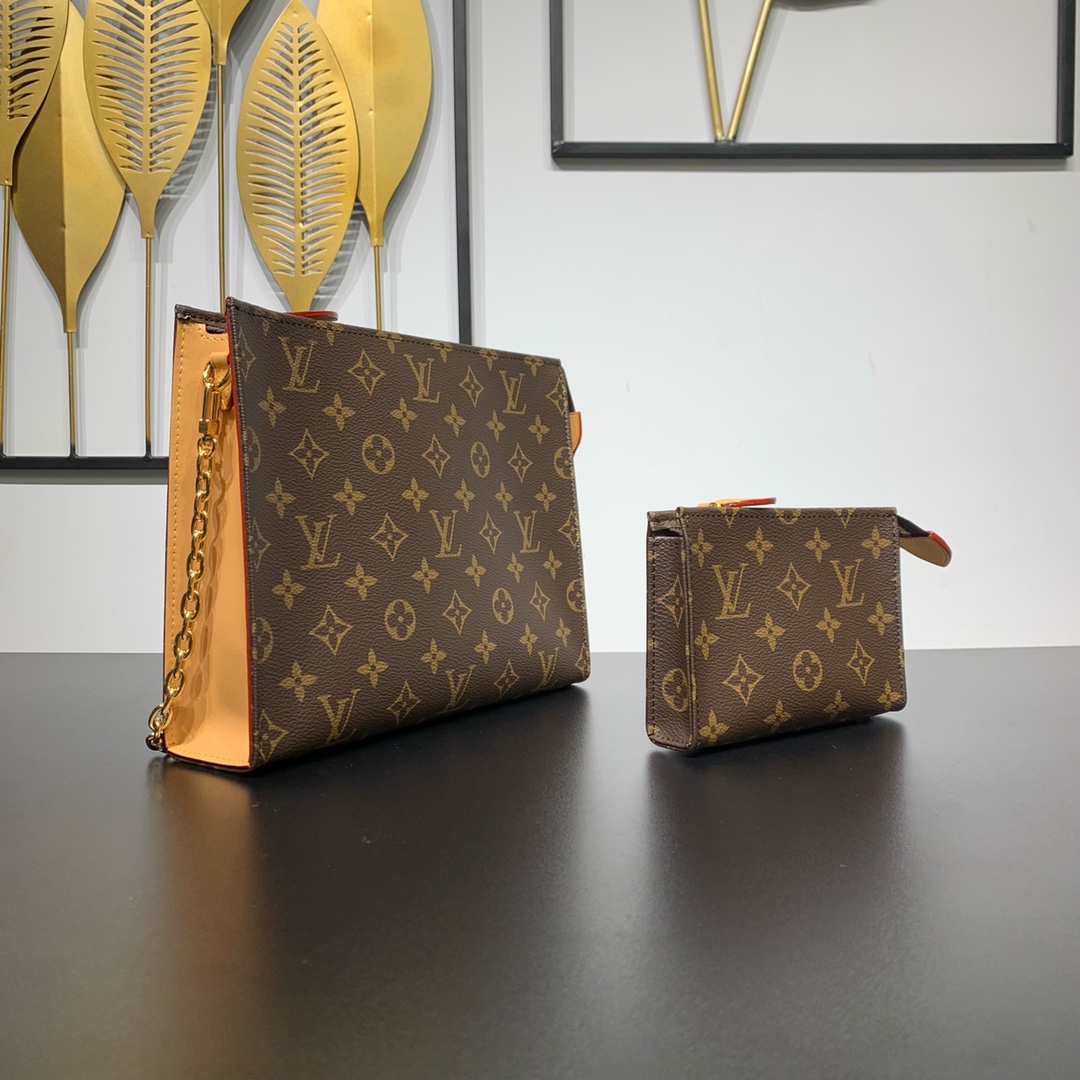 Style number: M81412 The Toiletry Pouch On Chain is based on the Monogram Toiletry Pouch that doubles as a clutch, created in 1901, and features leather trim and a detachable chain, making it ideal for hand and shoulder carry. The built-in small storage bag can be used alone. 25 x 20 x 5.5 cm (length x height x width)