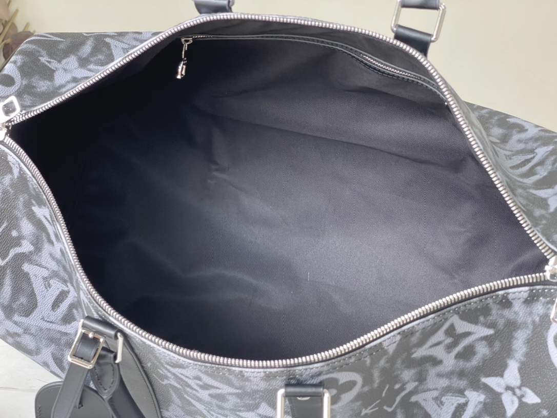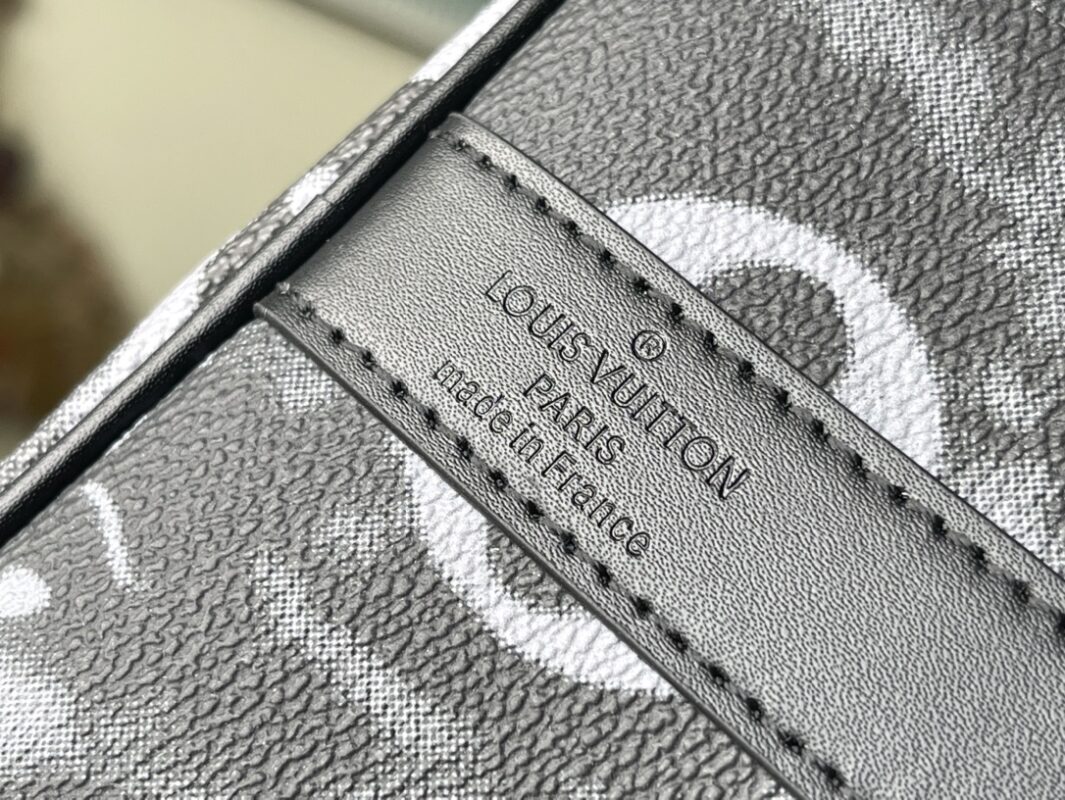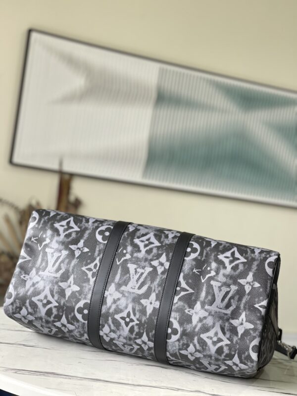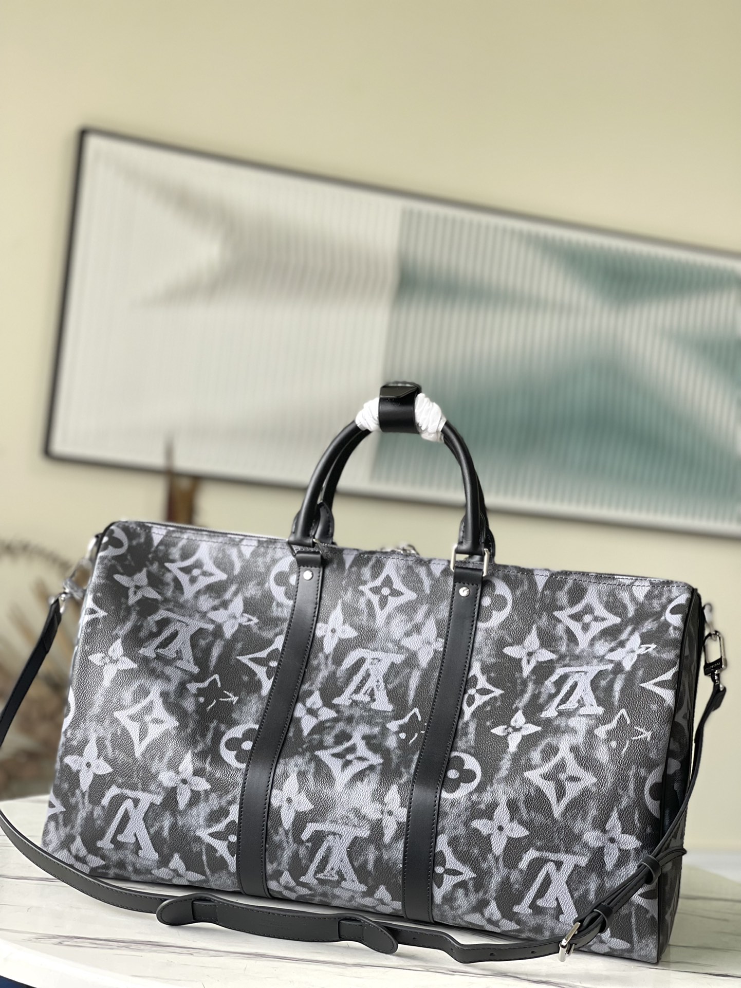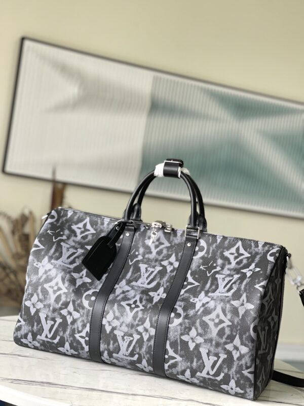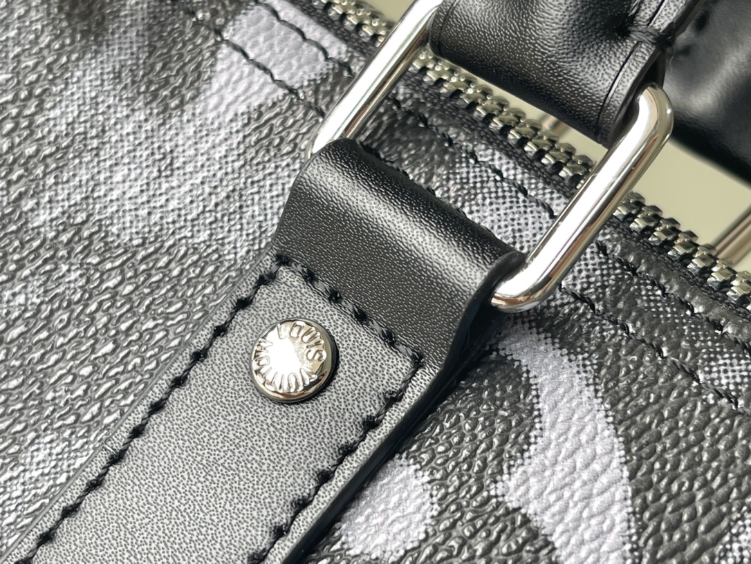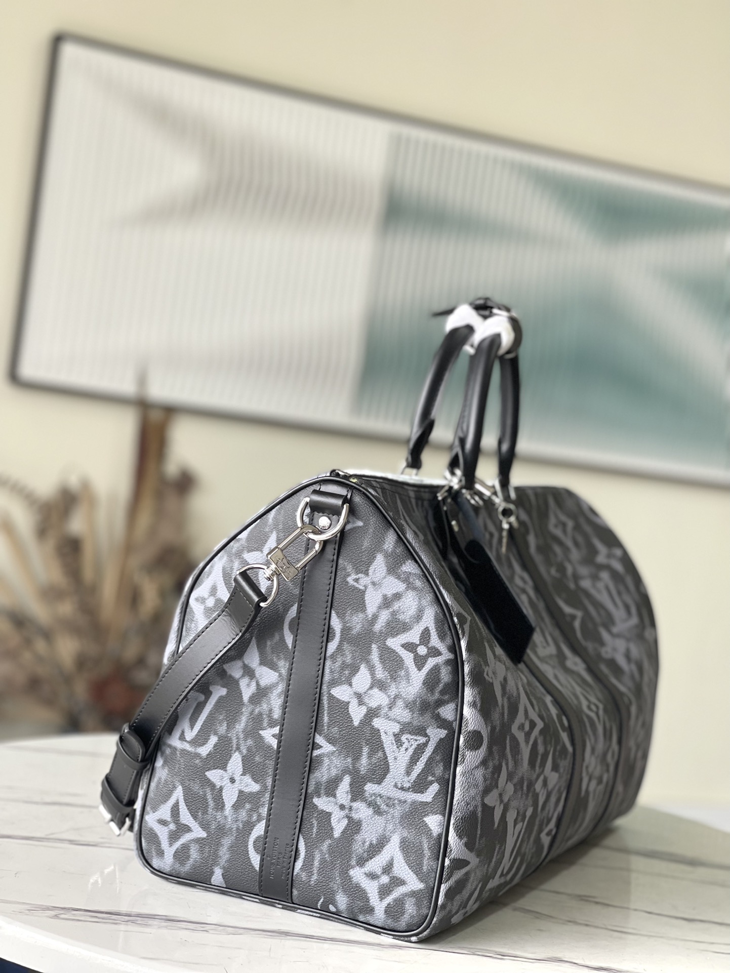 KEEPALL BANDOULIÈRE 50 travel bag This Keepall BANDOULIÈRE travel bag is made of Damier Salt canvas, treated with the distressing process used for denim in the ready-to-wear collection. Silk-screen printed travel bag, giving the large check a rough texture. There’s plenty of room for its name, perfect for weekend getaways or short trips. Detailed features 50 x 29 x 23 cm