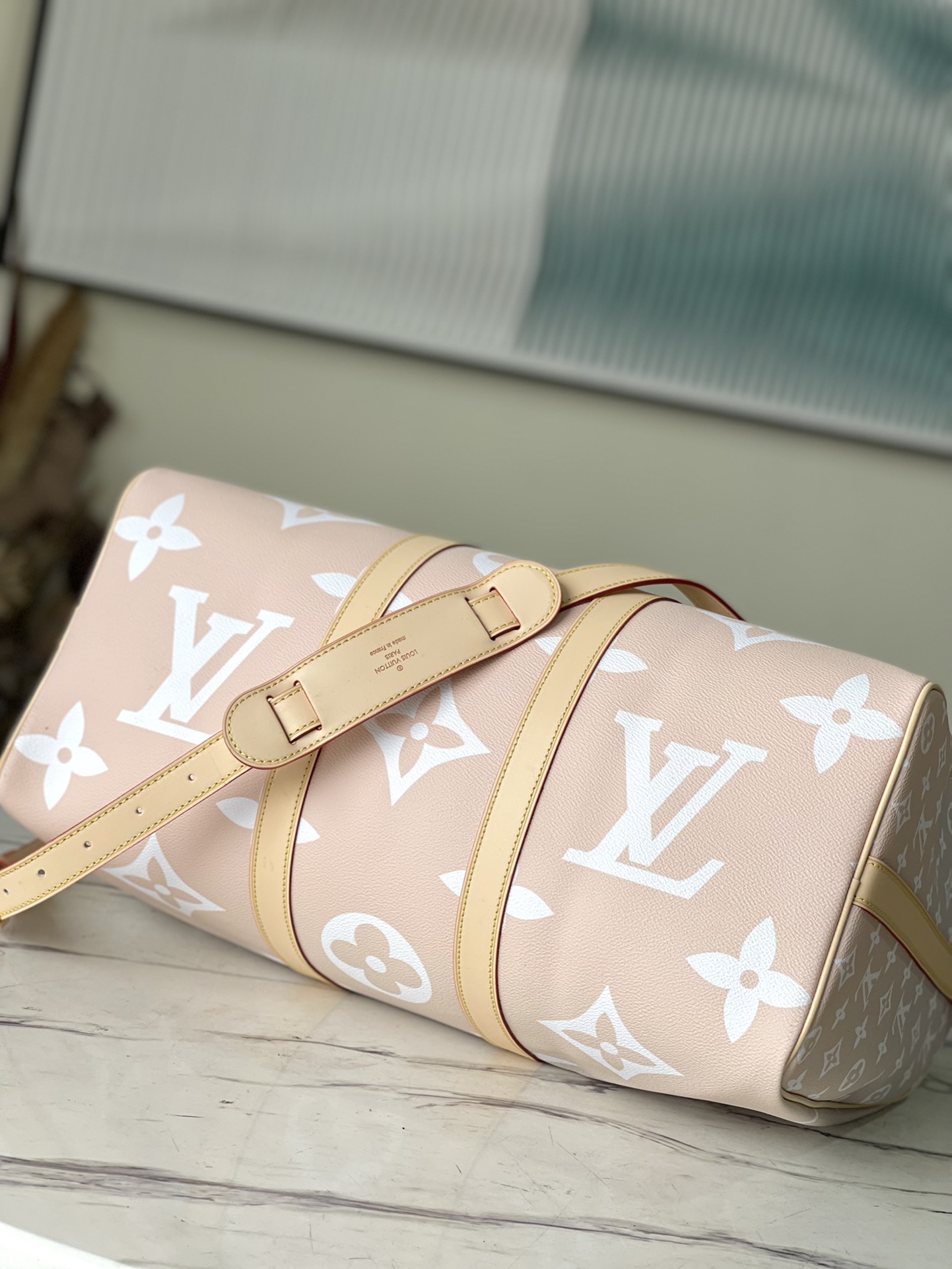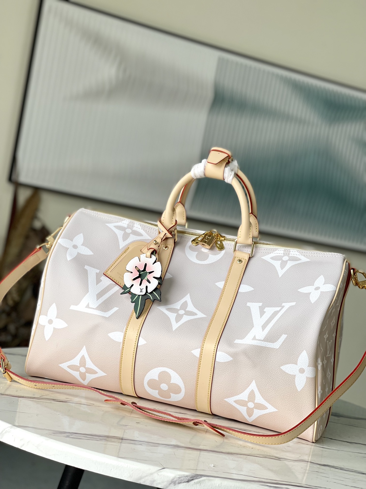 As one of the brand’s iconic travel bags, this Keepall Bandoulière 45 travel bag is made of gradient Monogram canvas, embellished with a large LV logo and Monogram floral pattern. This spacious tote features a detachable and adjustable shoulder strap and 2 top handles for comfortable carrying. Includes washable fabric lining. Dimensions: 45 x 27 x 20 cm