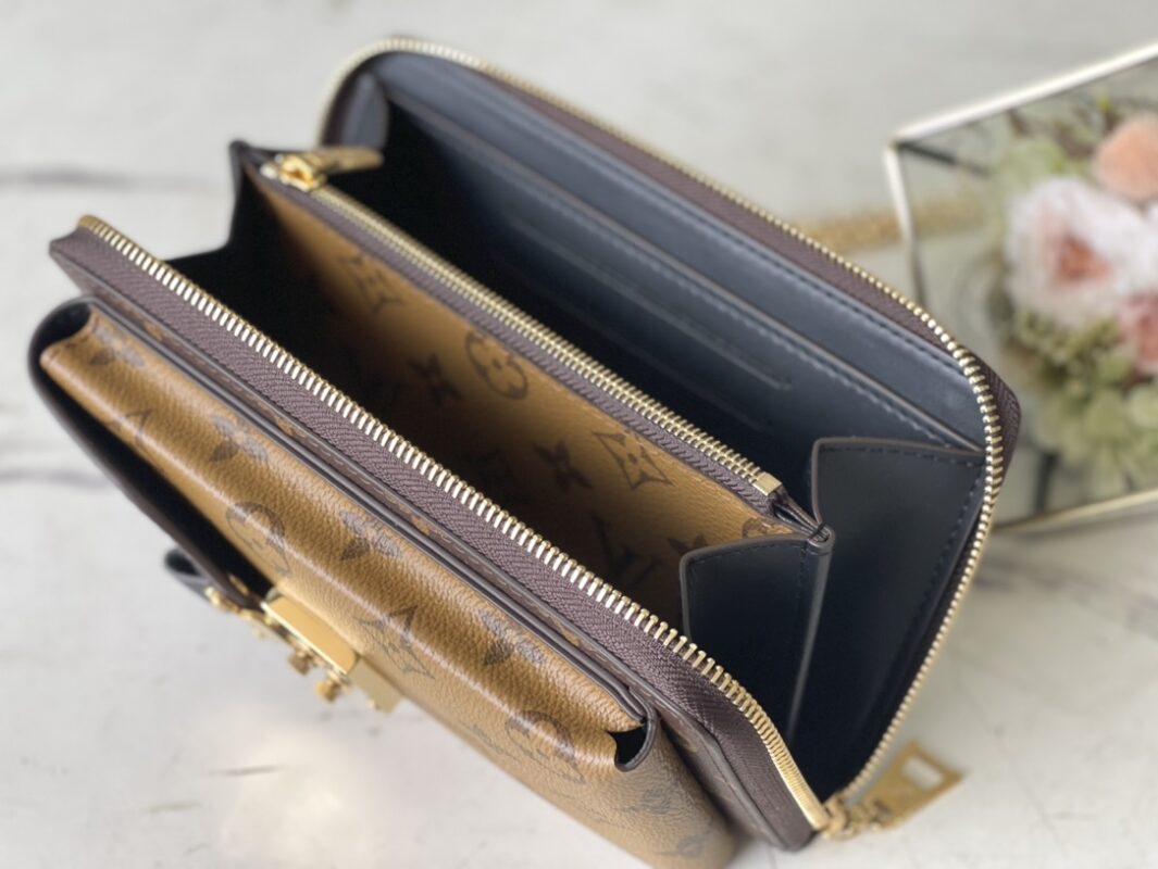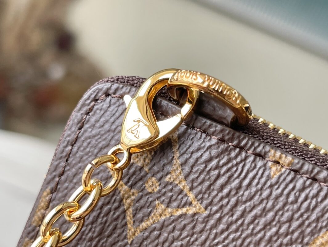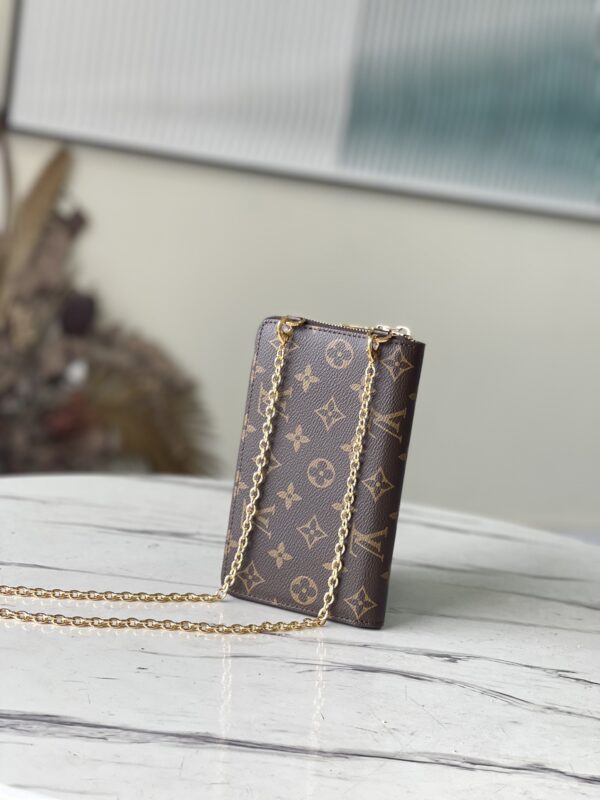 Yellow Flower Chain Phone Bag Chain Bag This Trunk Vertical Chain Bag reinterprets the design style of the Essential Trunk handbag in a vertical shape. Made of Monogram canvas and calfskin, it reproduces key details of the Louis Vuitton suitcase, including the reinforced corners, the S-lock closure and the Malletage pattern on the inner pocket. Comes with a detachable, adjustable shoulder strap. Dimensions: 11 x 19 x 3.5 cm.