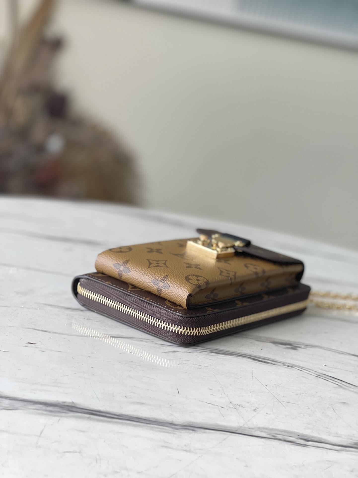Yellow Flower Chain Phone Bag Chain Bag This Trunk Vertical Chain Bag reinterprets the design style of the Essential Trunk handbag in a vertical shape. Made of Monogram canvas and calfskin, it reproduces key details of the Louis Vuitton suitcase, including the reinforced corners, the S-lock closure and the Malletage pattern on the inner pocket. Comes with a detachable, adjustable shoulder strap. Dimensions: 11 x 19 x 3.5 cm.