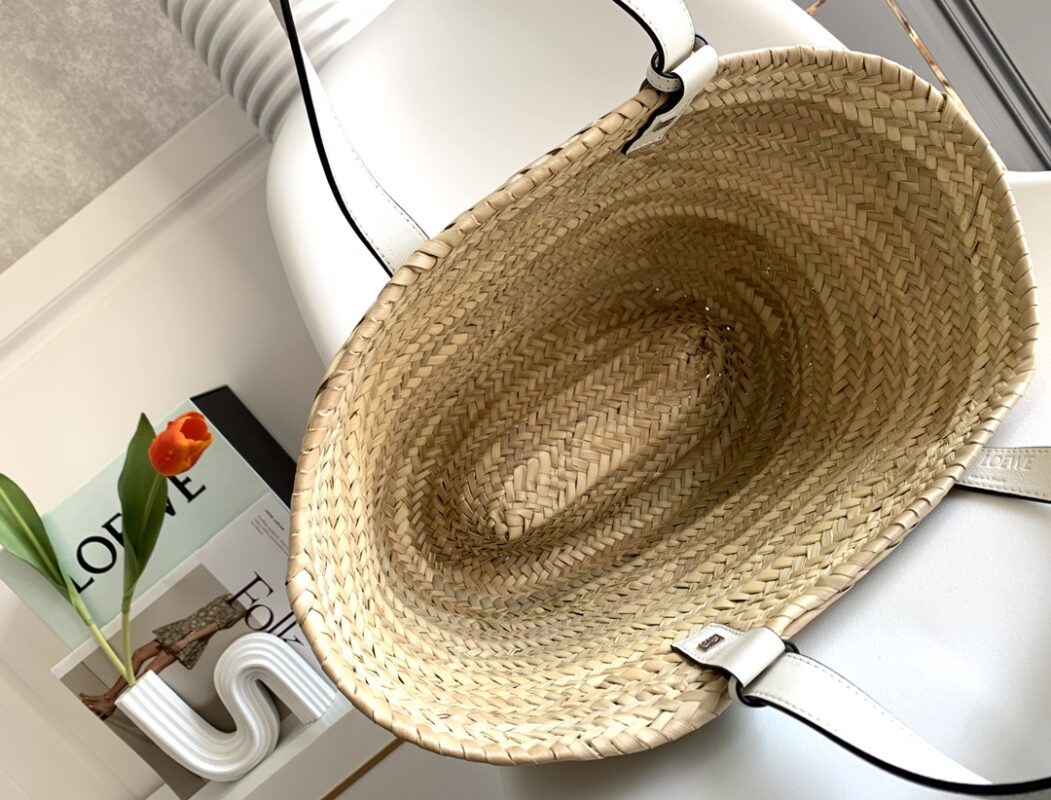 Loe*we🔥Straw Vegetable Basket Medium [Celebration] Authentic Malaysian 🇲🇾Palm leaves are hot to crazy straw bags, traditional bucket bags with classic hand-woven bags, and beautifully crafted calfskin handles. Can be carried on the shoulder or hand [Rose] Adjustable handle, Anagram three-dimensional embossed leather, due to handmade, each bag is unique, the size may be roughly different [Seduce] Approximate size of medium: 40*26.5*16cm (note: straw There is a little error in the package size)
