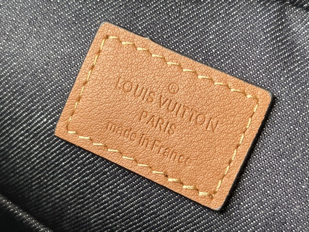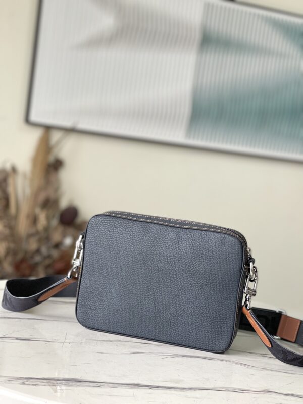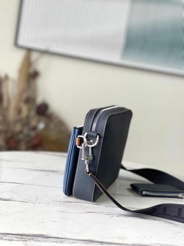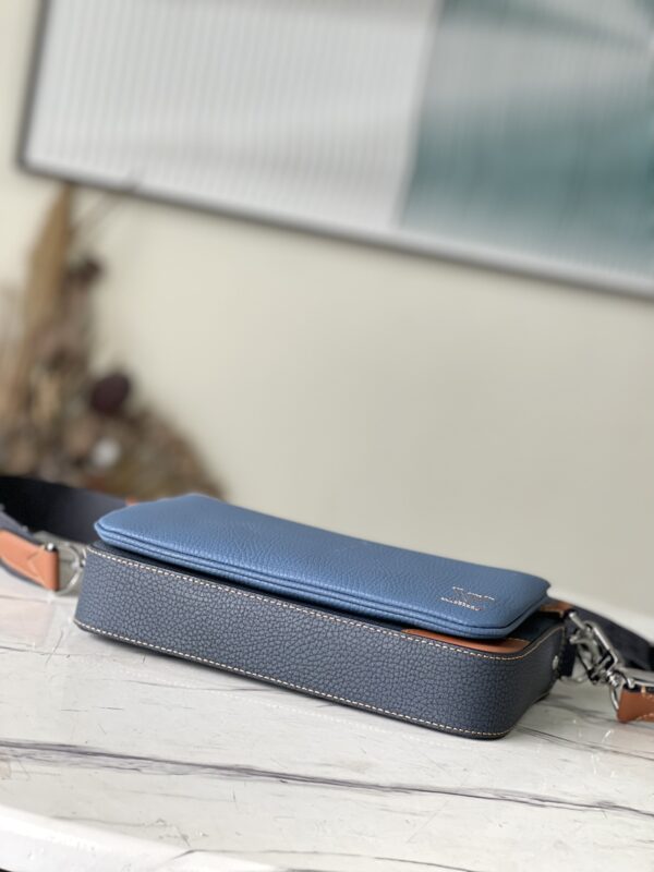 The Trio messenger bag renders Taurillon leather in a 1970s denim hue and integrates the leather into a removable shoulder strap. The zippered front pocket and coin purse can be removed for separate use. Dimensions: 25 x 18.5 x 7 cm