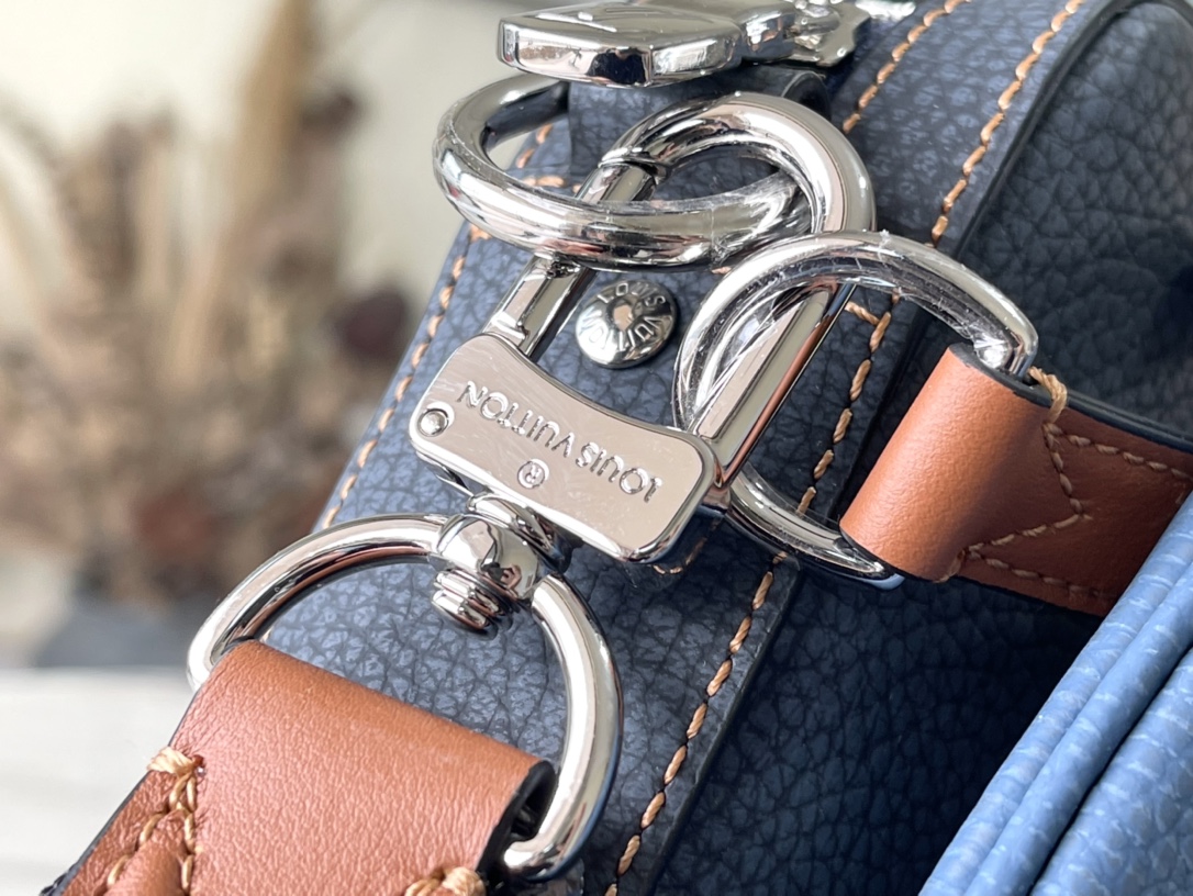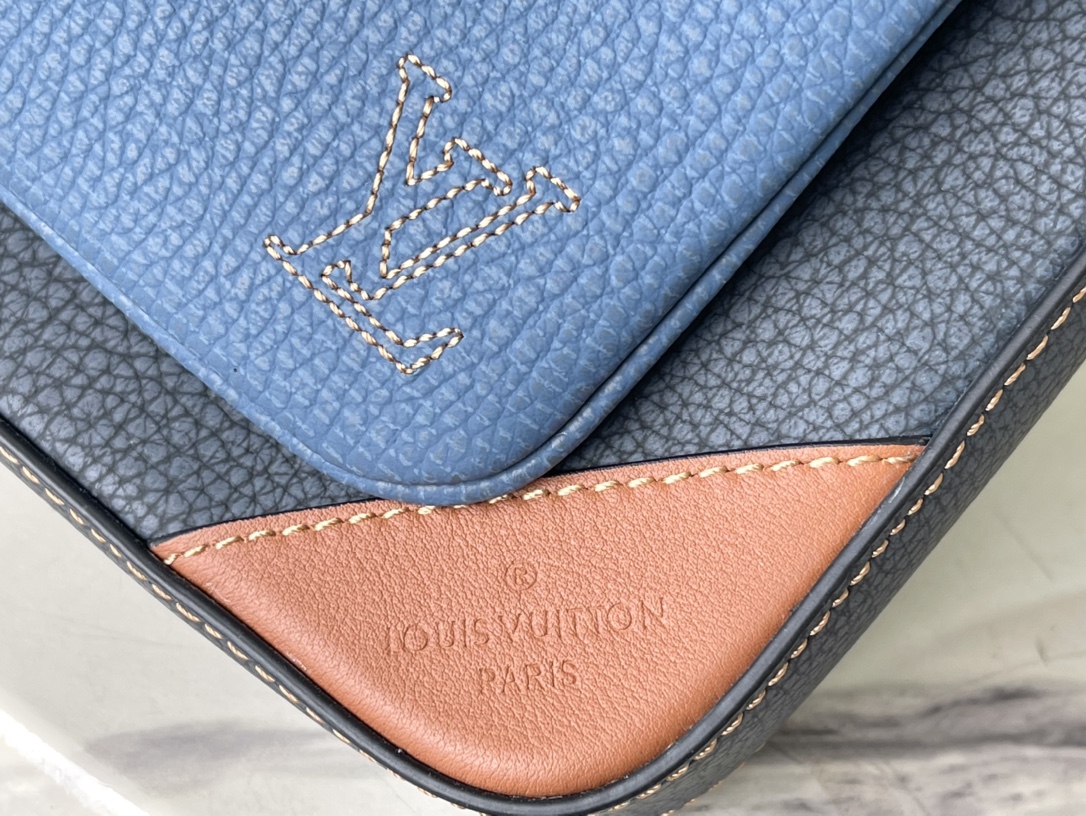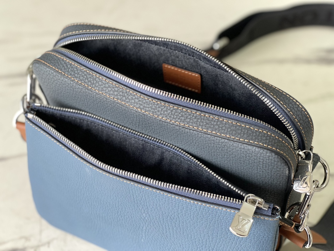 The Trio messenger bag renders Taurillon leather in a 1970s denim hue and integrates the leather into a removable shoulder strap. The zippered front pocket and coin purse can be removed for separate use. Dimensions: 25 x 18.5 x 7 cm