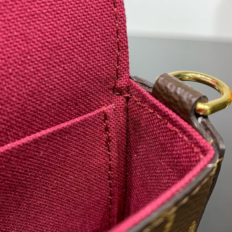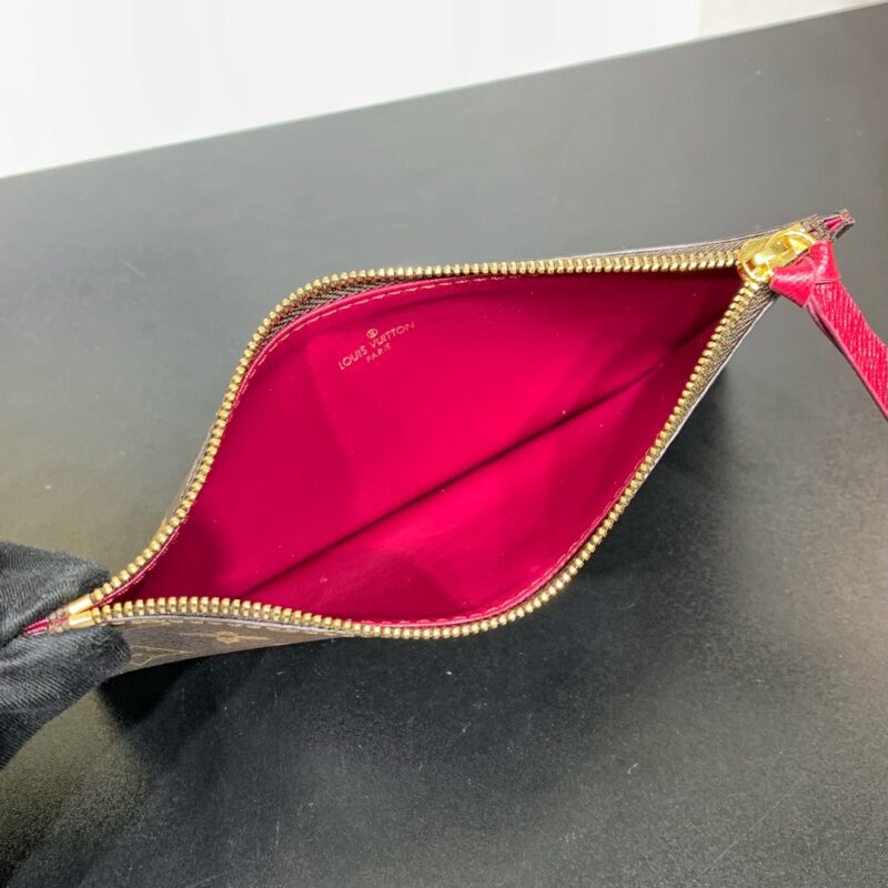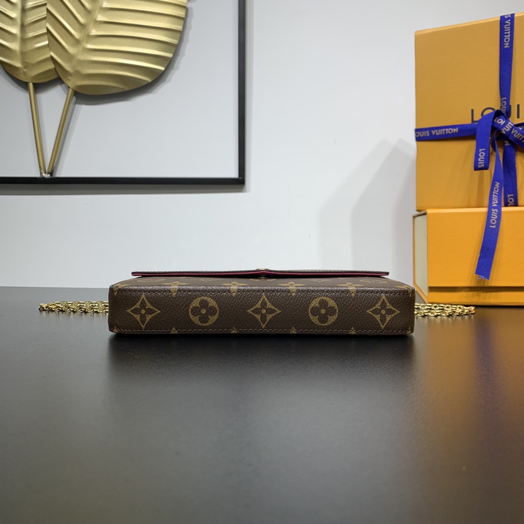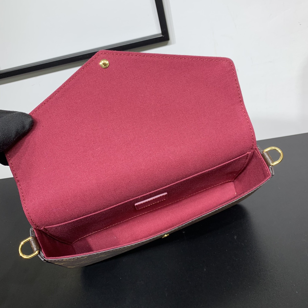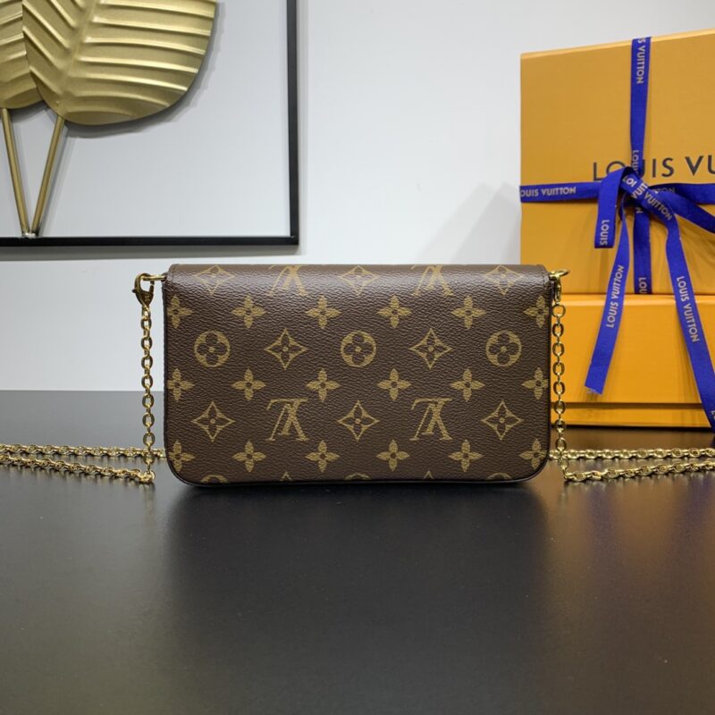 Elegant and compact, the Pochette Felicie features two detachable pockets, a stylish way to carry and organize your everyday essentials. More than just a wallet, it doubles as a charming clutch or small handbag when the gold-tone chain is removed. 21 x 11.5 x 3 cm (length x height x width)