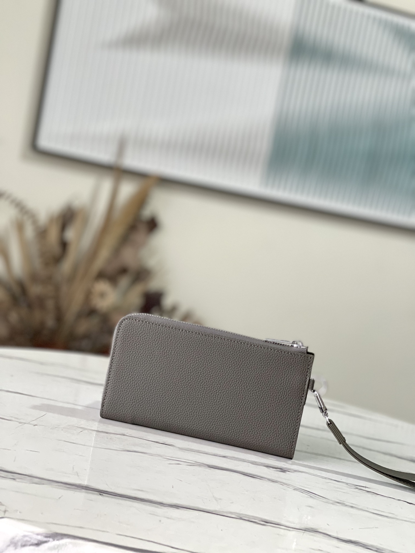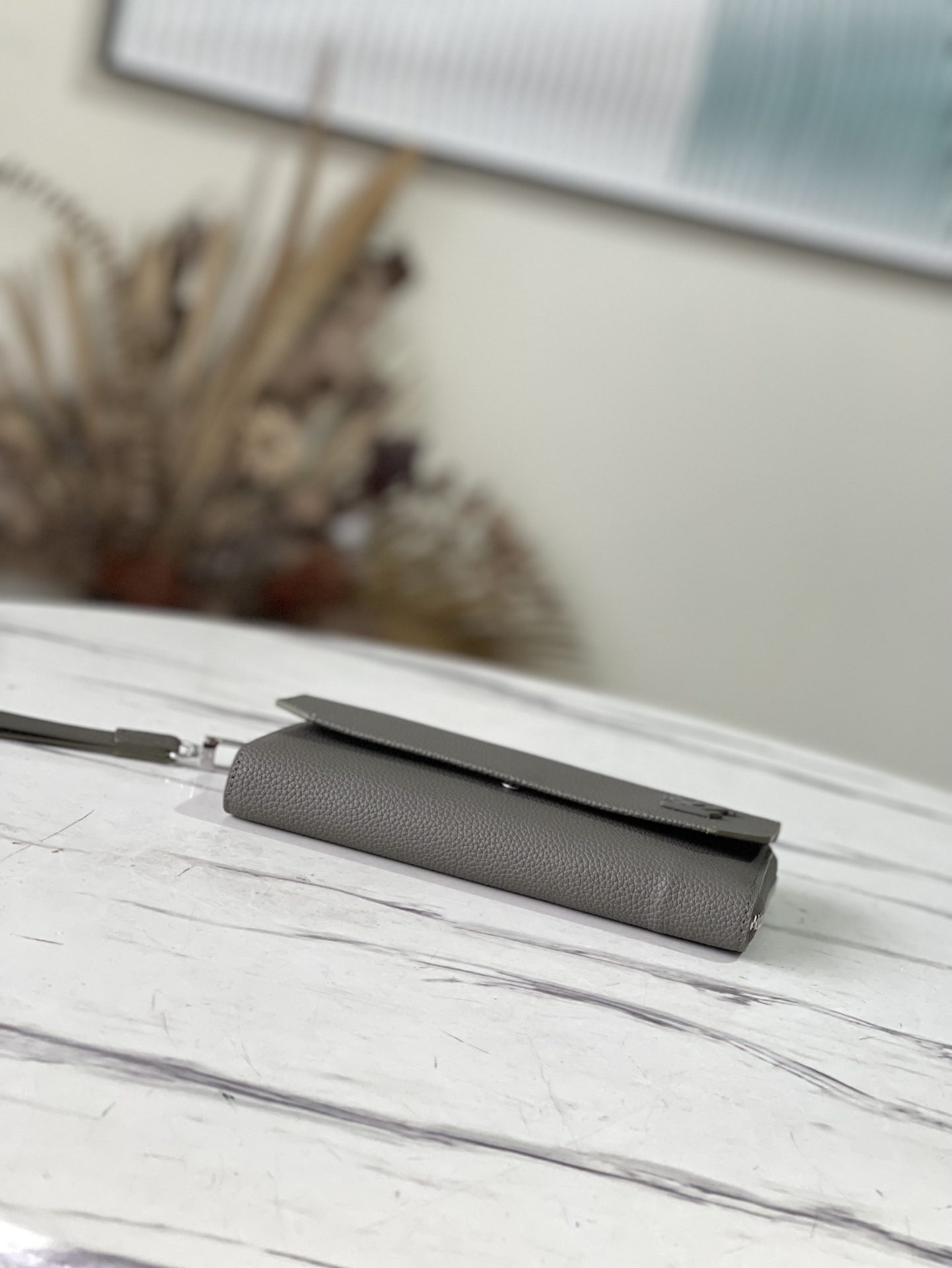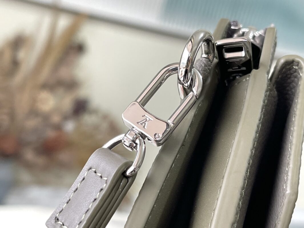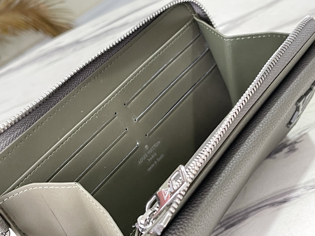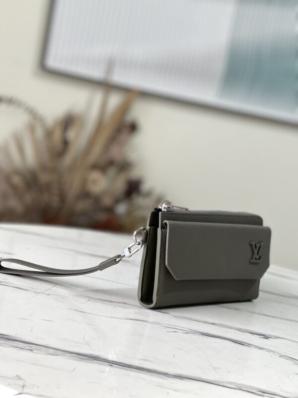 The new Aerogram Long Wallet in military green reinterprets a traditional men’s accessory with a contemporary minimalist design. Crafted in grained black calfskin as soft as the historic aerogram, adorned with an understated black metal LV logo, and comes with a practical strap detachable wrist strap. The wallet is roomy with an accordion-style main compartment, 12 credit card slots, and additional flap pockets to hold different items. Dimensions: 20x 11 x 2.5 cm