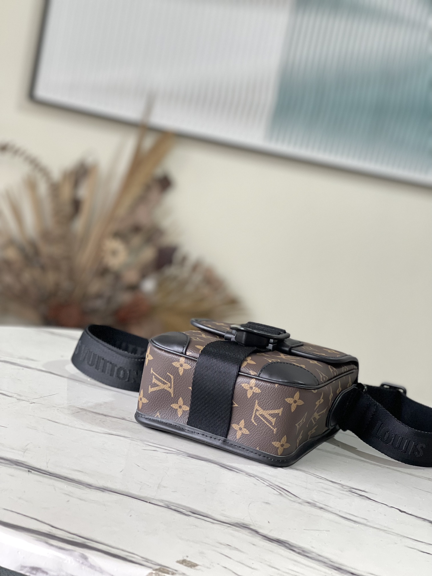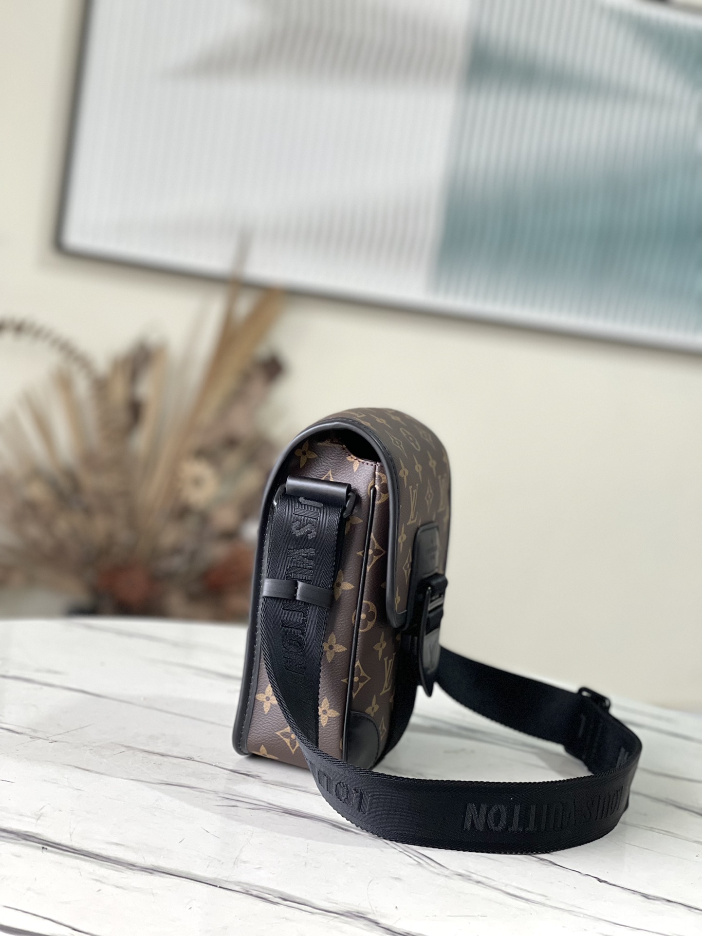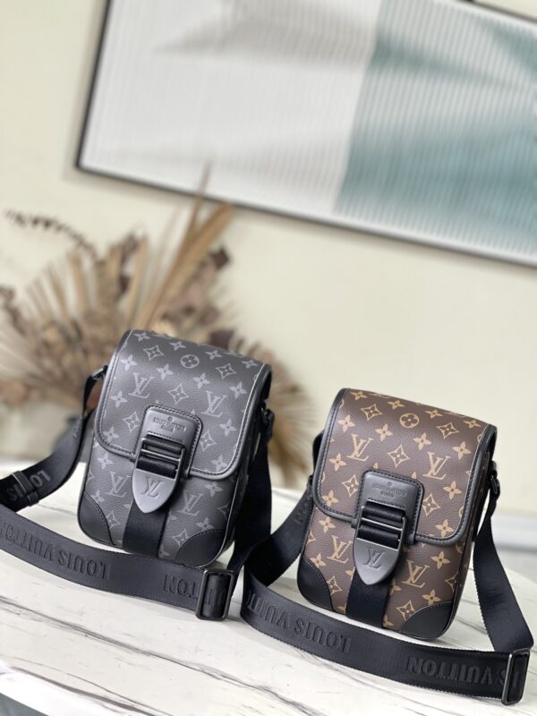 Presbyopia The Archy Small Messenger Bag is crafted in Monogram Macassar canvas with leather trim, accented with leather corners and trim. Logo-embellished detachable and adjustable jacquard shoulder strap. Monogram Macassar coated canvas-calf leather trim-fabric lining-metal hardware-magnet flap closure-zip back pocket-inner patch pocket-shoulder strap: non-detachable, adjustable. Dimensions: 16 x 22 x 7 cm