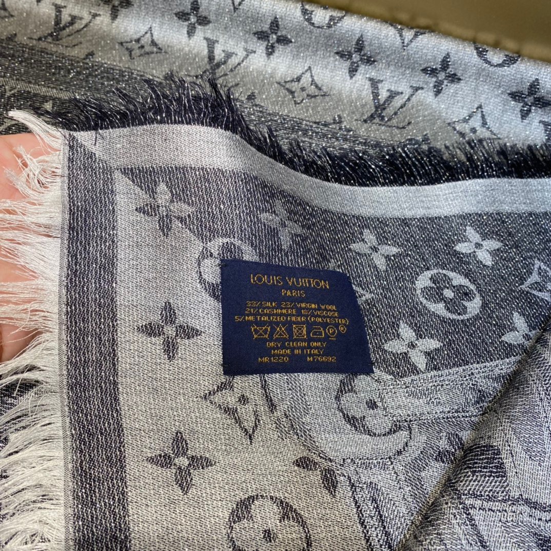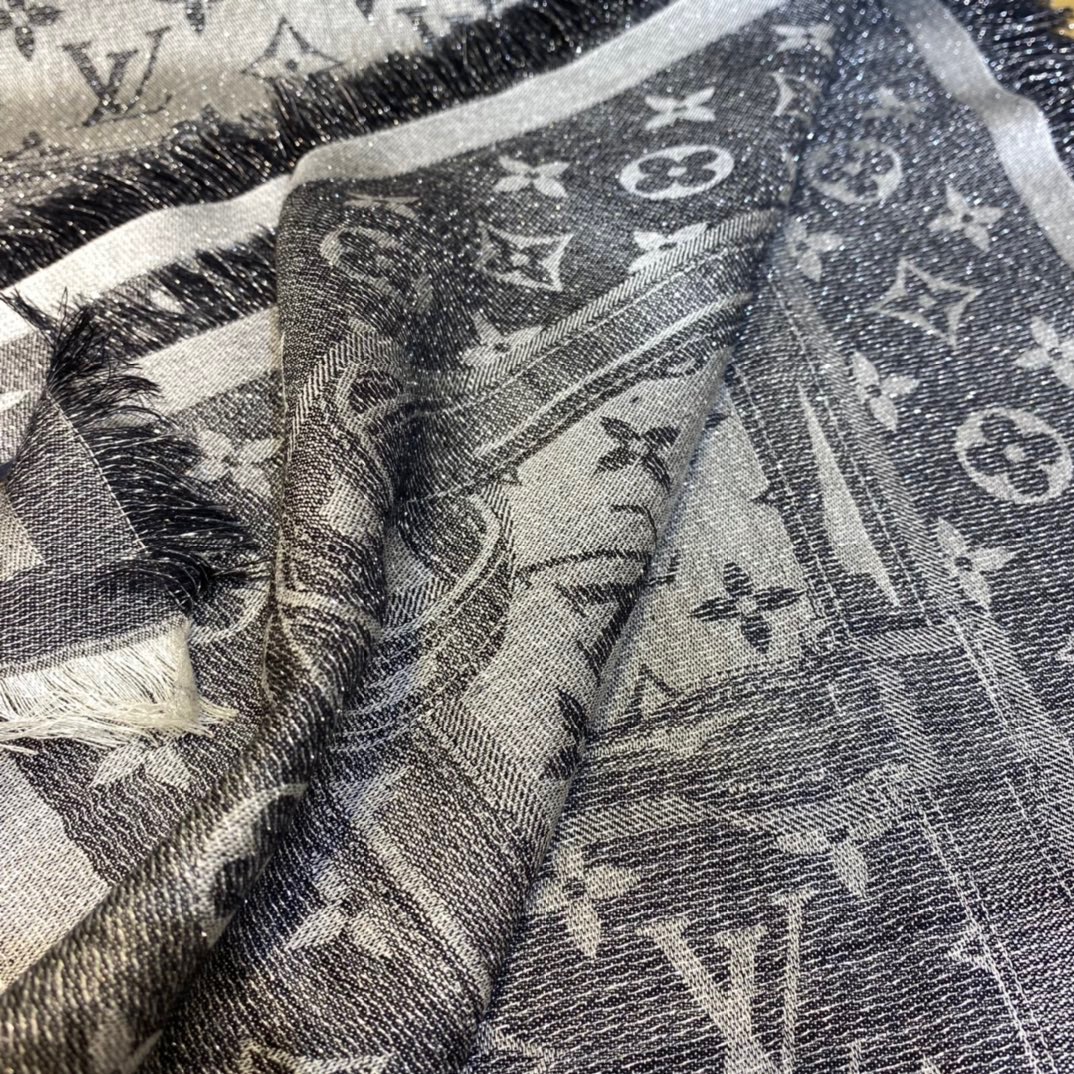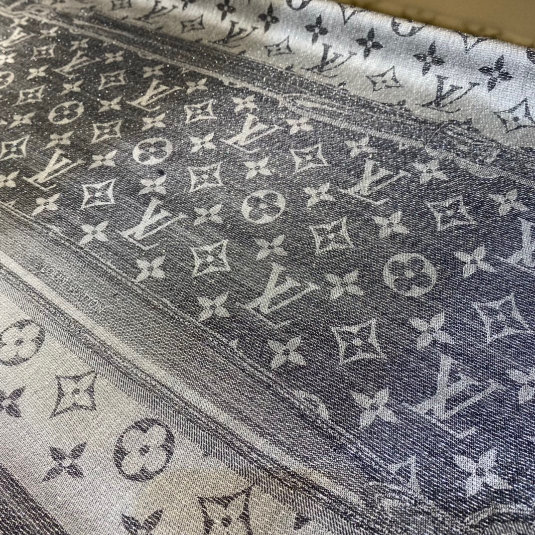 Louis Vuitton Belt Shine Square. 145*145cm. 33% Silk 23% Wool 21% Cashmere 18% Viscose 5% Lurex Metal Thread The Denim Confidential Monogram shawl is a blend of silk, wool, cashmere and reflective Lurex threads, featuring a full monogram jacquard weave in light and shade, a nod to the brand’s heritage while making a statement of modernity.