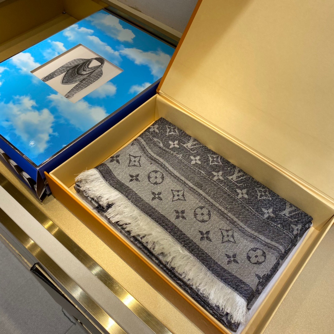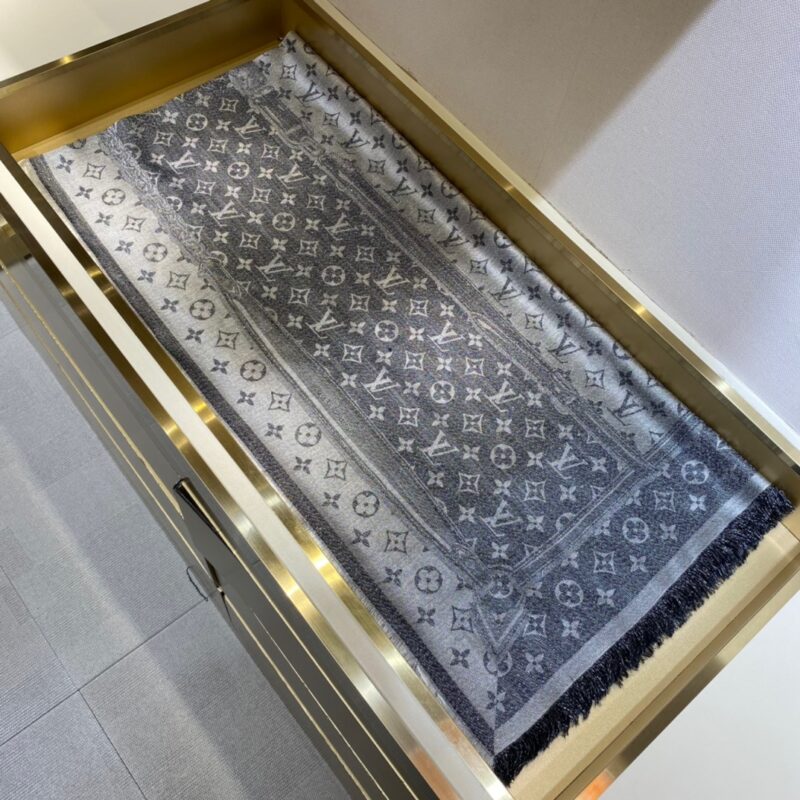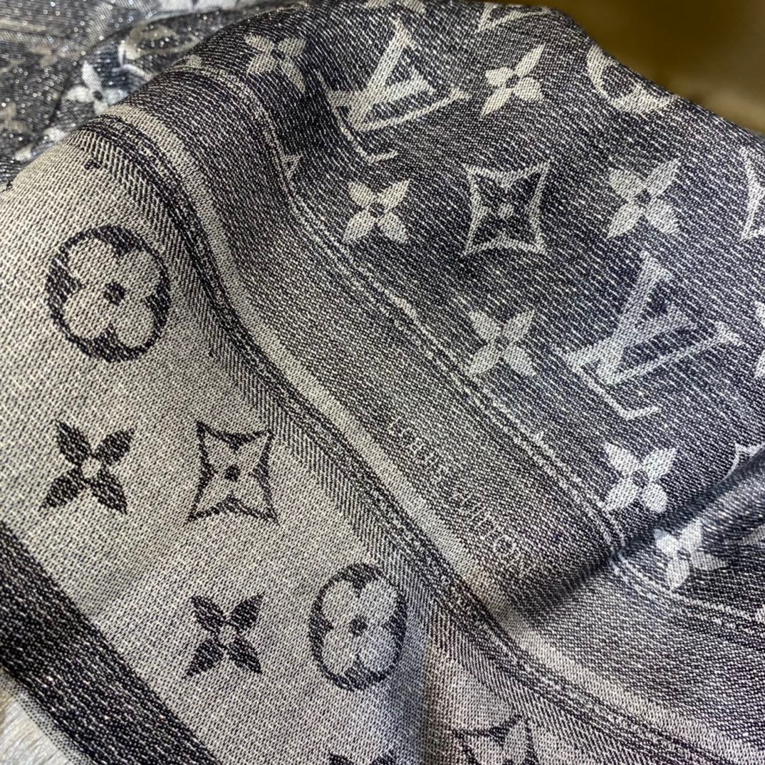Louis Vuitton Belt Shine Square. 145*145cm. 33% Silk 23% Wool 21% Cashmere 18% Viscose 5% Lurex Metal Thread The Denim Confidential Monogram shawl is a blend of silk, wool, cashmere and reflective Lurex threads, featuring a full monogram jacquard weave in light and shade, a nod to the brand’s heritage while making a statement of modernity.