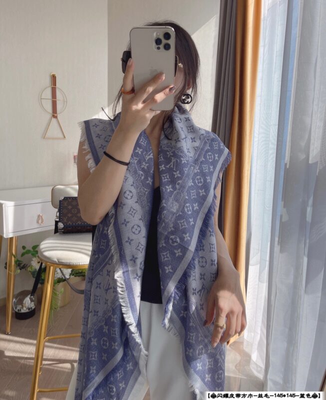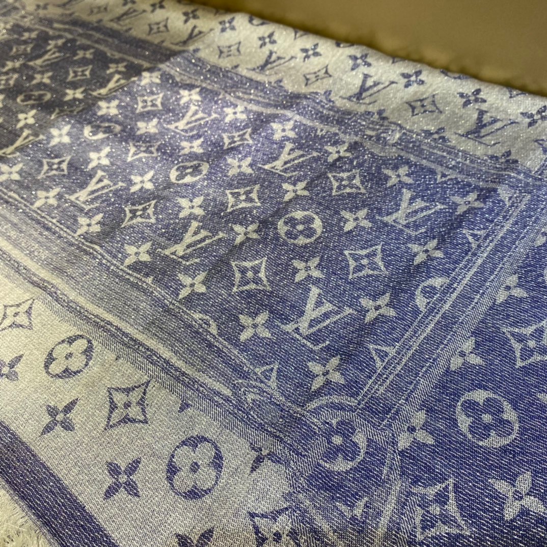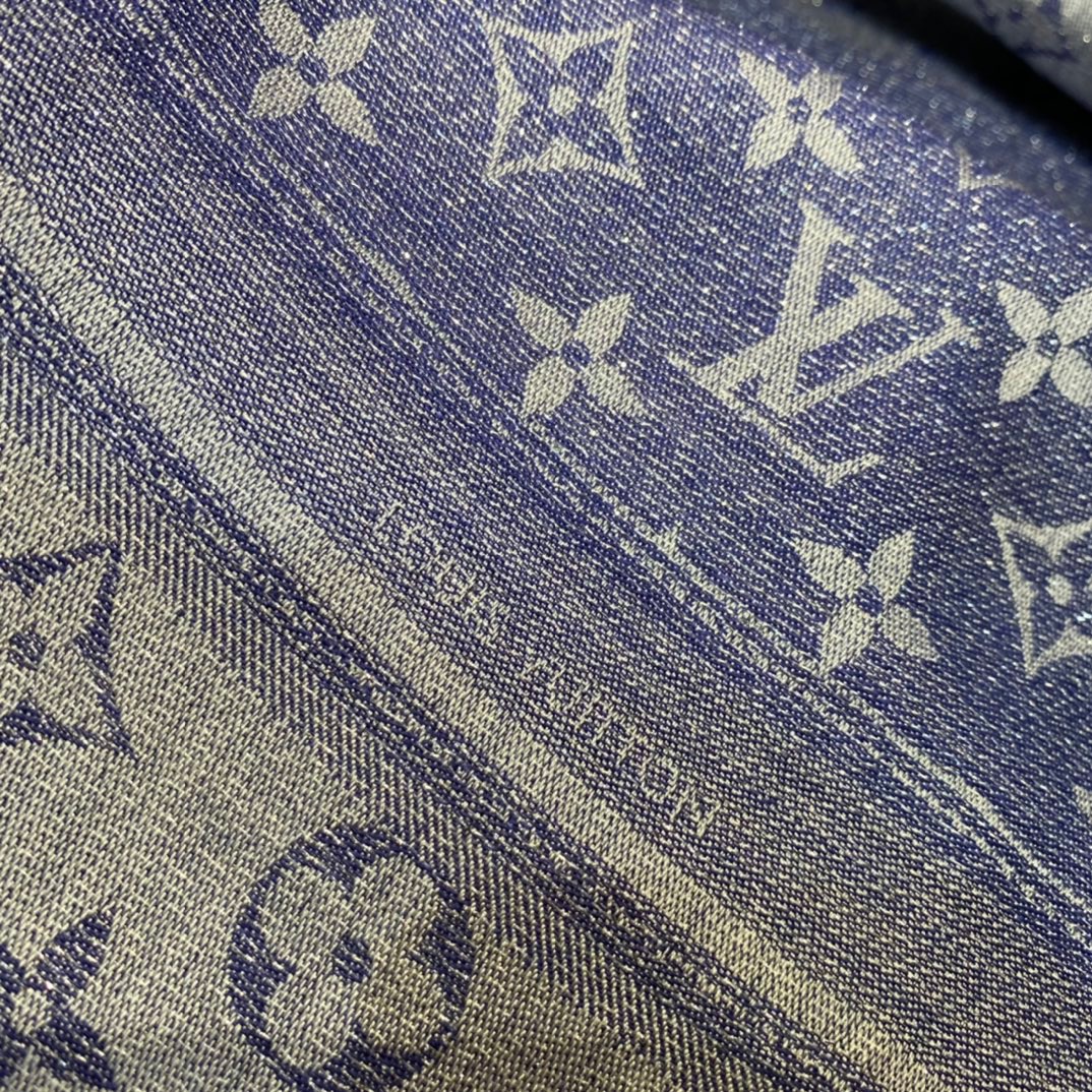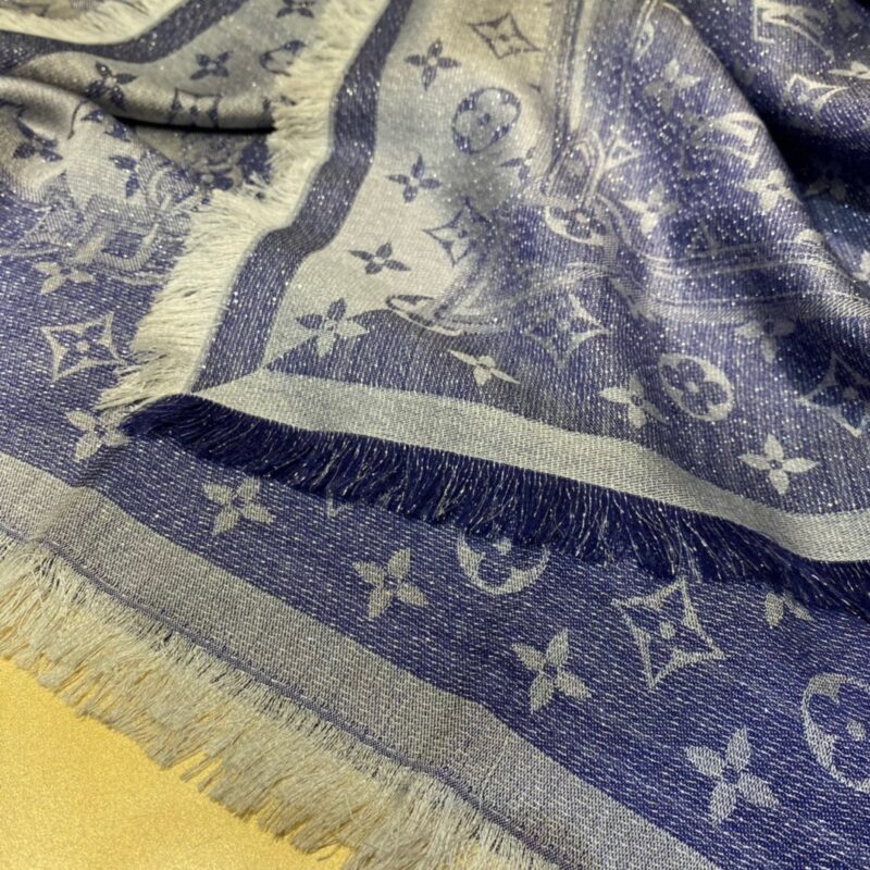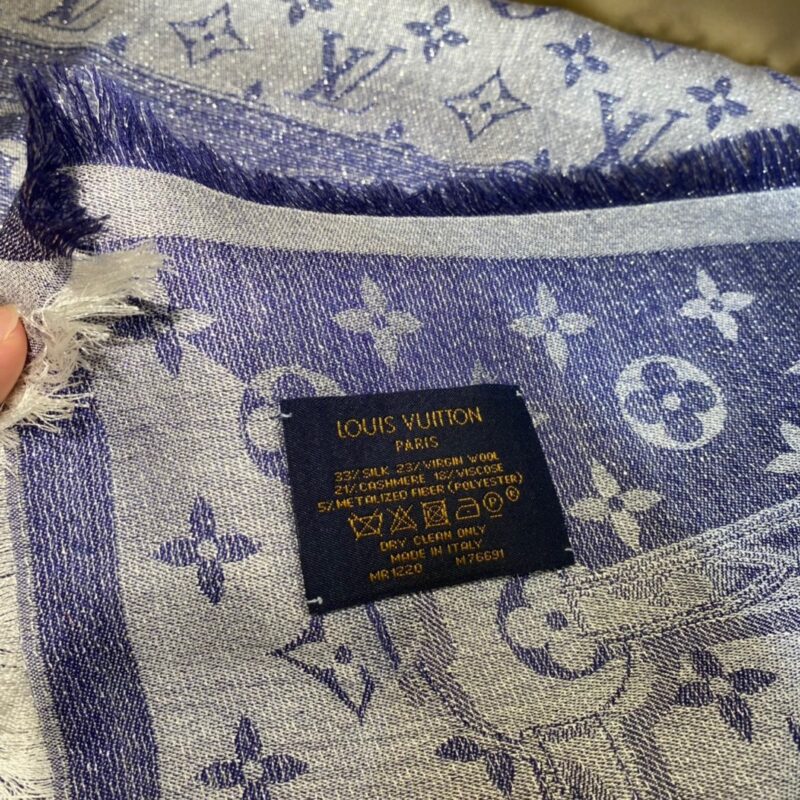Louis Vuitton Belt Shine Square. 145*145cm. 33% Silk 23% Wool 21% Cashmere 18% Viscose 5% Lurex Metal Thread The Denim Confidential Monogram shawl is a blend of silk, wool, cashmere and reflective Lurex threads, featuring a full Monogram jacquard weave in light and shade, a nod to the brand’s heritage while making a statement of modernity.