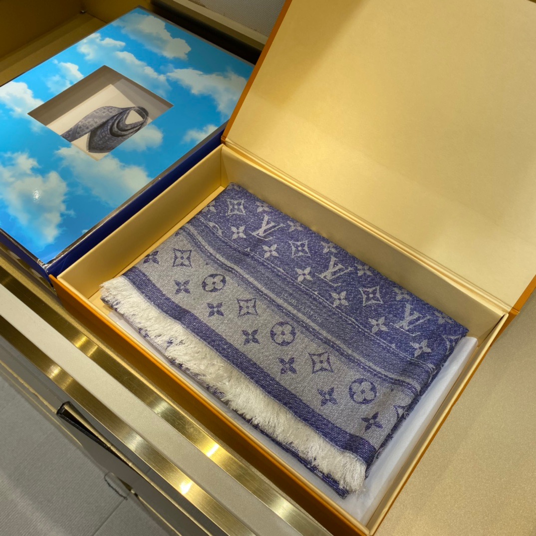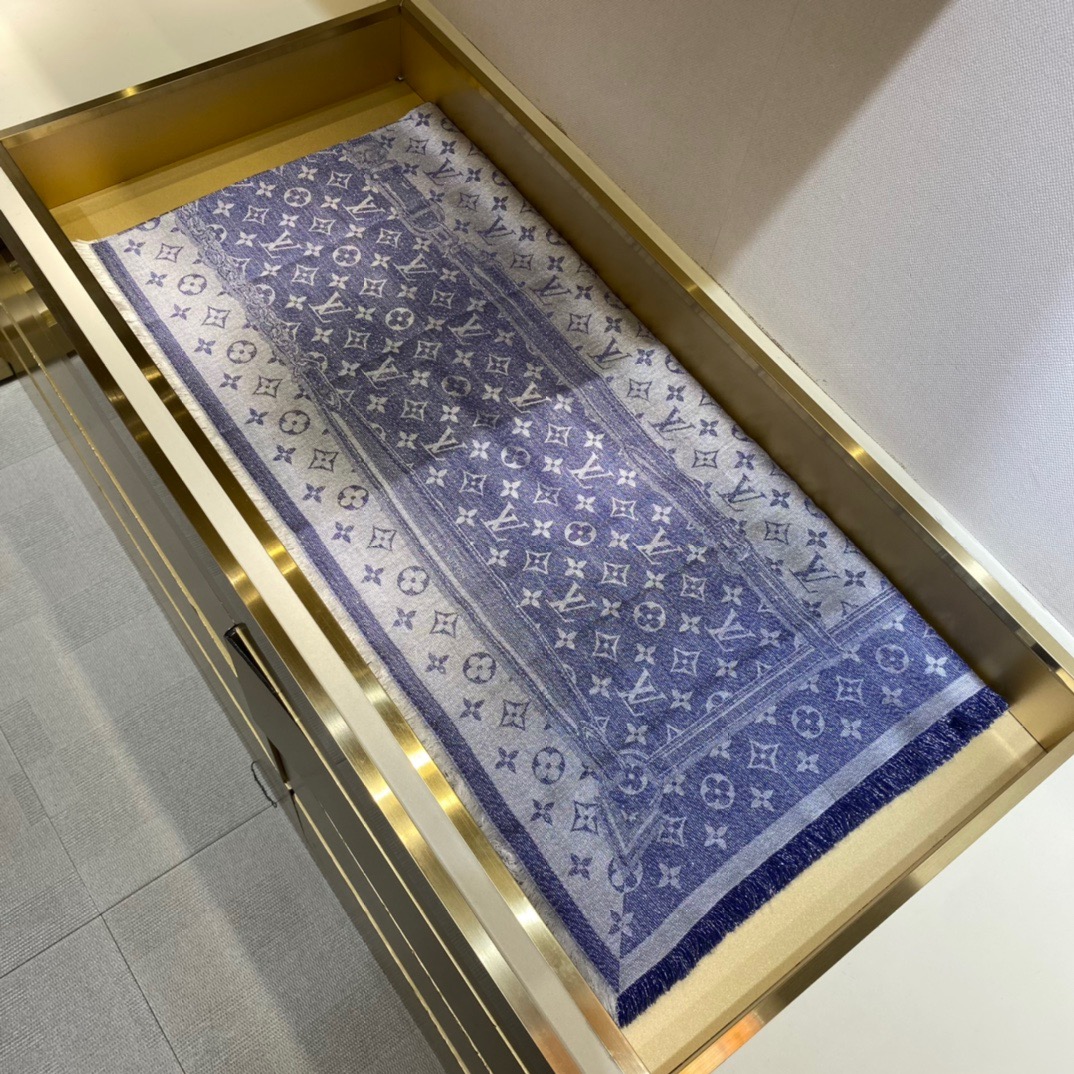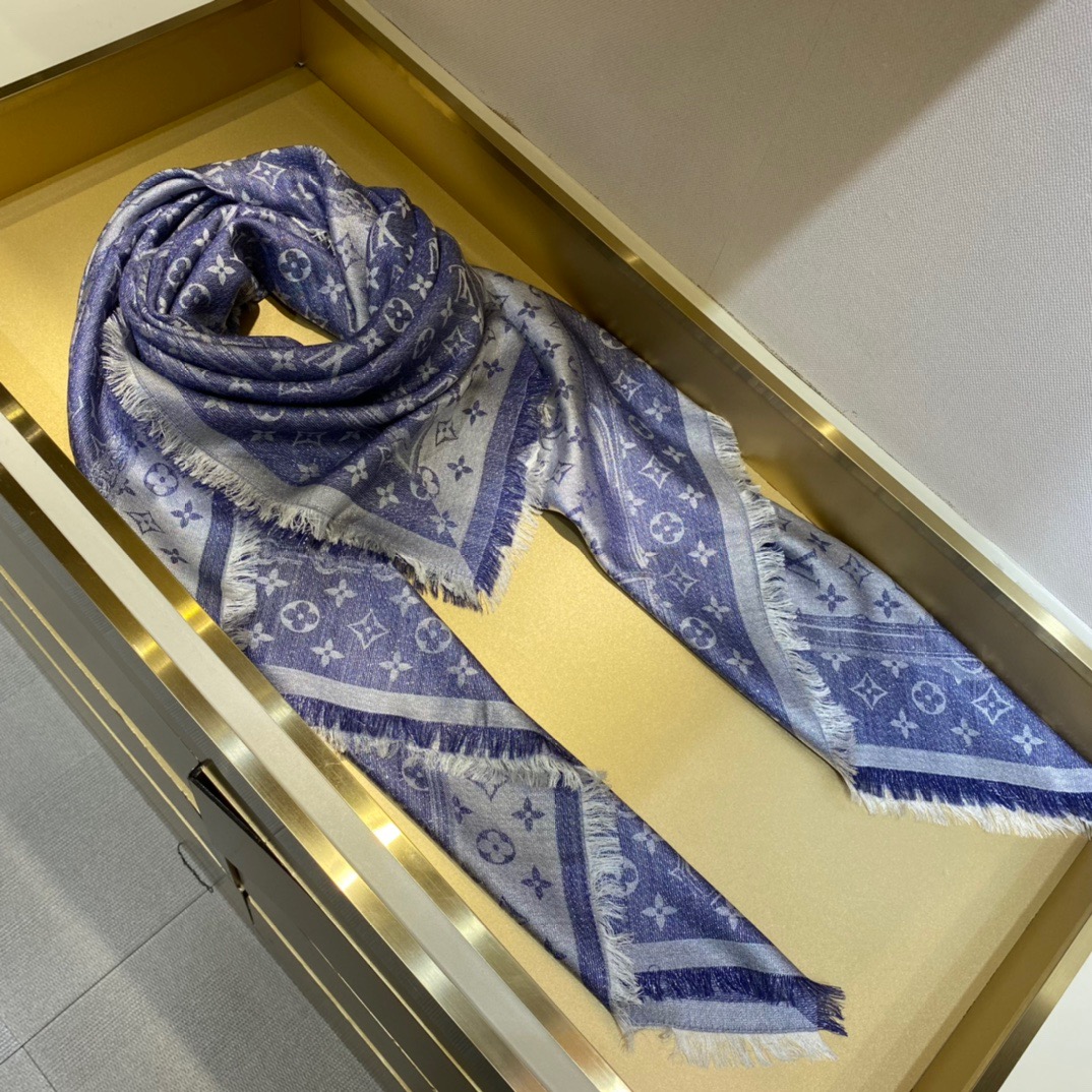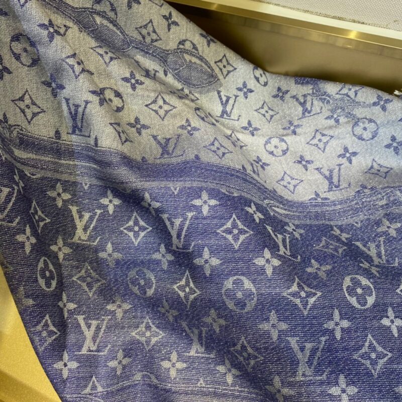 Louis Vuitton Belt Shine Square. 145*145cm. 33% Silk 23% Wool 21% Cashmere 18% Viscose 5% Lurex Metal Thread The Denim Confidential Monogram shawl is a blend of silk, wool, cashmere and reflective Lurex threads, featuring a full Monogram jacquard weave in light and shade, a nod to the brand’s heritage while making a statement of modernity.