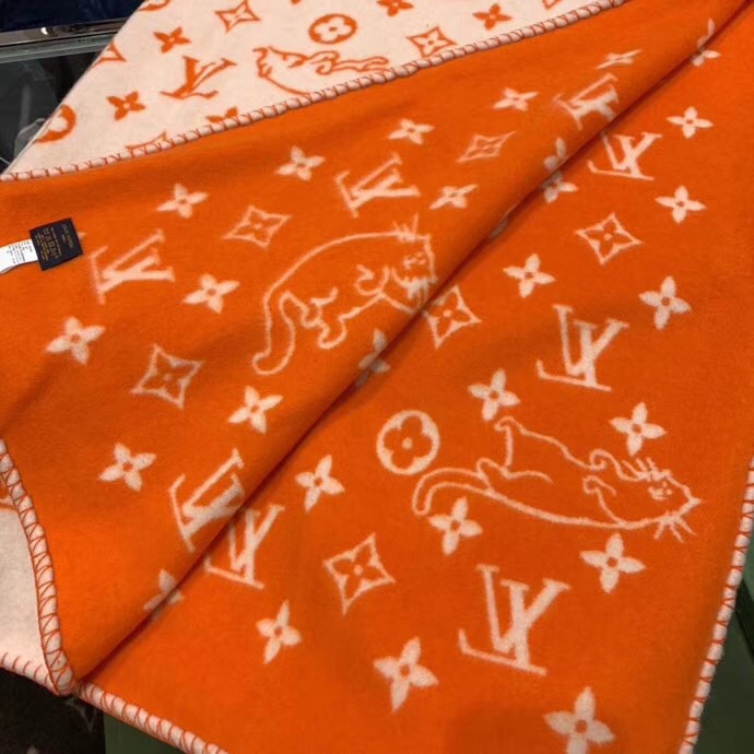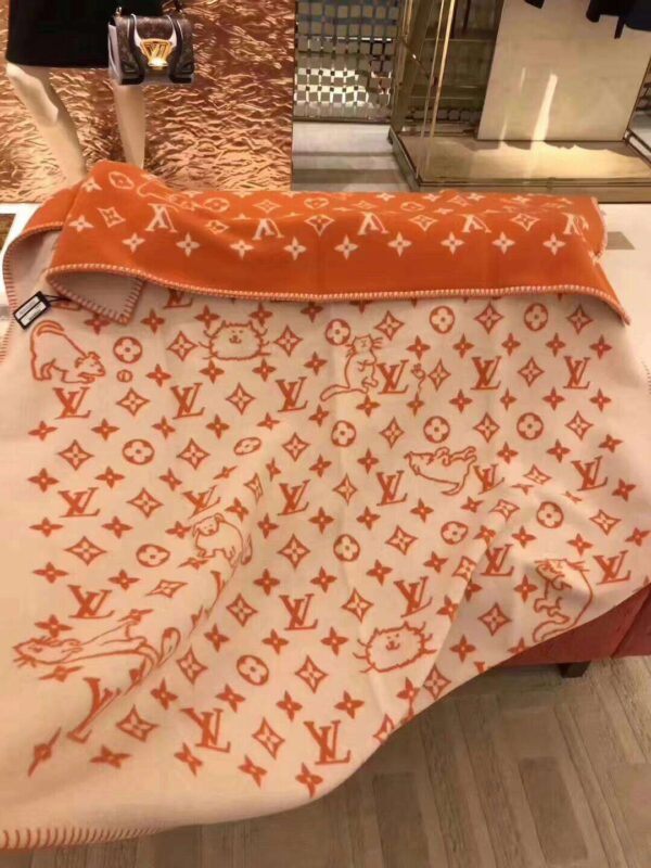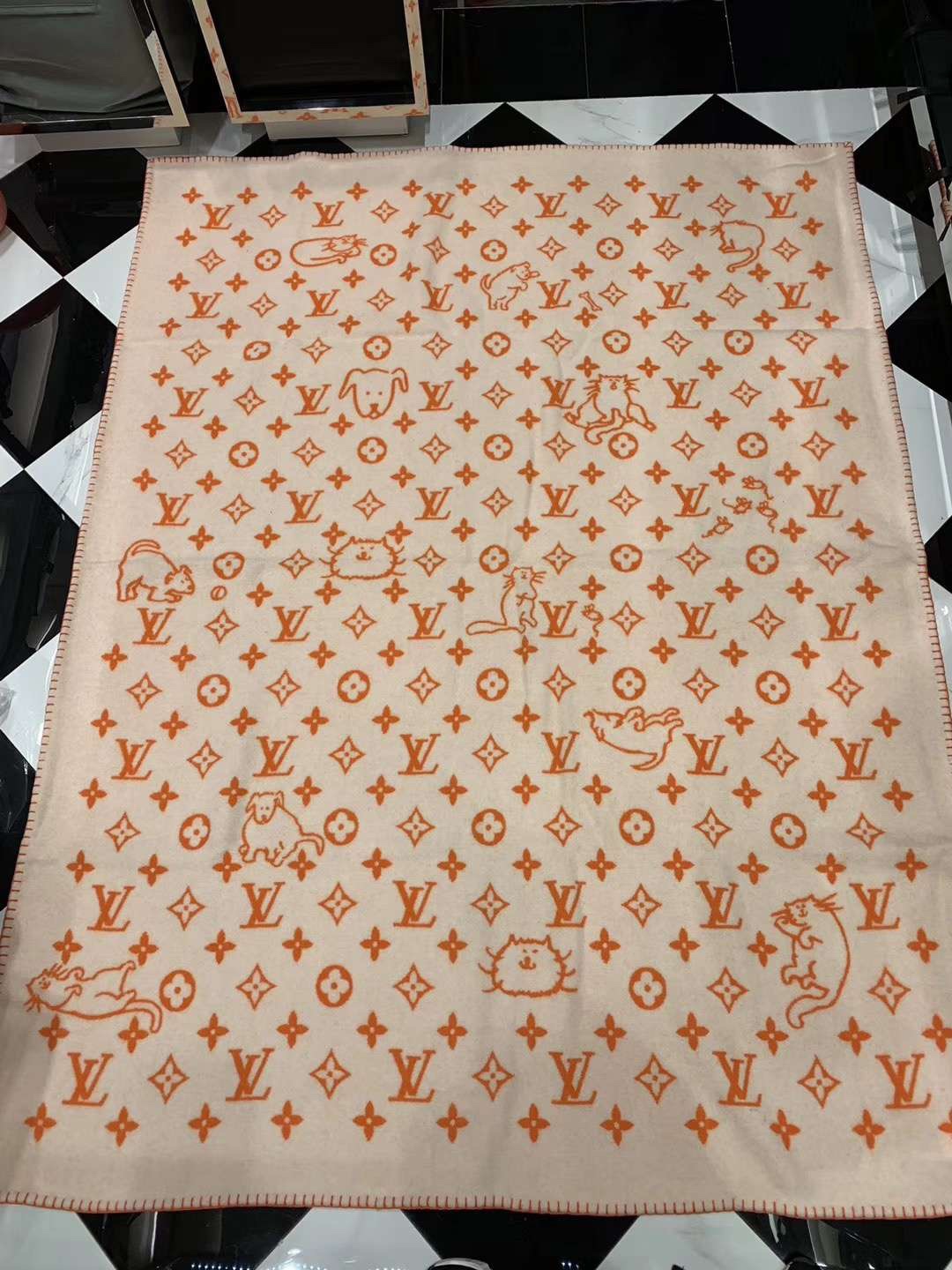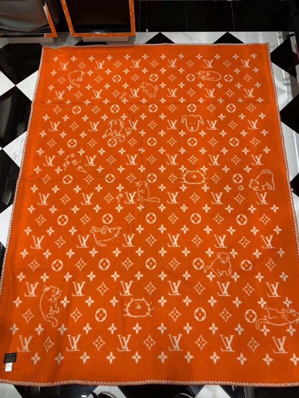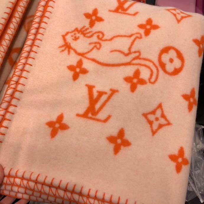LV blanket from early spring series classic Designed with a Catogram theme, combining the Louis Vuitton Monogram pattern with the two designers’ cat and dog pet patterns. Lively and fun. Made of luxurious wool and cashmere materials. Contrasting stitching is particularly eye-catching. Material: 50 lamb wool + 50 cashmere Size: 180x140cm Gram weight: 1250 grams