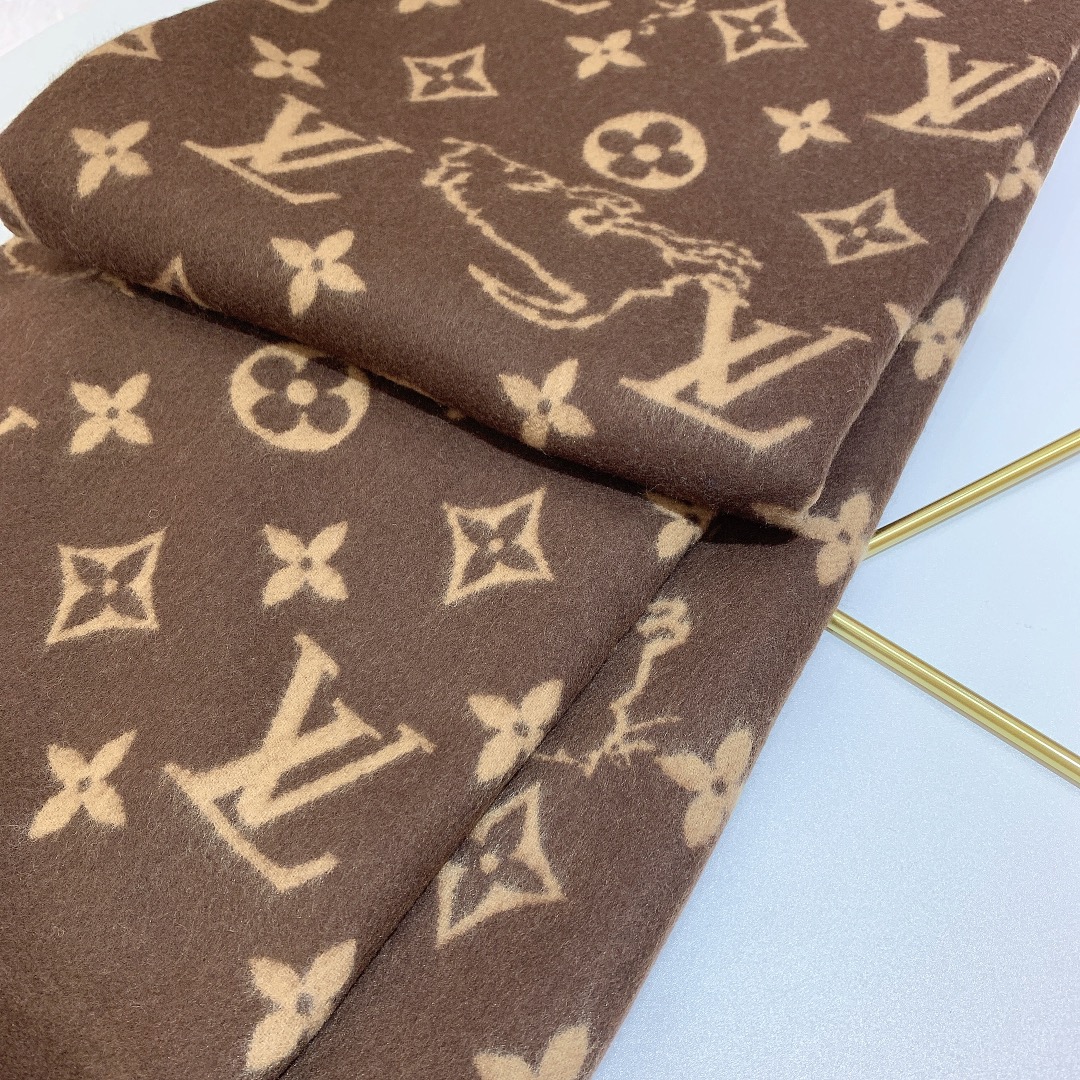 Louis Vuitton Designed with a Catogram theme, combining the Louis Vuitton Monogram pattern with the two designers’ cat and dog pet patterns. Lively and fun. Made of luxurious wool and cashmere materials. Contrasting stitching is particularly eye-catching. Material: 50 lamb wool + 50 cashmere Size: 180x140cm Gram weight: 1250 grams