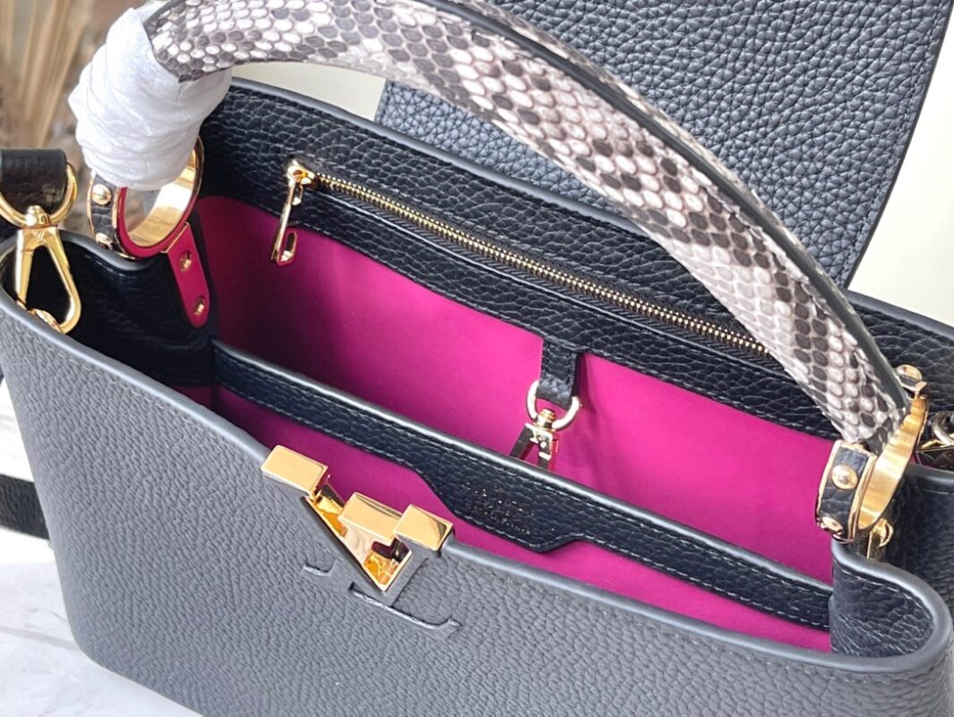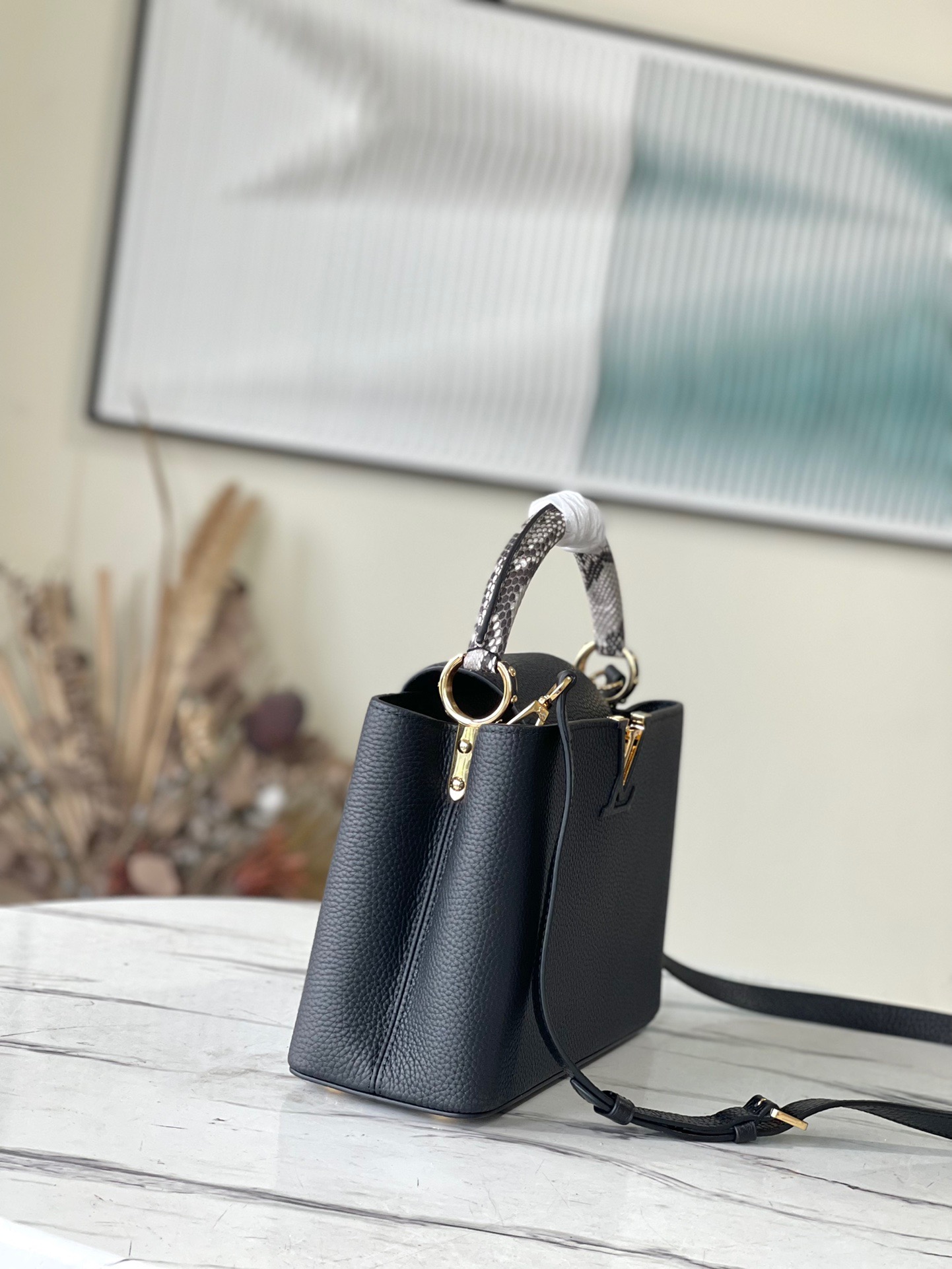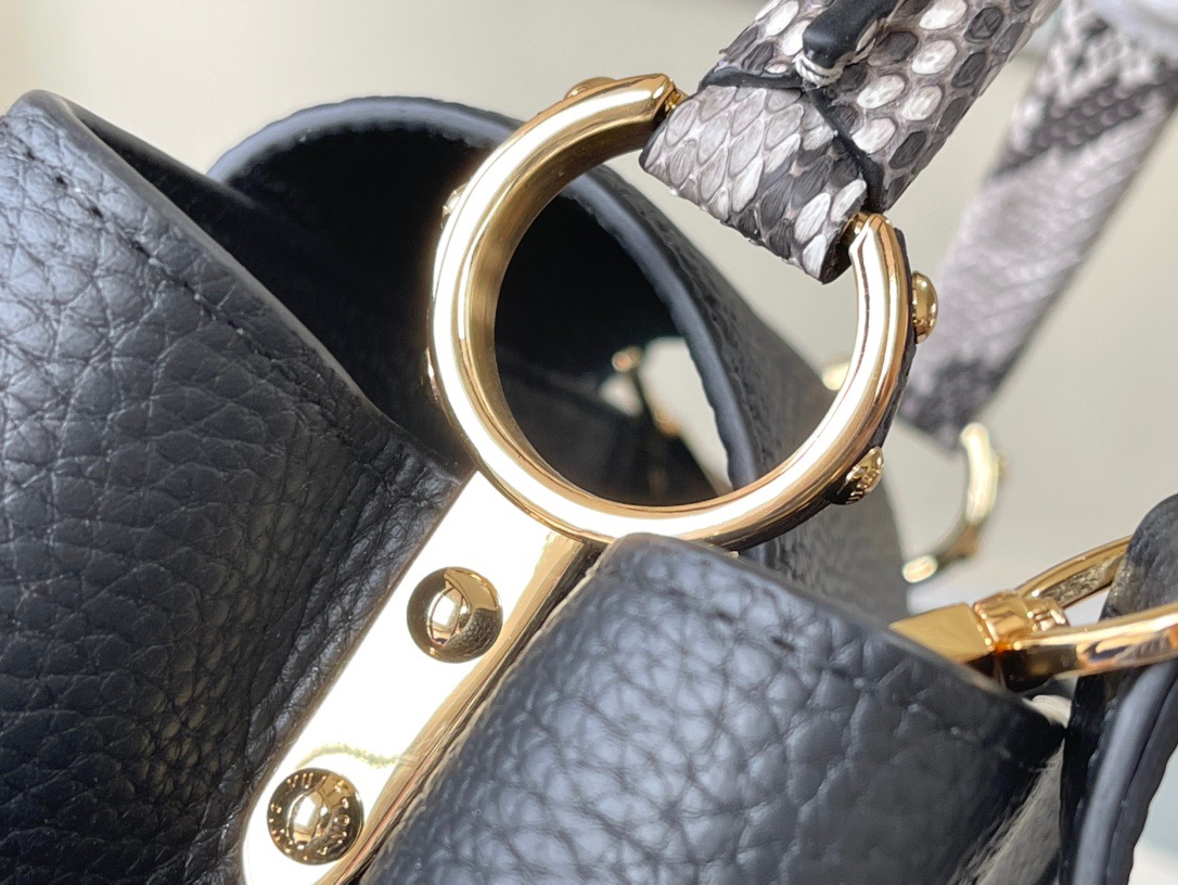 Top original single N92040 medium black golden buckle snake In 1854, a store was opened on rue Capucine in Paris, and the Capucines handbag named accordingly came out in 2013. Full-grain Taurillon leather with a signature flap: the exterior reveals the Monogram flower, and the interior reveals the leather-wrapped letters. Dimensions: 31.5 x 20 x 11 cm