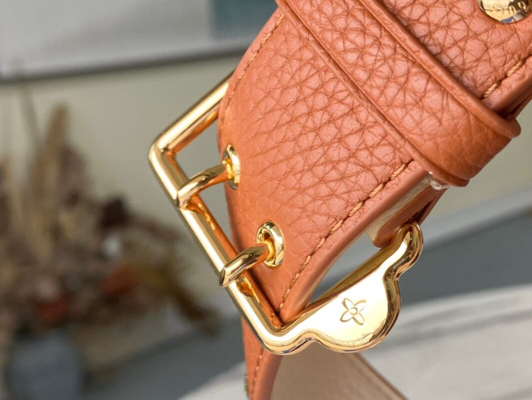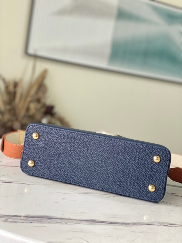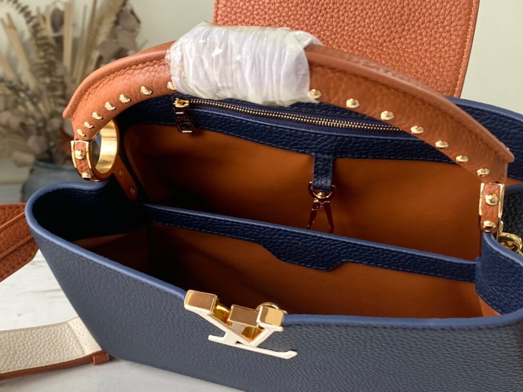 M48865 Dark Blue with Brown Nail Holes This Capucines Medium Handbag is based on Taurillon leather with golden beading. The beads on each handbag are hand-stitched one by one for hours. Sincere ingenuity Size: 31.5x20x11cm