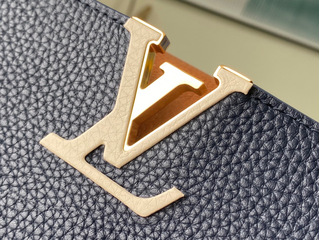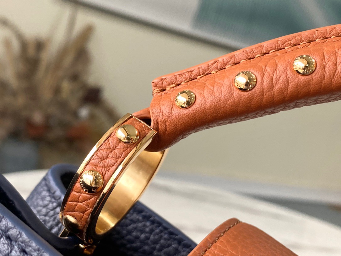 M48865 Dark Blue with Brown Nail Holes This Capucines Medium Handbag is based on Taurillon leather with golden beading. The beads on each handbag are hand-stitched one by one for hours. Sincere ingenuity Size: 31.5x20x11cm