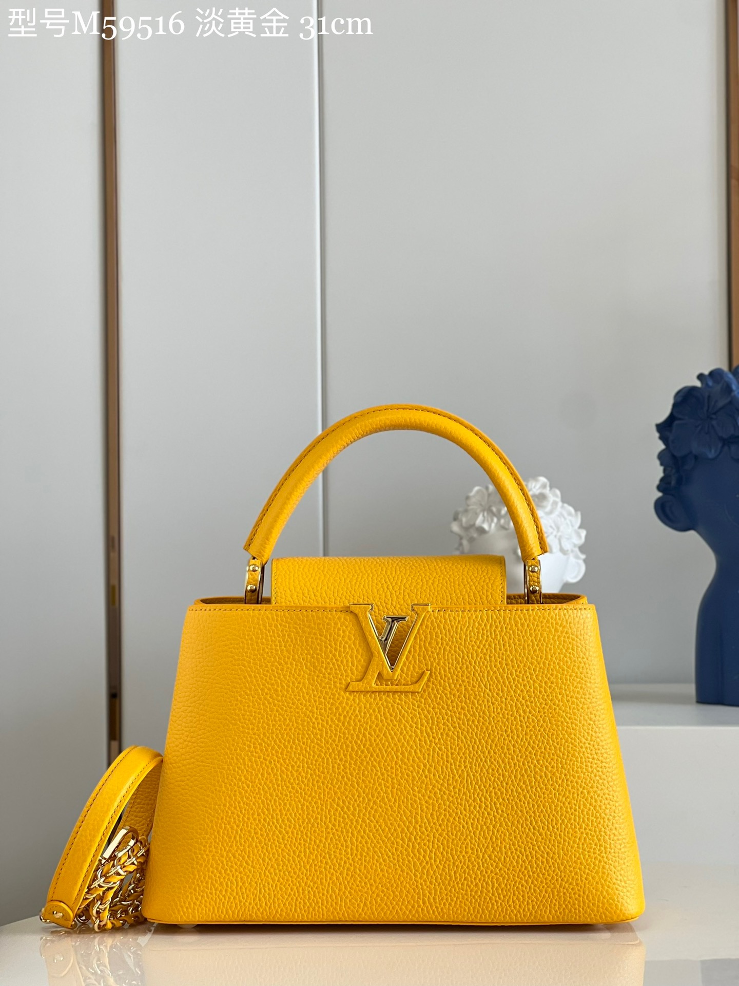 M59516 Light Gold Medium Size Capucines MM Handbag Imported French calfskin. Shiny metal accessories. Unique Capucines cover can be placed inside the bag to display the letter logo, and can be turned out to display the Monogram Flower pattern.Size: 31.5 x 20 x 11cm