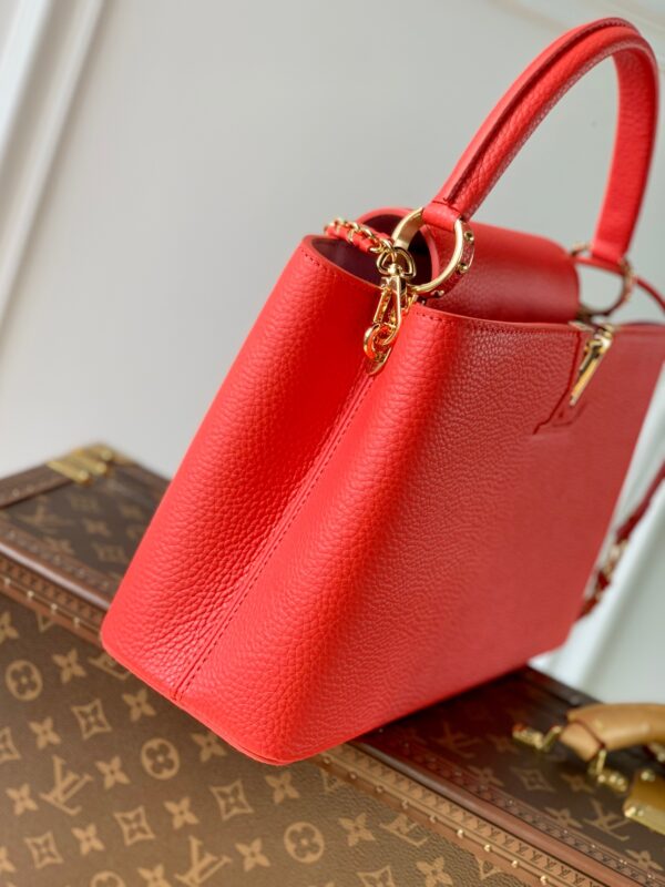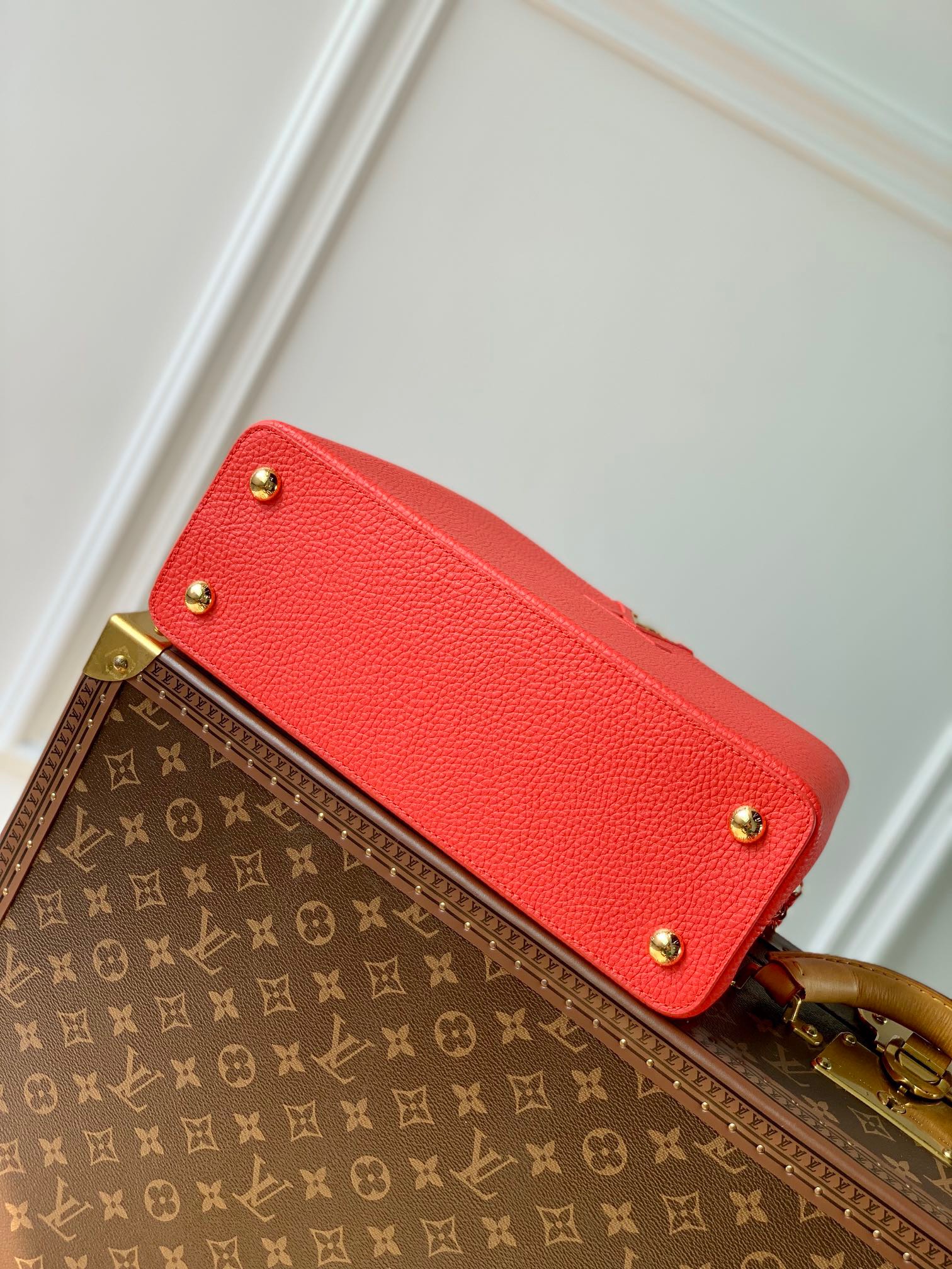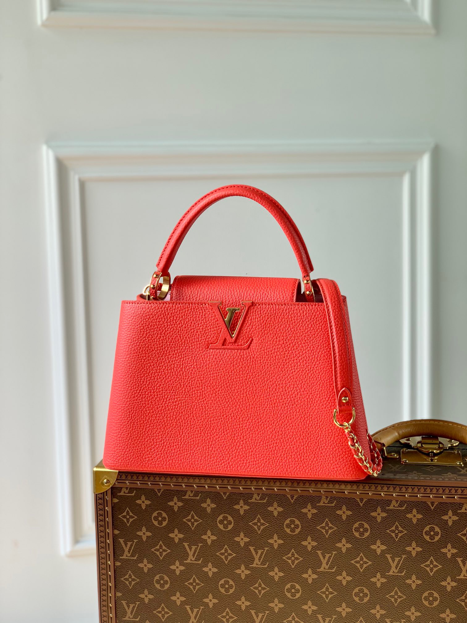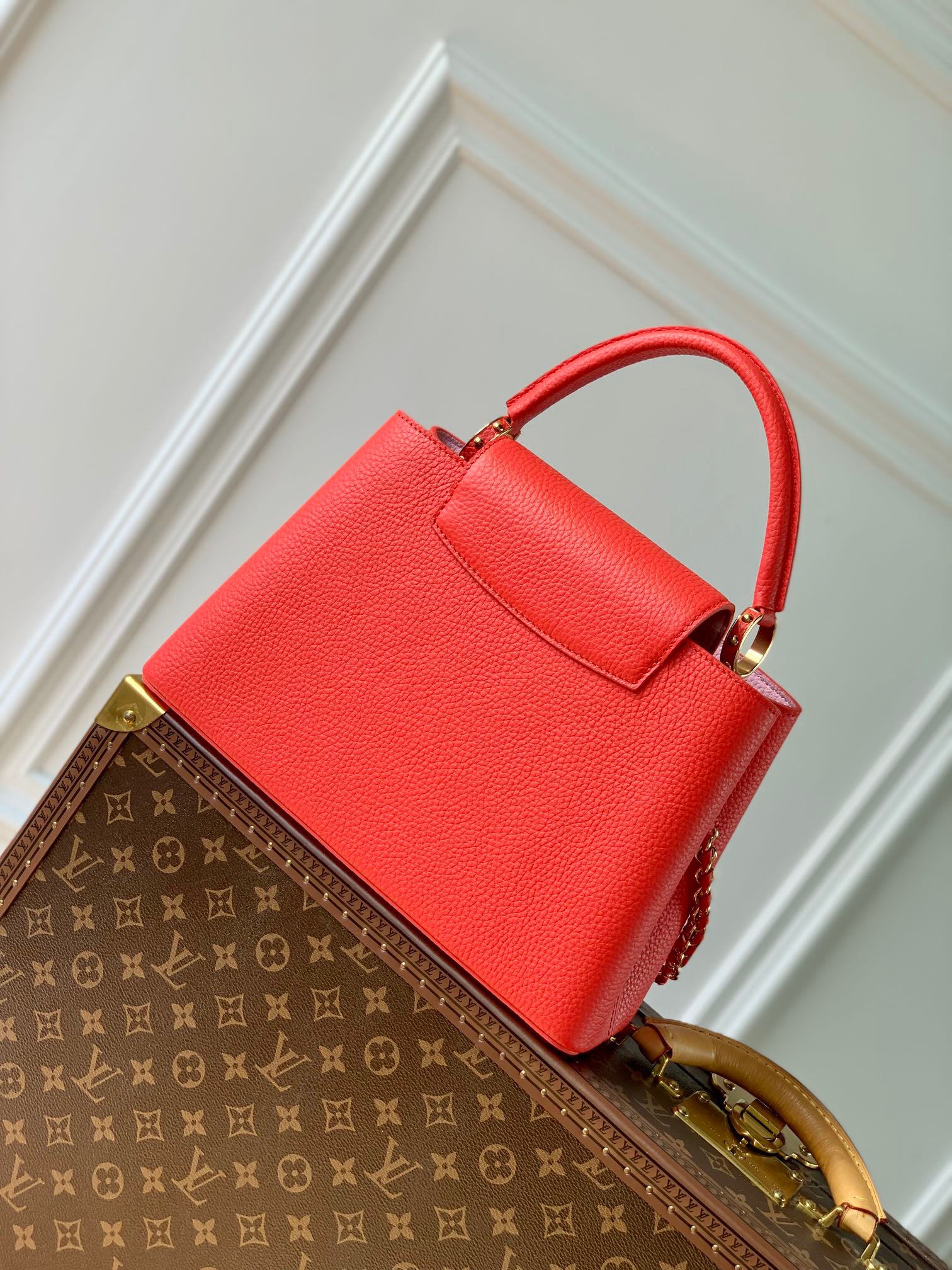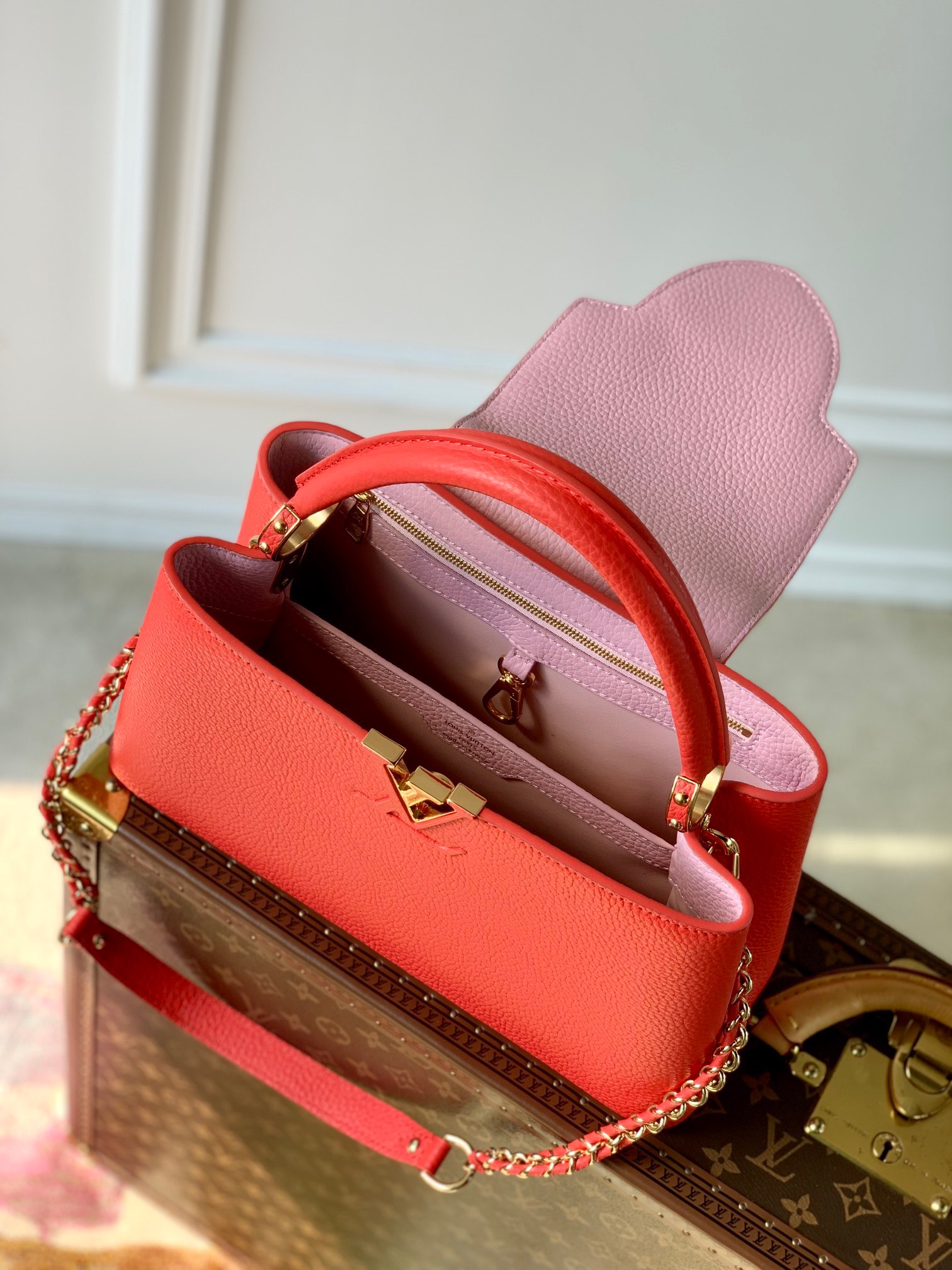 Original single M20513 Orange Medium 2022 spring series Capucines medium handbag uses Taurillon leather to render the color of the season, and then connects the shoulder strap with soft leather and metal chain weaving, showing the brand’s exquisite ingenuity. Dimensions: 31.5 x 20 x 11 cm (L x H x W)