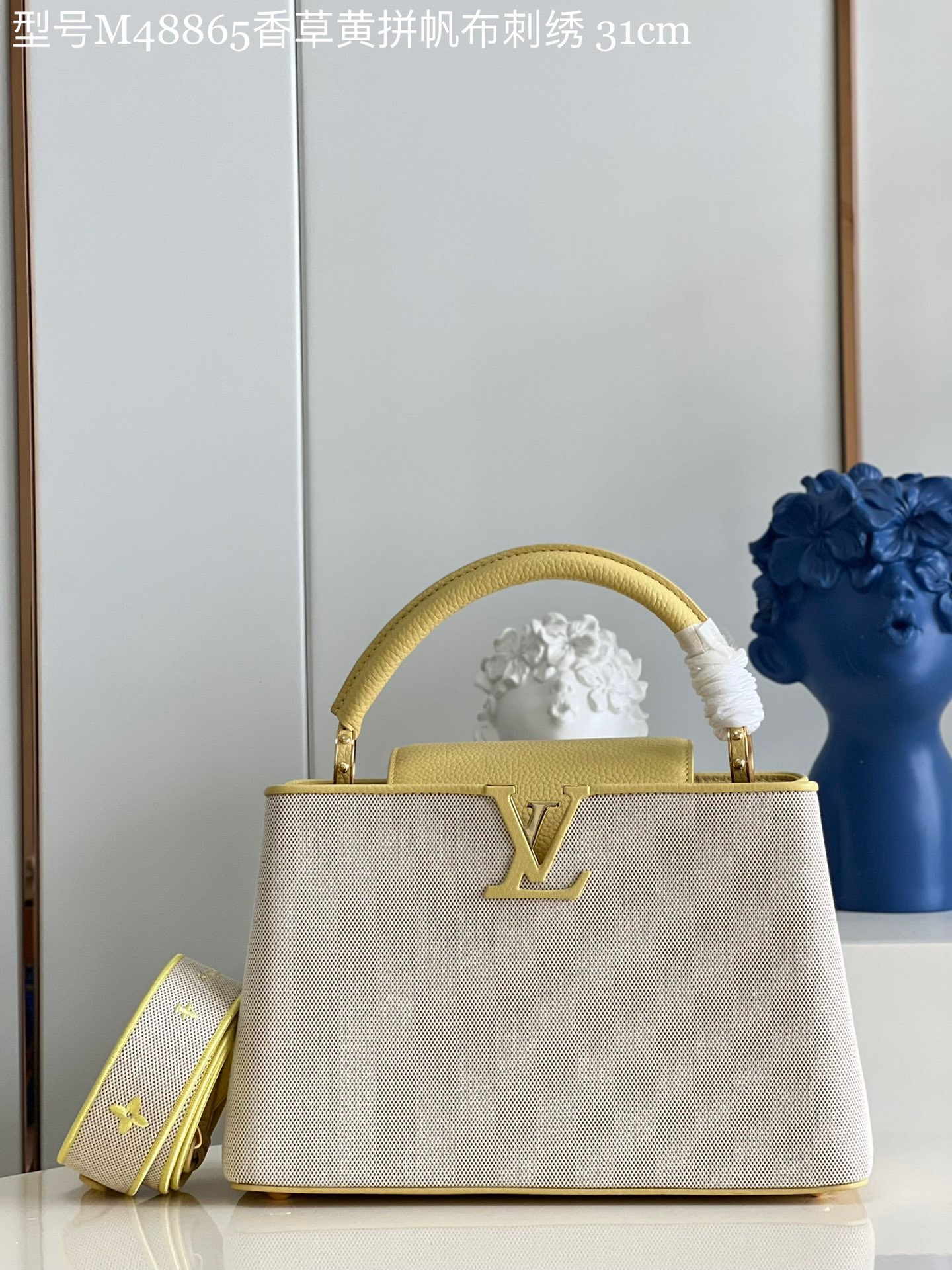 M48865 Vanilla Yellow with Canvas Embroidery Medium Capucines MM handbag Imported French calfskin. Shiny metal accessories. The unique Capucines cover can be placed inside the bag to display the letter logo, and can be turned out to present the Monogram Flower pattern.Size: 31.5 x 20 x 11cm