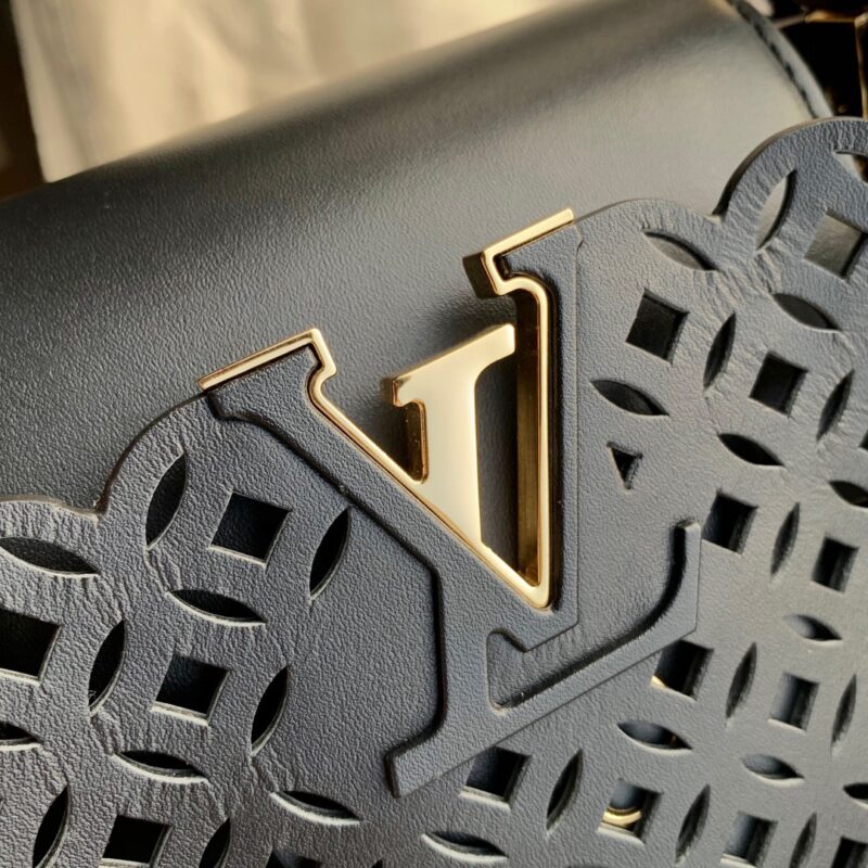 M57228 Capucines BB Hollow Handbag This handbag is made of exquisite openwork calfskin, showing the hollow pattern from the classic Monogram flowers and Louis Vuitton store decoration, like a mini woven summer basket, hence the name Garden Party. This Capucines BB handbag embodies elegance and luxury. Dimensions: 27×18×9 cm