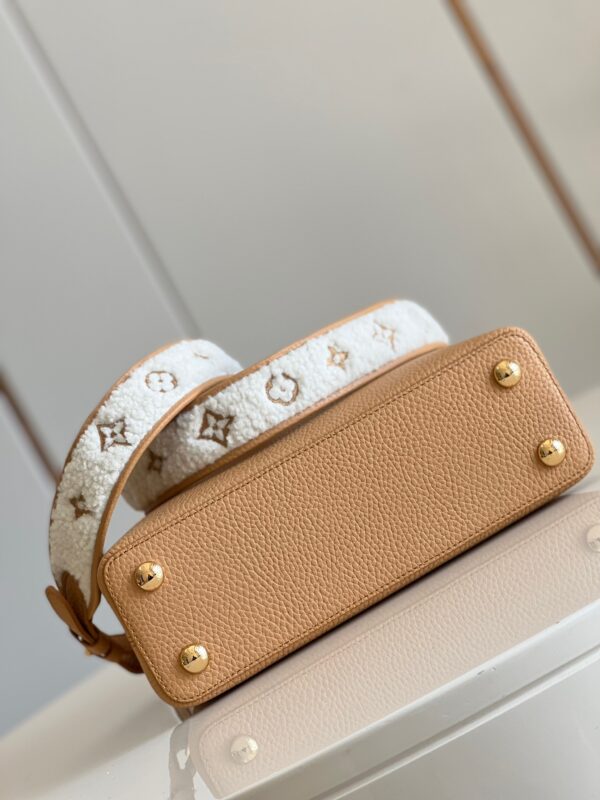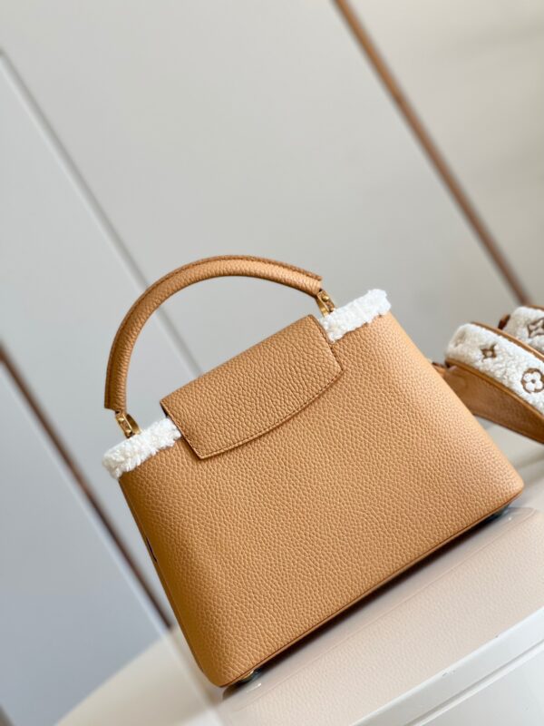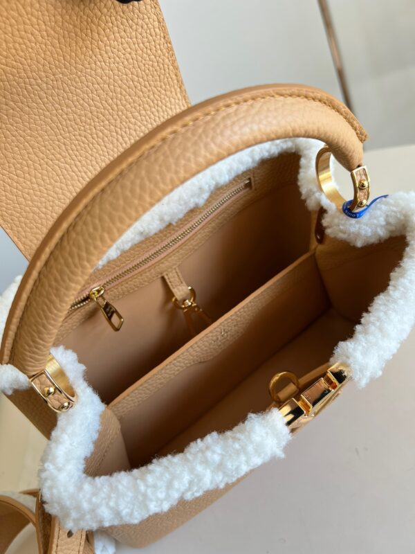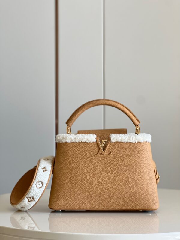 M59267 Apricot Gold SmallThis Capucines small handbag is made of Taurillon calf leather, and the shoulder strap and top are embellished with wool leather, conveying the winter style. The iconic LV letter is wrapped in leather, and the Monogram flower blooms on the detachable leather shoulder strap, which can be easily converted from shoulder to crossbody. Size: 27 x 18 x 9 cm
