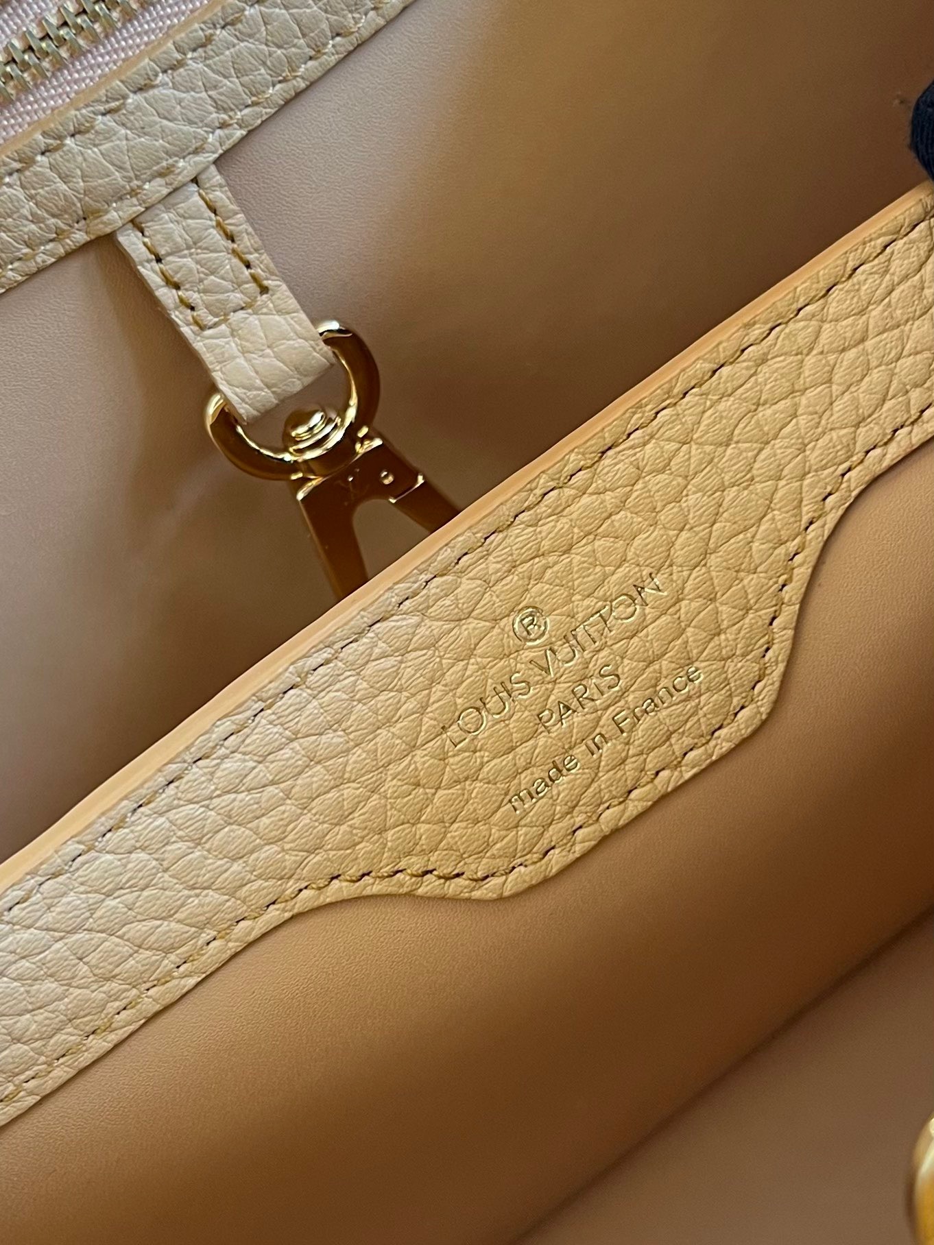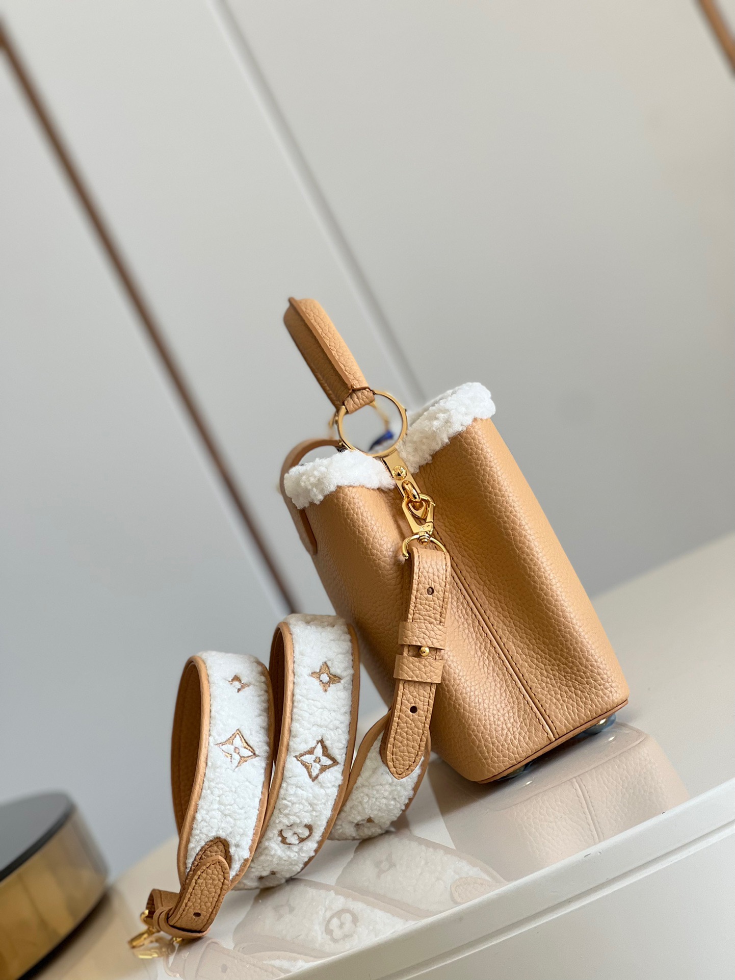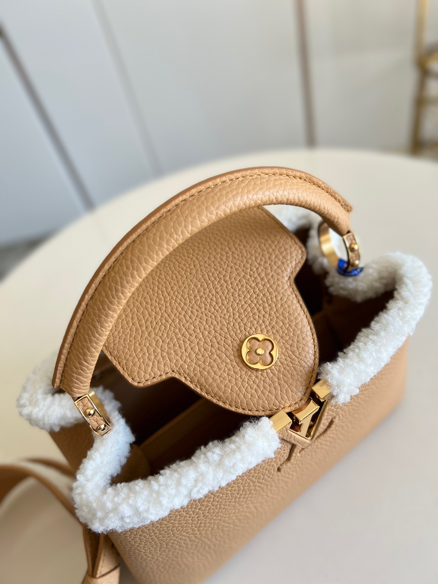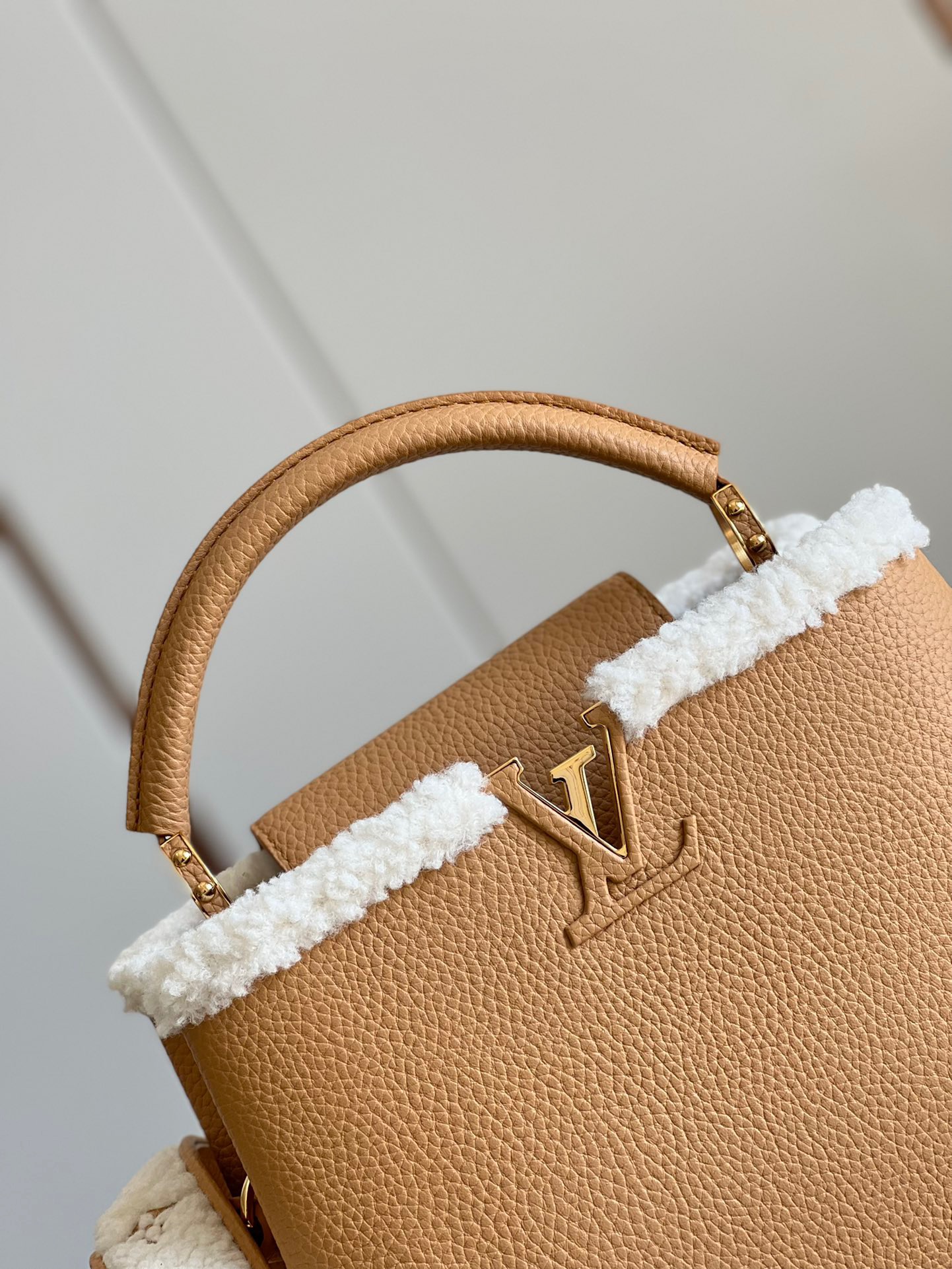 M59267 Apricot Gold SmallThis Capucines small handbag is made of Taurillon calf leather, and the shoulder strap and top are embellished with wool leather, conveying the winter style. The iconic LV letter is wrapped in leather, and the Monogram flower blooms on the detachable leather shoulder strap, which can be easily converted from shoulder to crossbody. Size: 27 x 18 x 9 cm