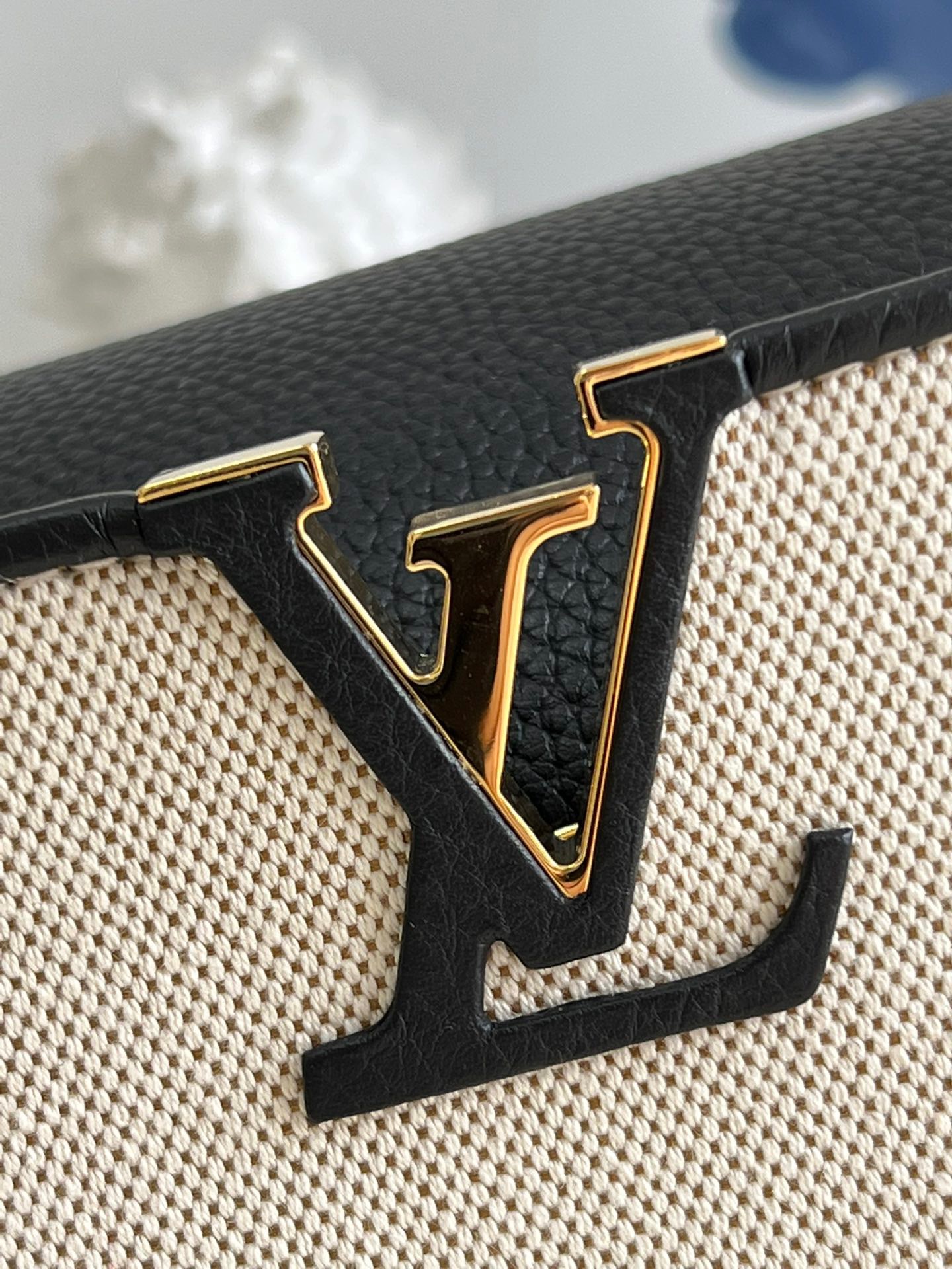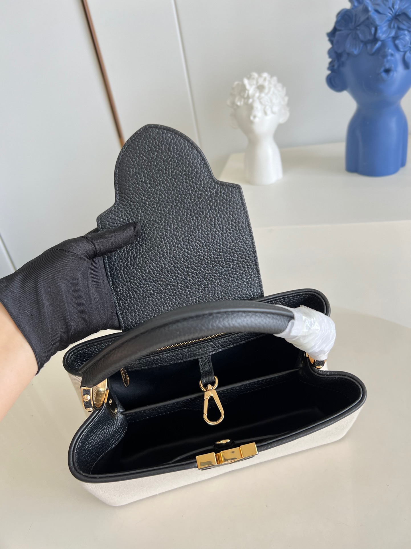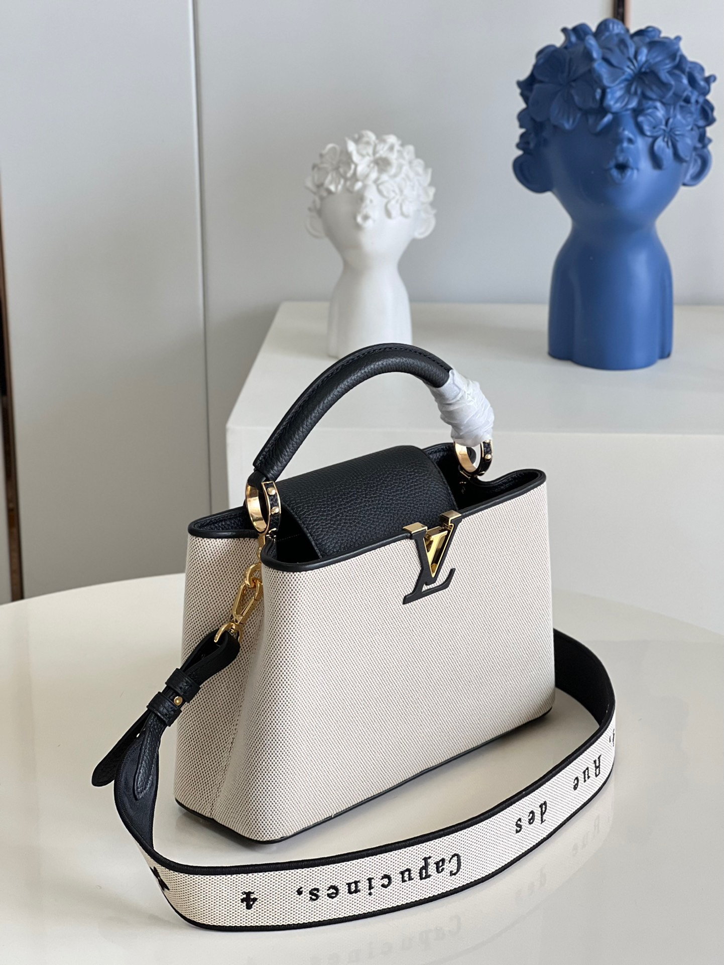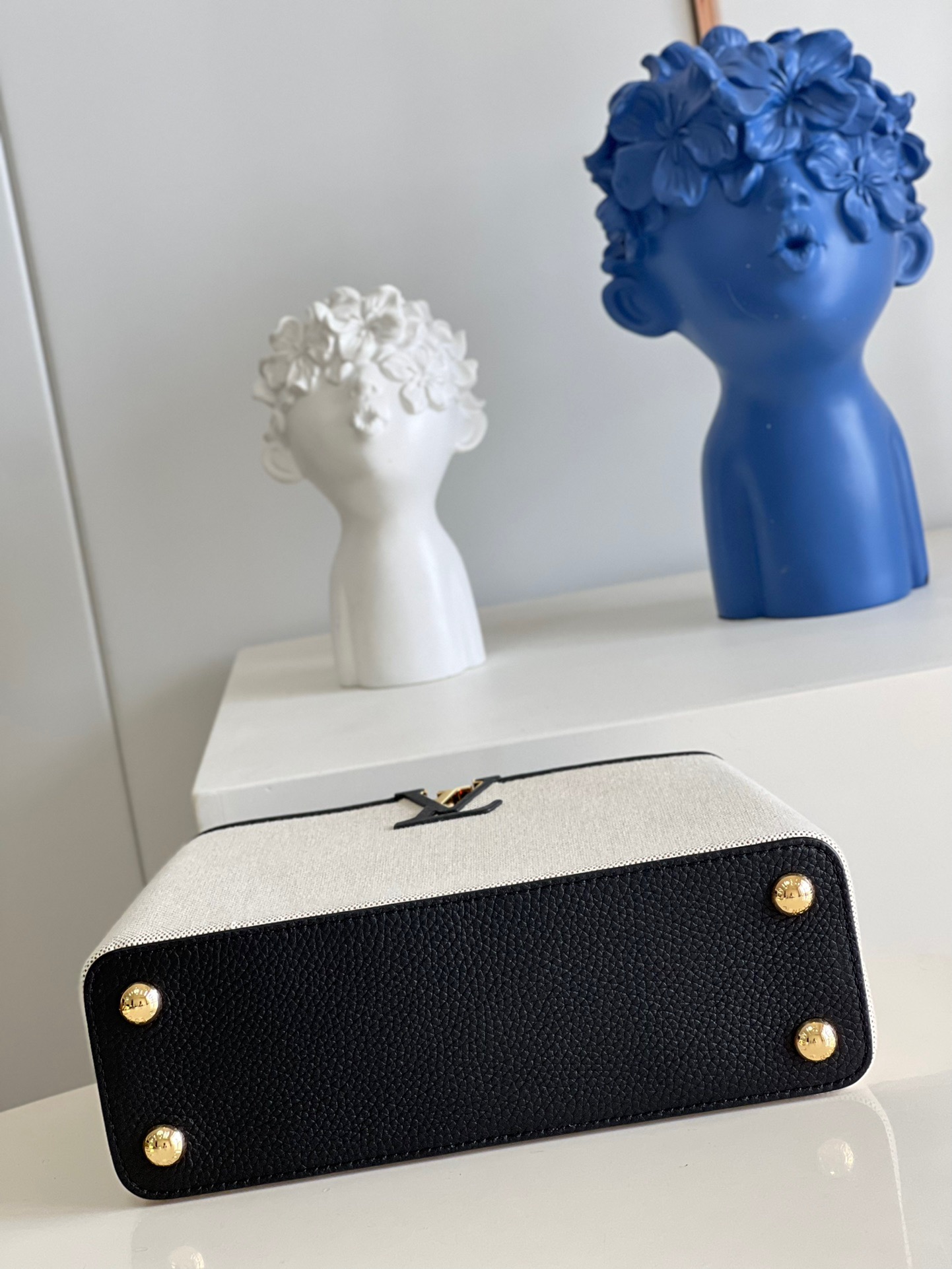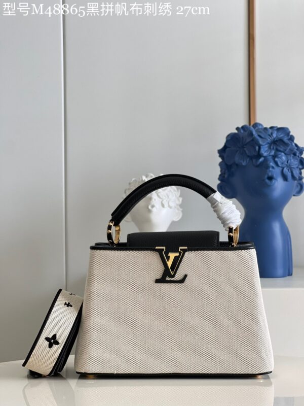 M48865 Black Canvas Embroidery Small Capucines BB Handbag Imported French calfskin. Shiny metal accessories. The unique Capucines cover can be placed inside the bag to display the letter logo, and can be turned out to present the Monogram Flower pattern.Size: 27 x 18 x 9cm