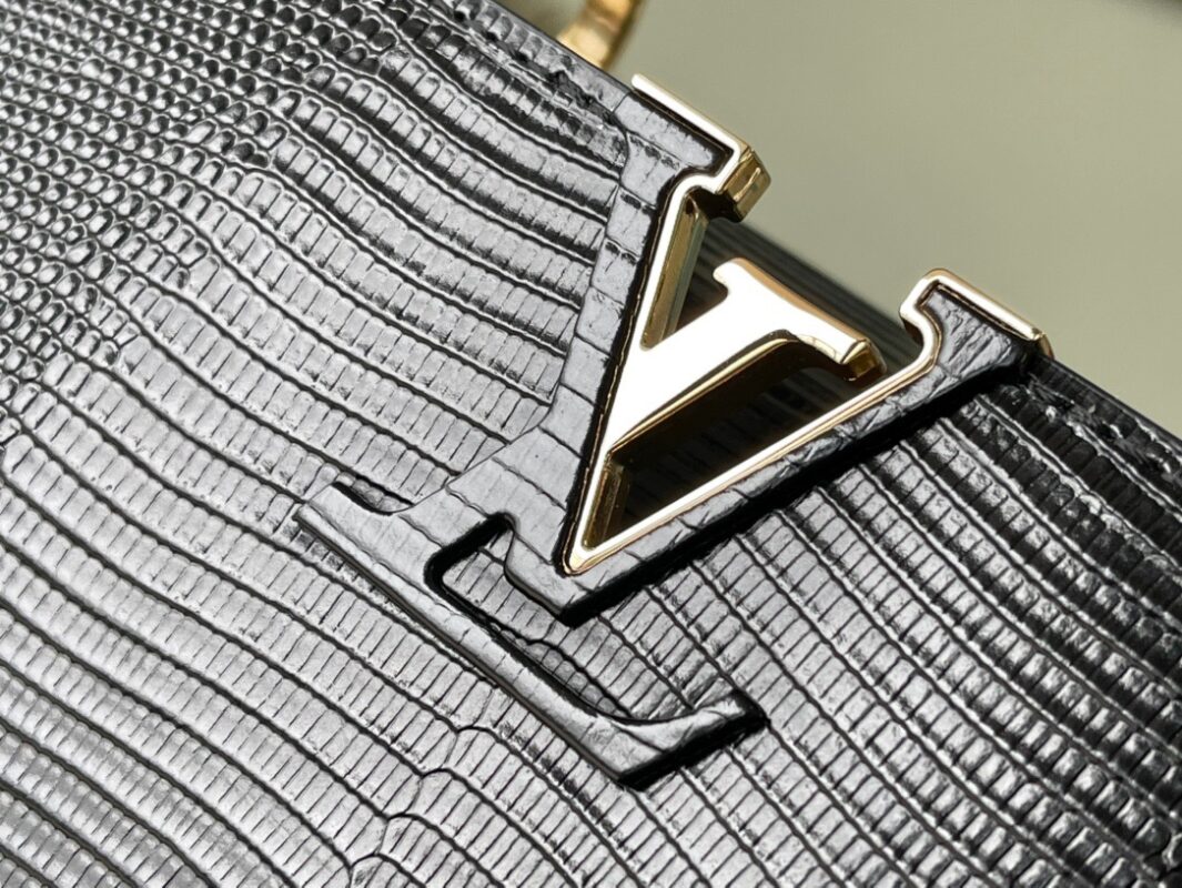 M48865 Black Lizard Himalayan Small Capucines Handbag delicately blends graceful lizard skin outer layer, fine sheep leather lining and lustrous metal parts, and the iconic flip achieves two styles of fashion: inside to read the logo, and outside to bloom Monogram flowers. Brighten up an eye-catching corner for evening occasions. Size: 27x18x9cm