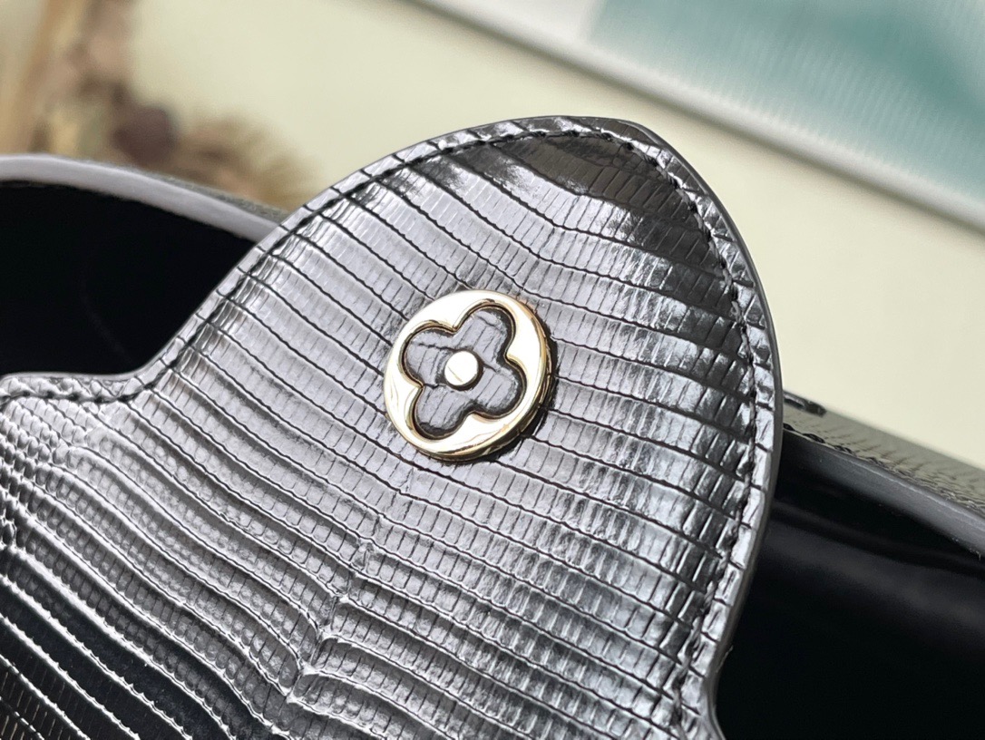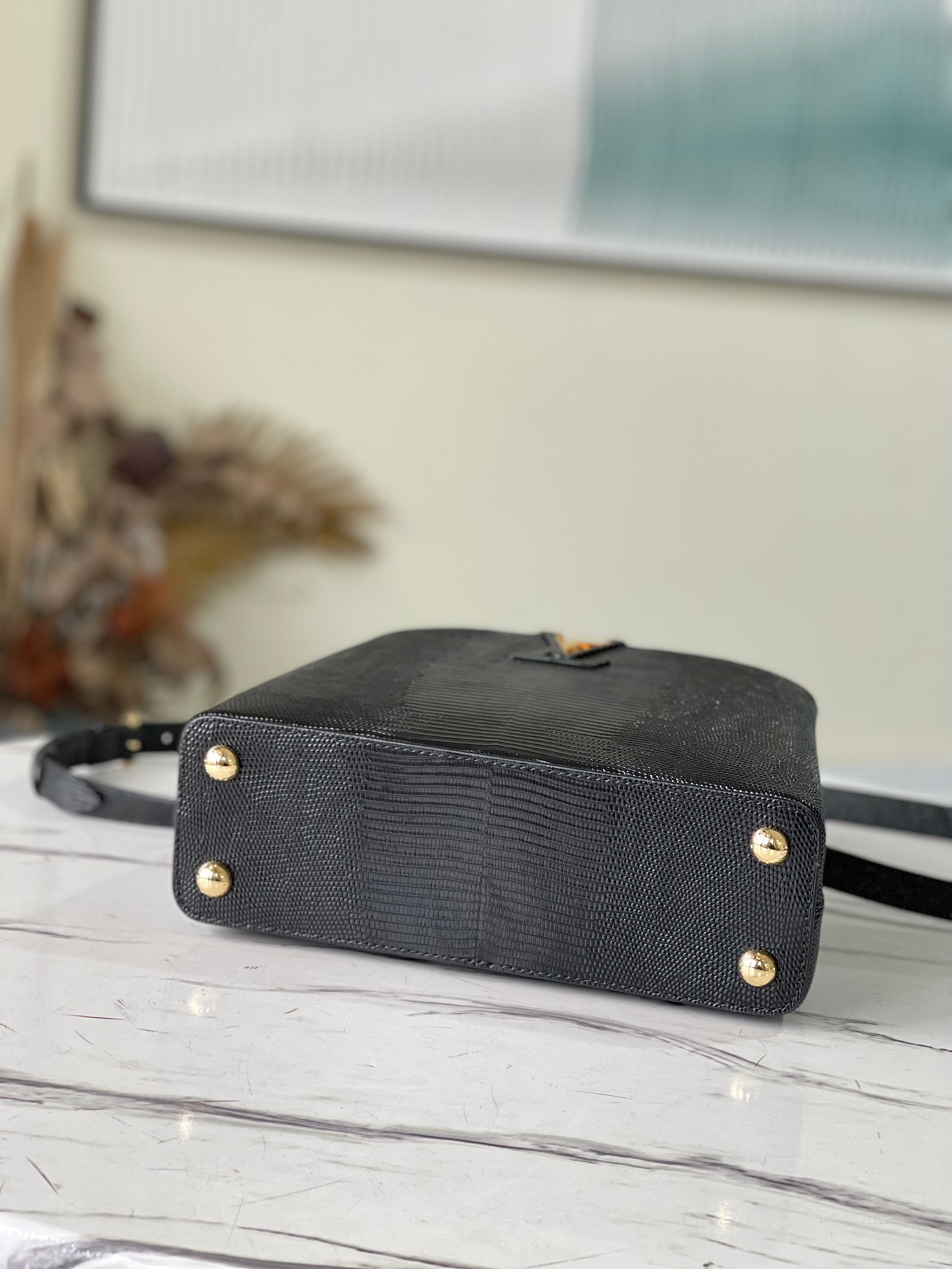 M48865 Black Lizard Himalayan Small Capucines Handbag delicately blends graceful lizard skin outer layer, fine sheep leather lining and lustrous metal parts, and the iconic flip achieves two styles of fashion: inside to read the logo, and outside to bloom Monogram flowers. Brighten up an eye-catching corner for evening occasions. Size: 27x18x9cm
