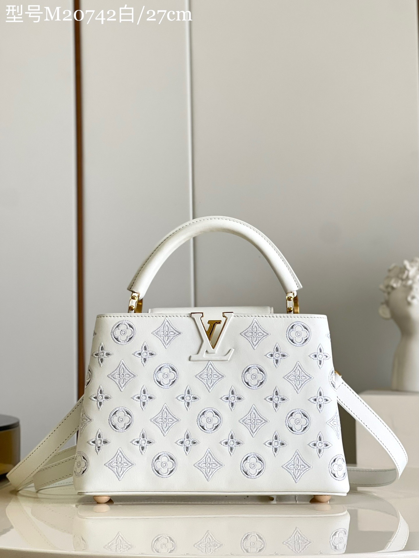 Capucines BB handbag Imported from France calfskin. Shiny metal accessories. Unique Capucines cover can be placed inside the bag to display the letter logo, and can be turned out to present the Monogram Flower pattern.Model M20742 Bourdon stitching embroidery. Size: 27 x 18 x 9cm