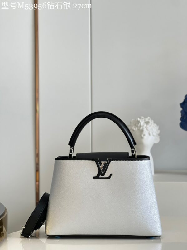 M53956 Diamond Silver SmallCapucines BB Handbag Imported French calfskin. Shiny metal accessories. The unique Capucines cover can be placed inside the bag to display the letter logo, and can be turned out to present the Monogram Flower pattern.Size: 27 x 18 x 9cm