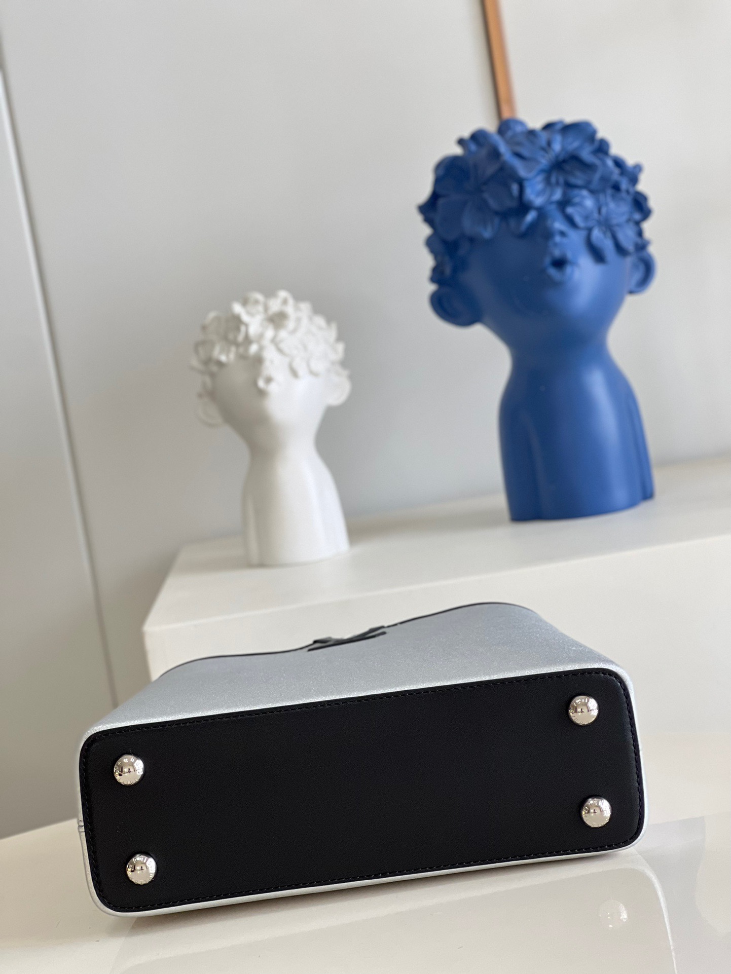 M53956 Diamond Silver SmallCapucines BB Handbag Imported French calfskin. Shiny metal accessories. The unique Capucines cover can be placed inside the bag to display the letter logo, and can be turned out to present the Monogram Flower pattern.Size: 27 x 18 x 9cm