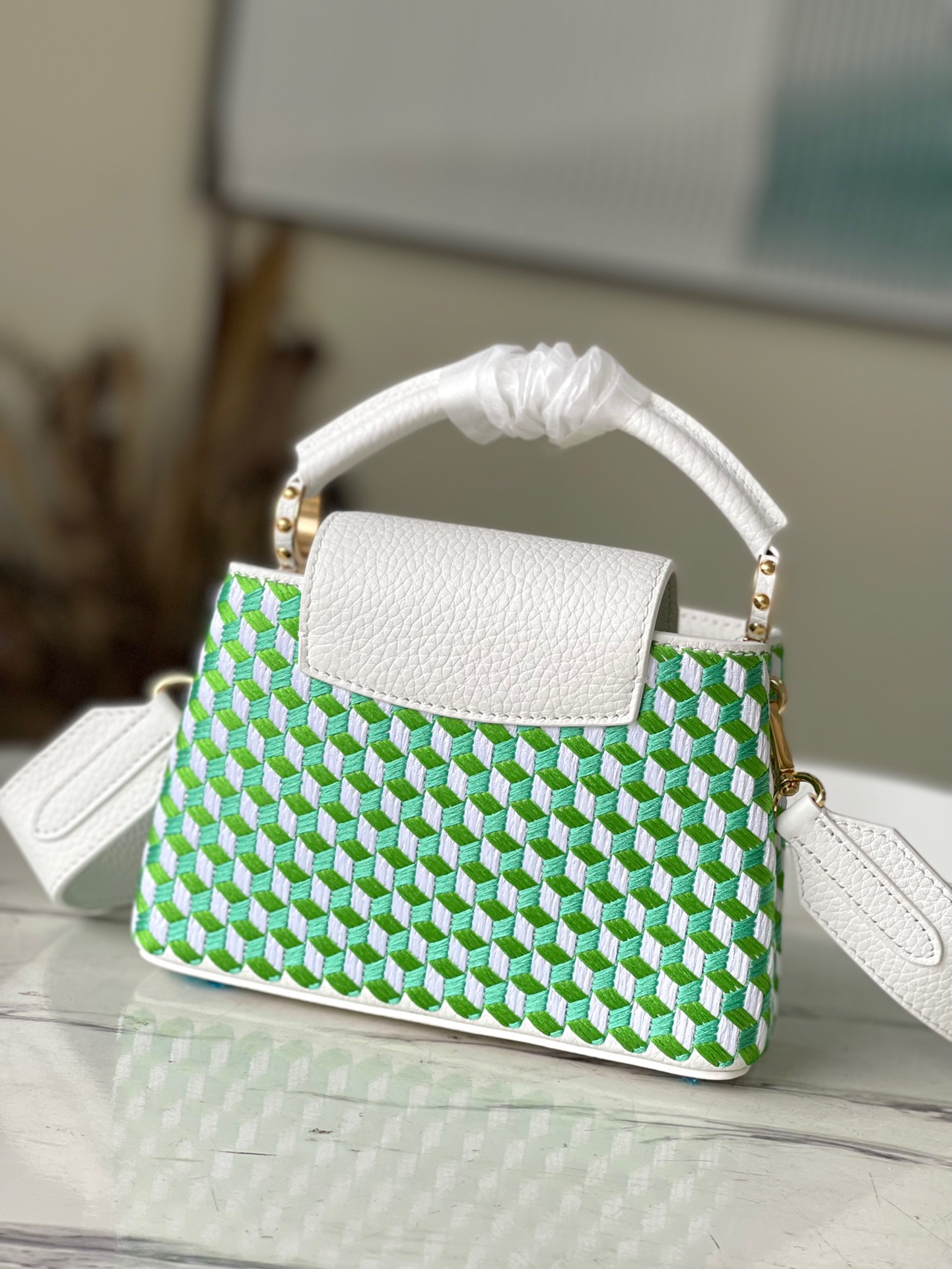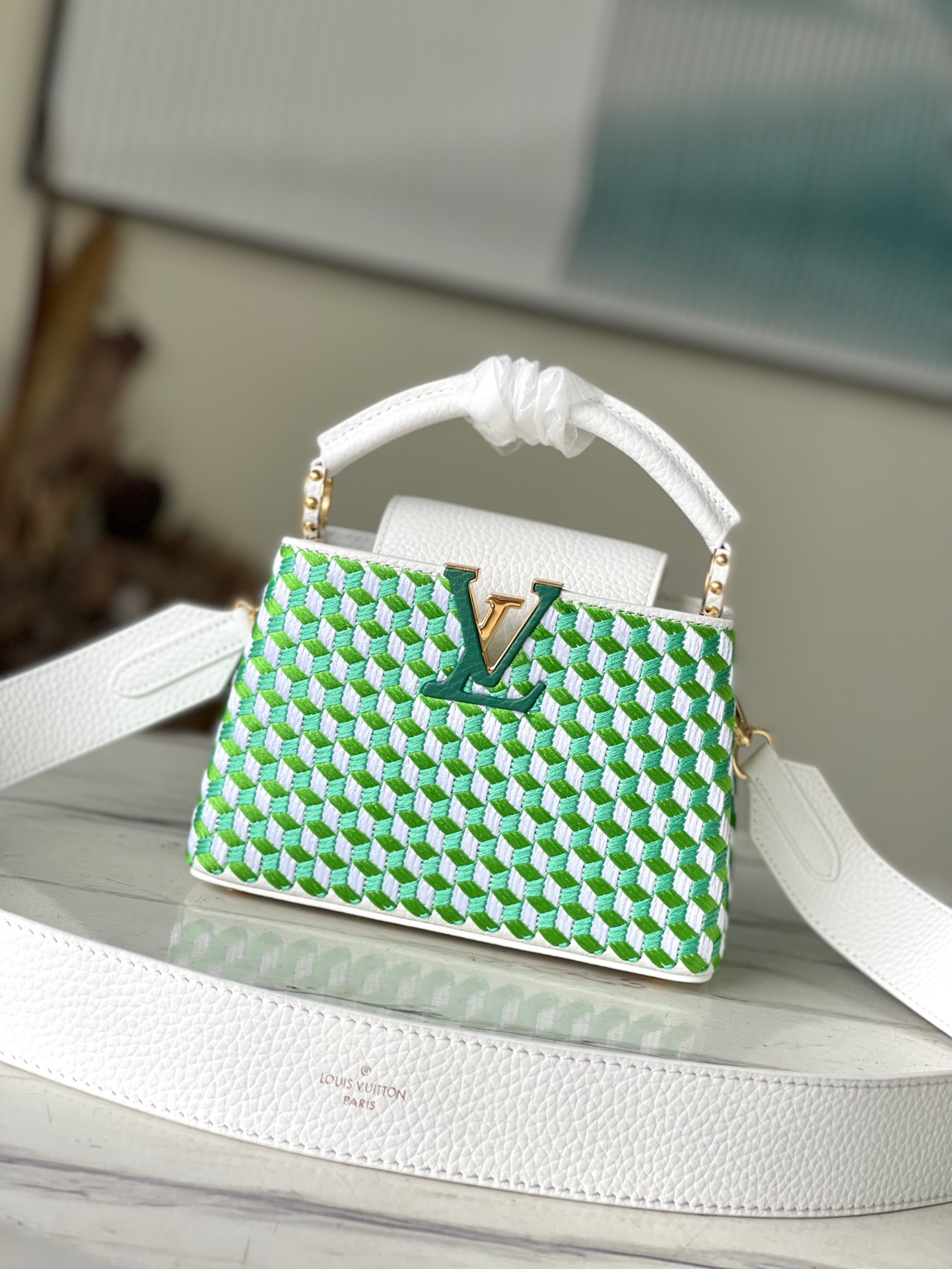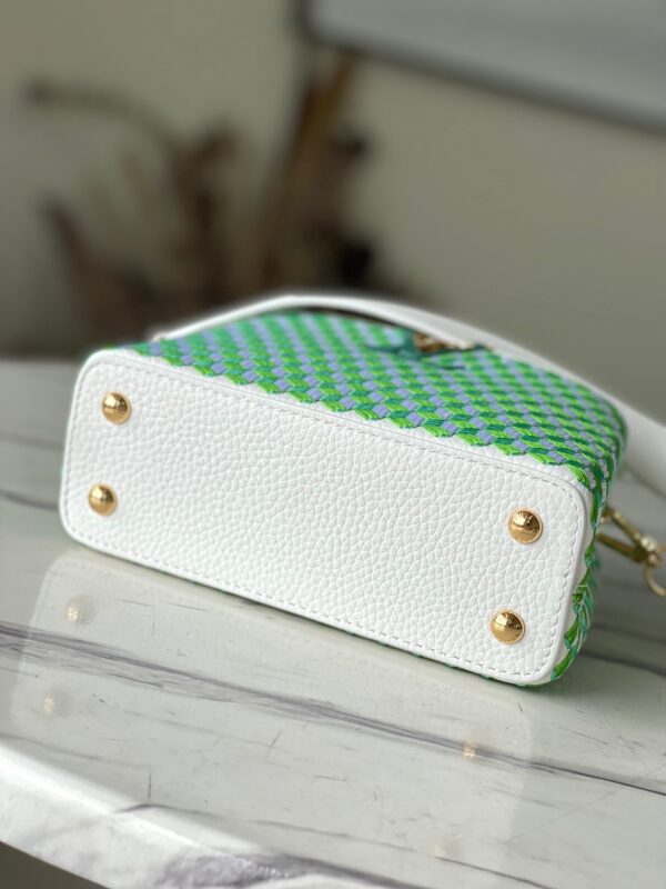 The top original single M59879 Capucines Tressage Mini Handbag makes intricate embroidery bloom on the elegant Taurillon leather, showing the contrast of texture and texture through delicate stitching and logo. The sleek shape and detachable shoulder strap make it easy to carry by hand or across the body. Dimensions: 21 x 14 x 8 cm