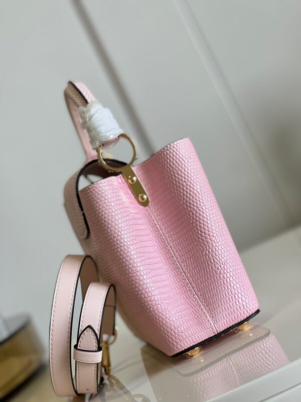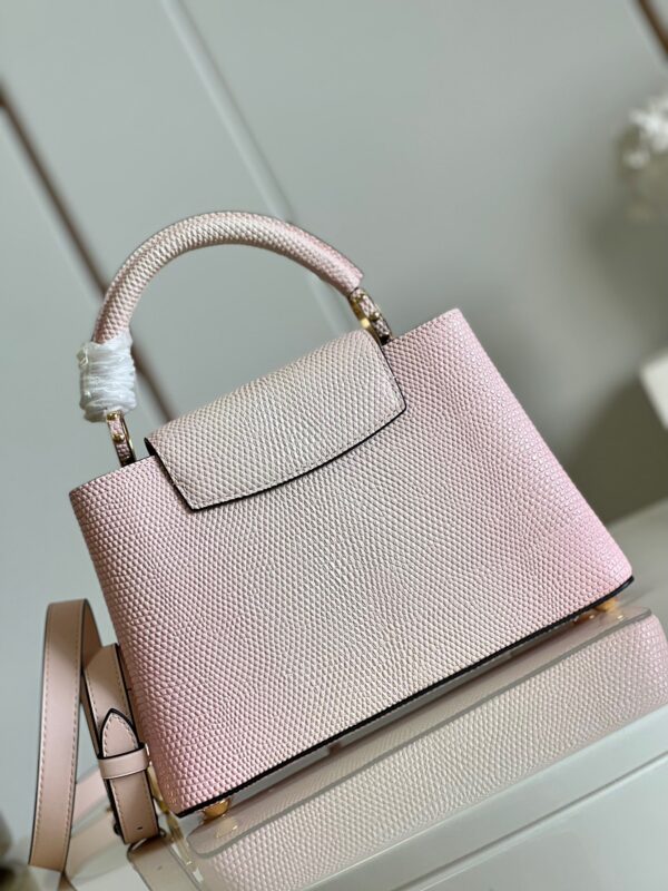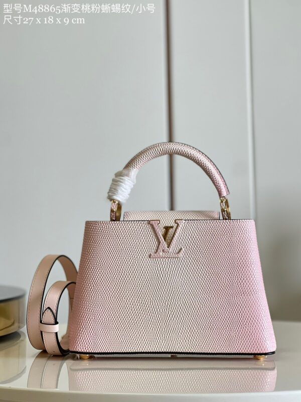 Louis Vuitton Small Capucines BB HandbagFrench imported calfskin. Shiny metal accessorie. Unique Capucines cover can be put inside the bag to display the letter logo, and can be turned inside out to present the Monogram Flower Pattern.Model M48865 Gradient Pink Lizard PatternSize: 27 x 18 x 9cm