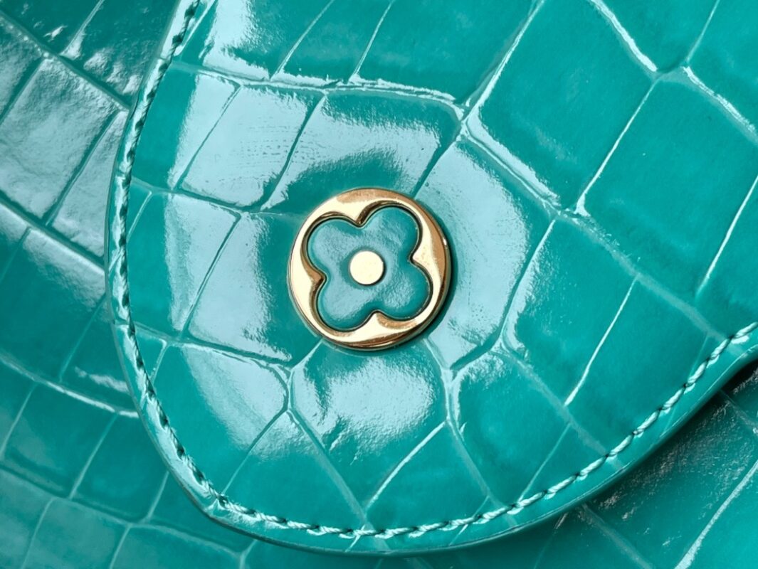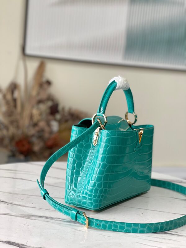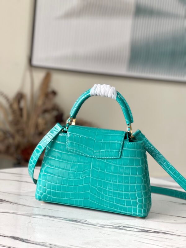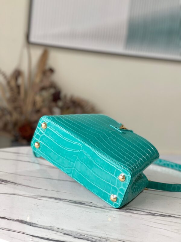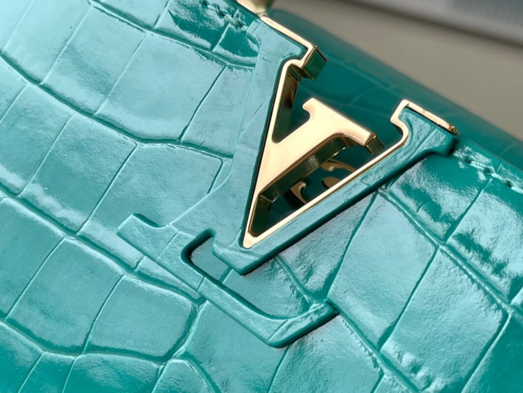 M48865 Green Crocodile Pattern Small This precious Capucines BB handbag is made of crocodile leather pattern with high gloss treatment, which shines charming and luxurious goatskin lining and gleaming metal accessories. The unique Capucines flap can be displayed inside the bag. The letter logo can be turned inside out to present the Monogram Flower pattern. Ideal accessories for night out. Size: 27x18x9 cm