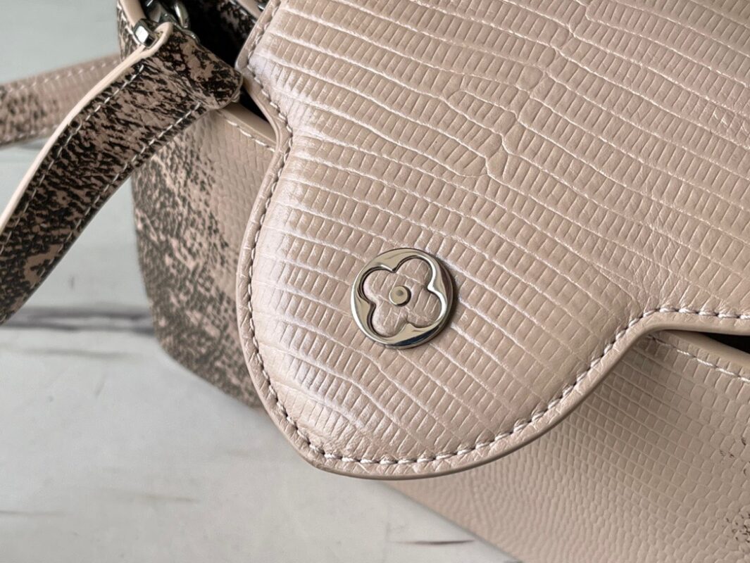 M48865 Small Khaki Lizard Himalayan Top original single Capucines Handbag exquisitely blends graceful lizard skin outer layer, fine sheep leather inner lining and lustrous metal parts, and the iconic flip achieves two styles of fashion: inside to read the logo, and outside to bloom Monogram Flowers, brighten up an eye-catching corner for evening occasions. Size: 27*18*9cm