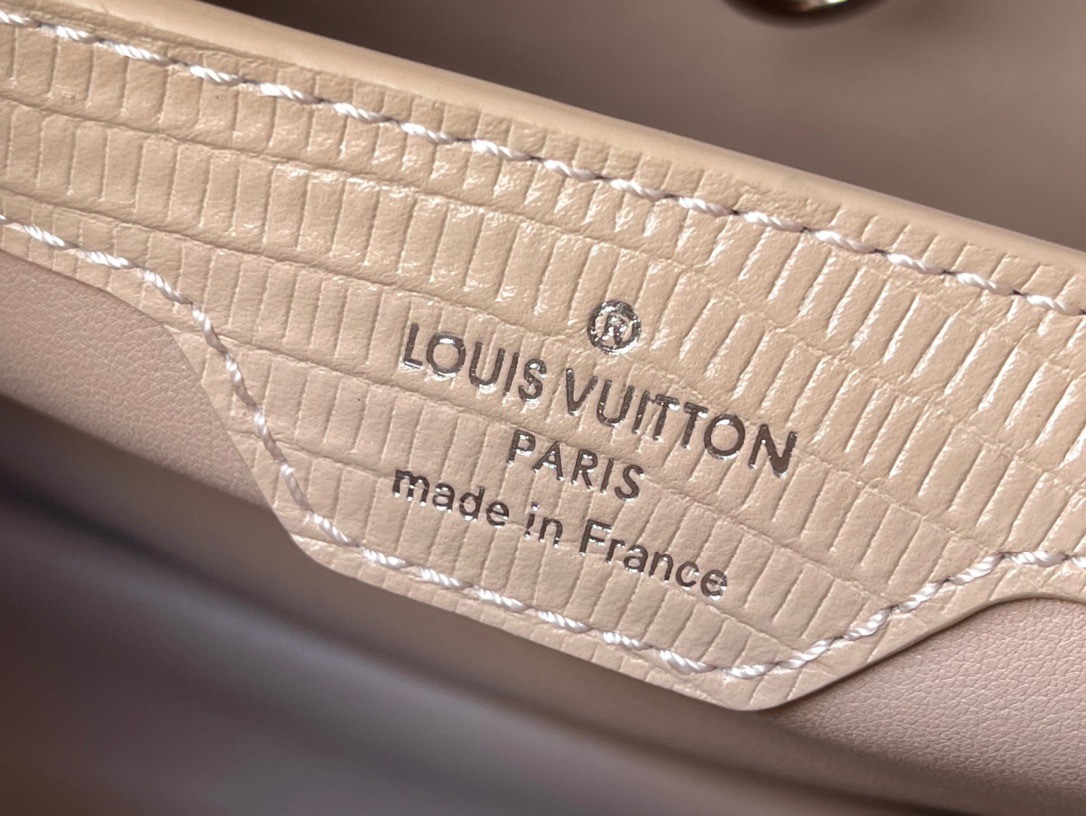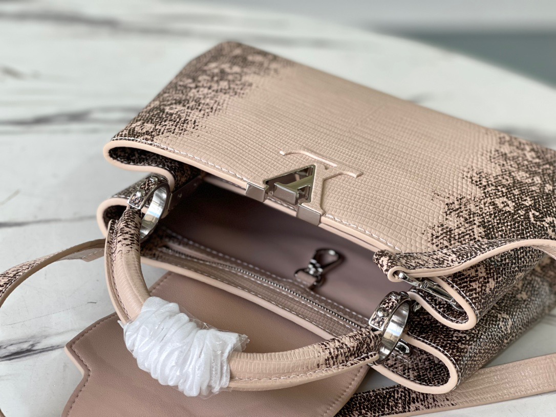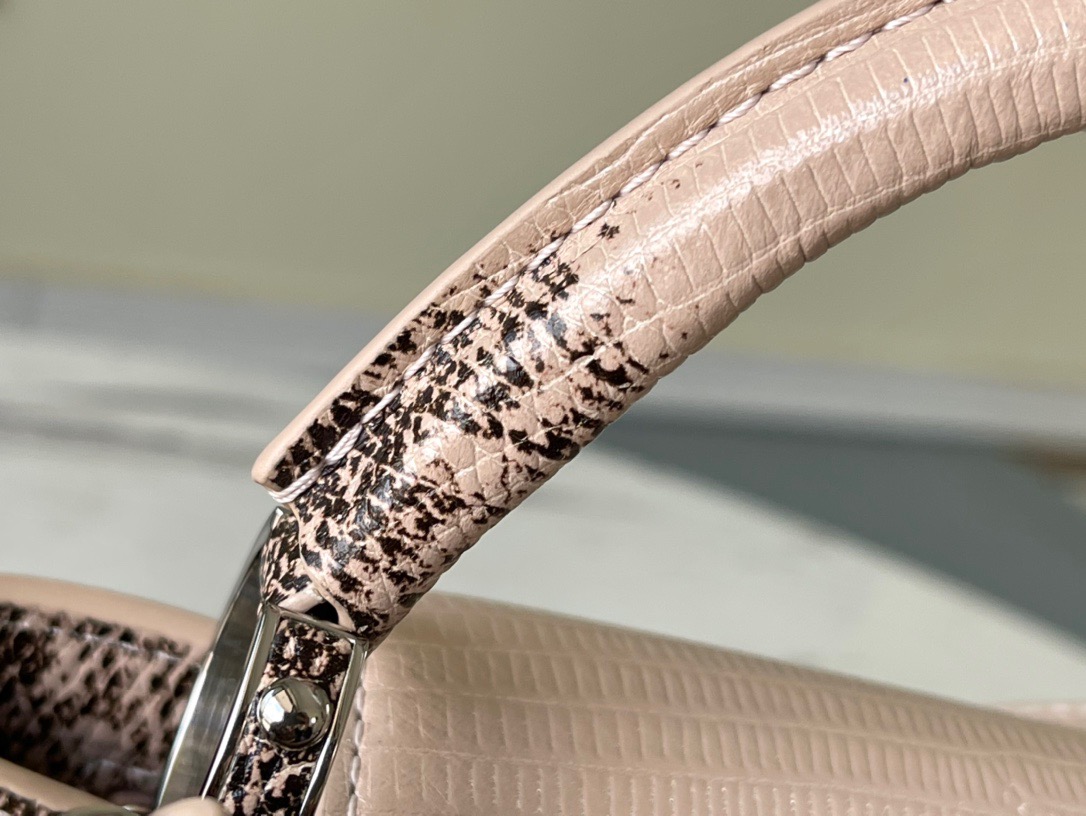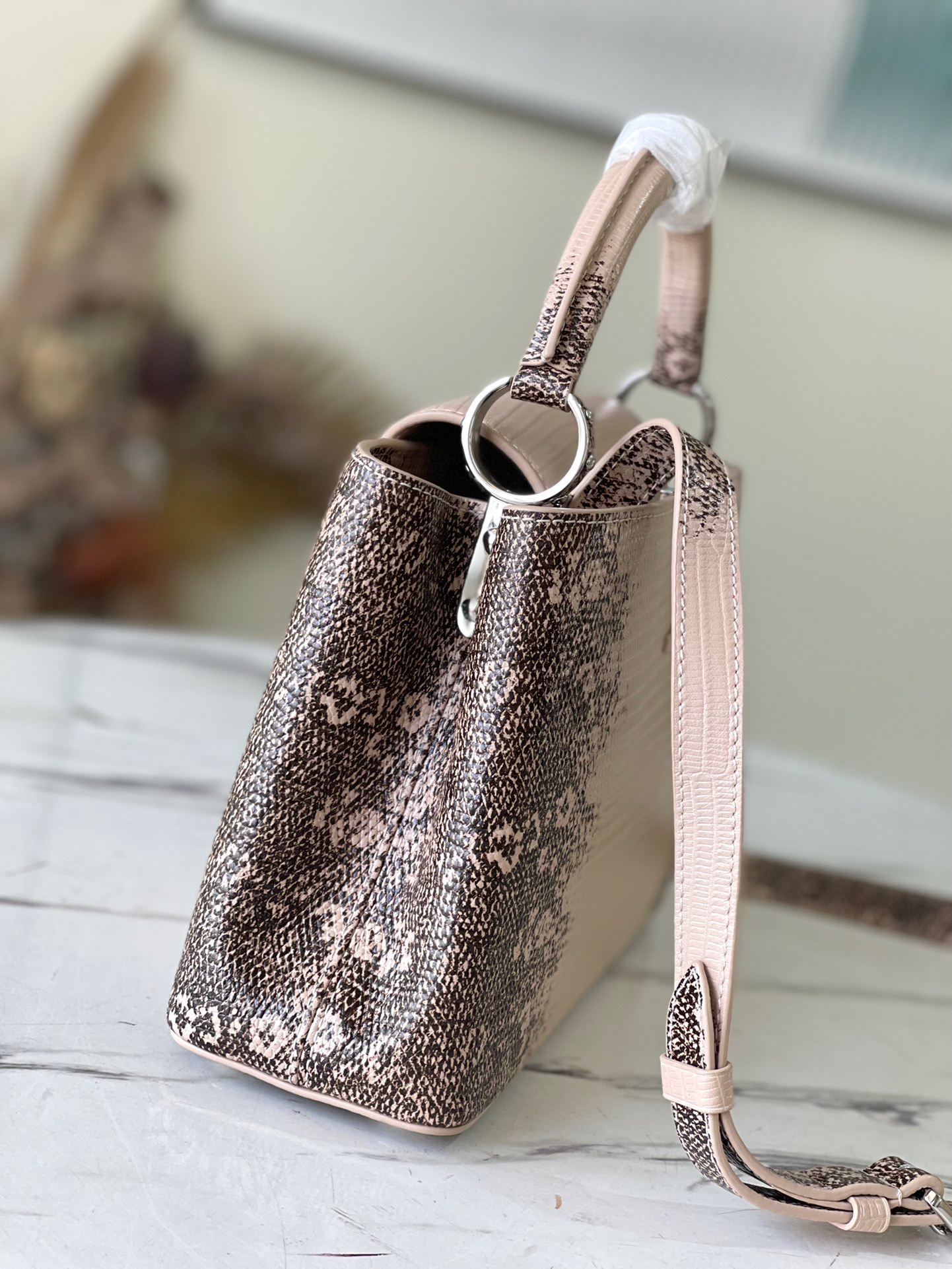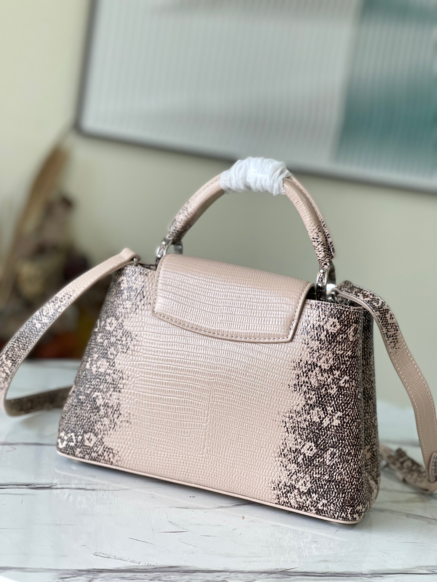 M48865 Small Khaki Lizard Himalayan Top original single Capucines Handbag exquisitely blends graceful lizard skin outer layer, fine sheep leather inner lining and lustrous metal parts, and the iconic flip achieves two styles of fashion: inside to read the logo, and outside to bloom Monogram Flowers, brighten up an eye-catching corner for evening occasions. Size: 27*18*9cm