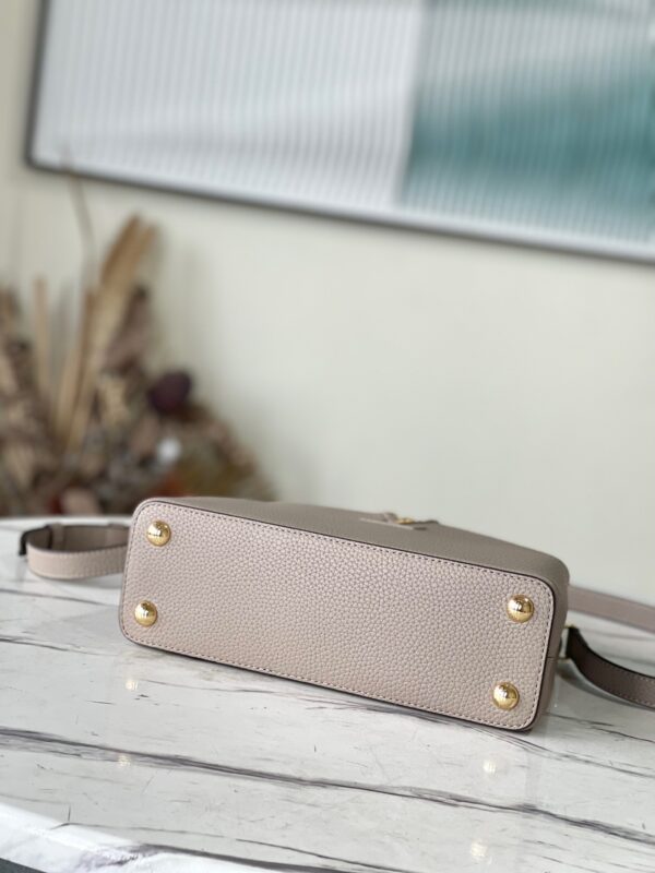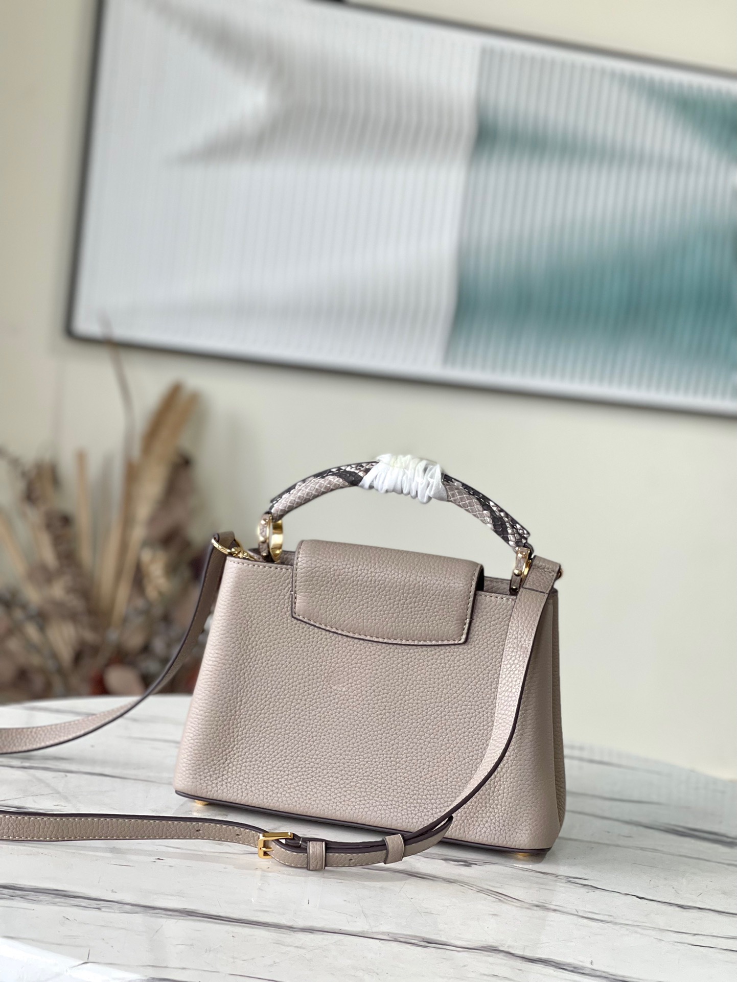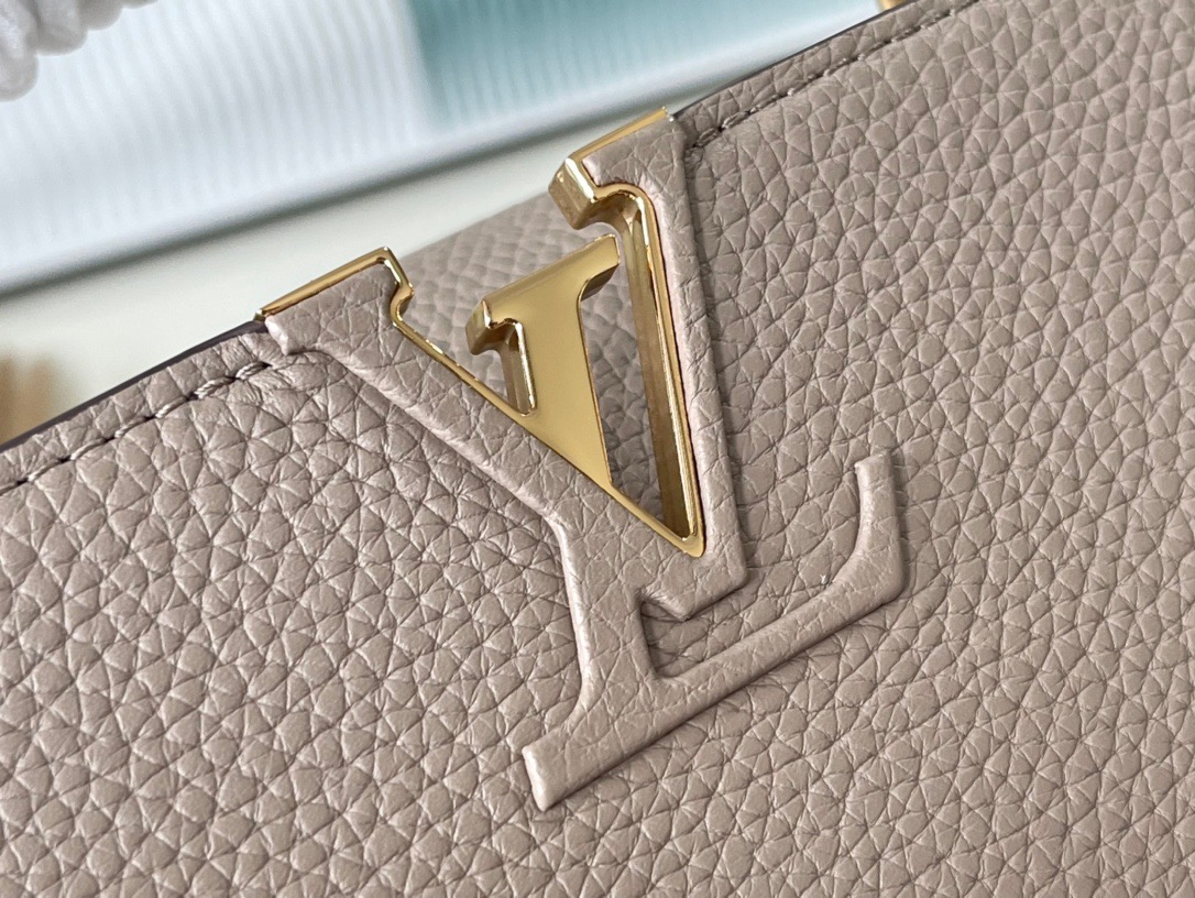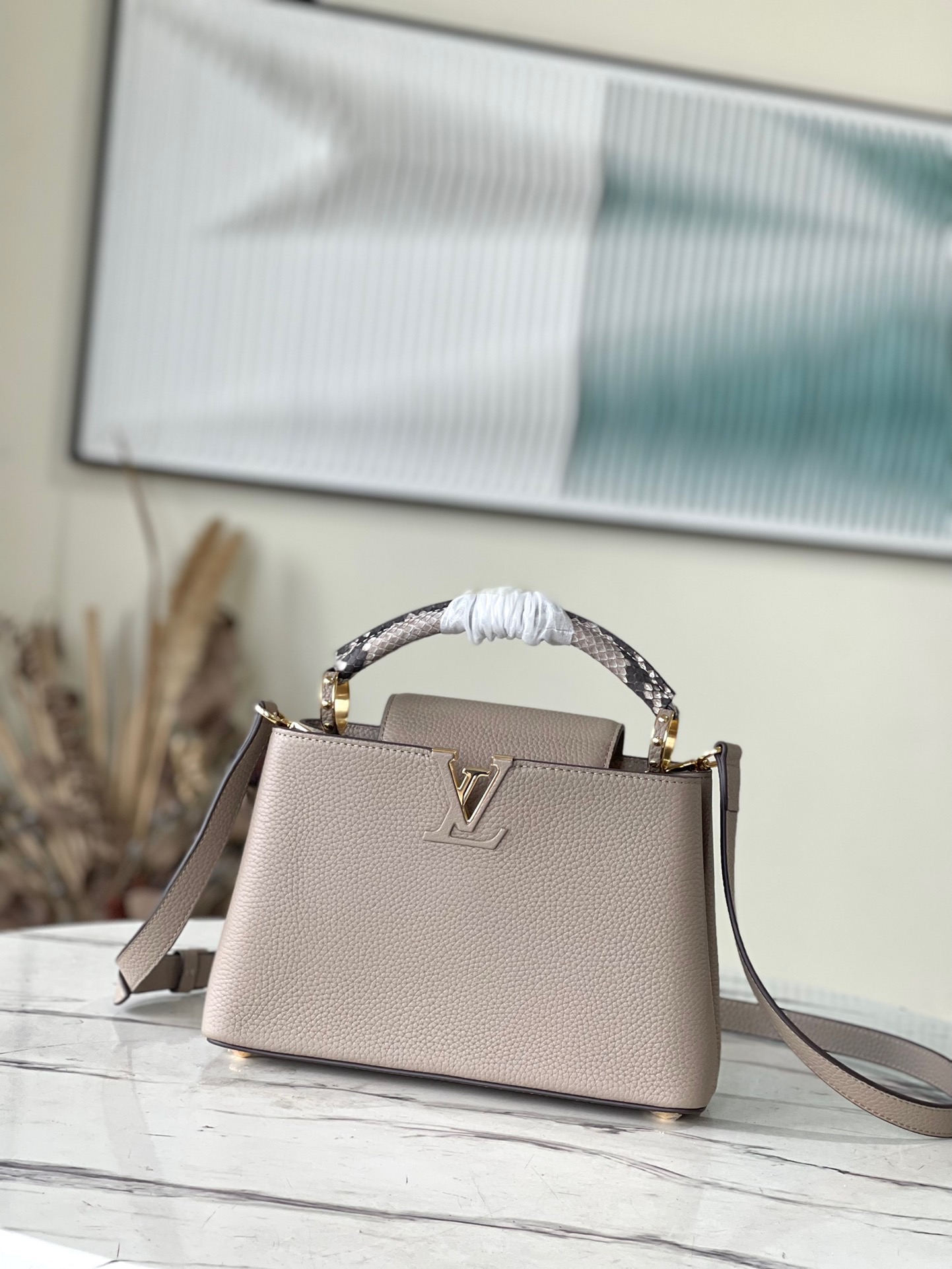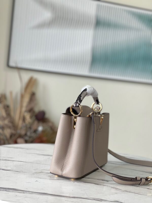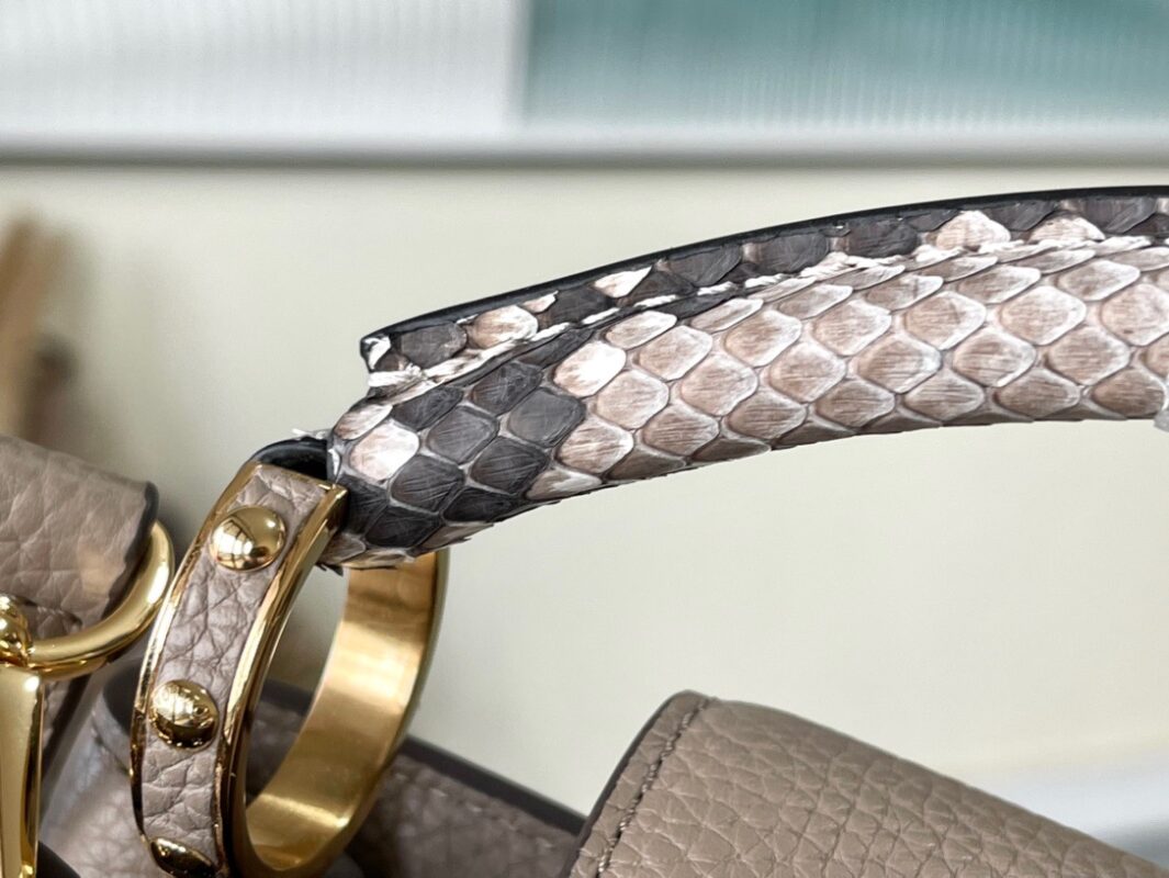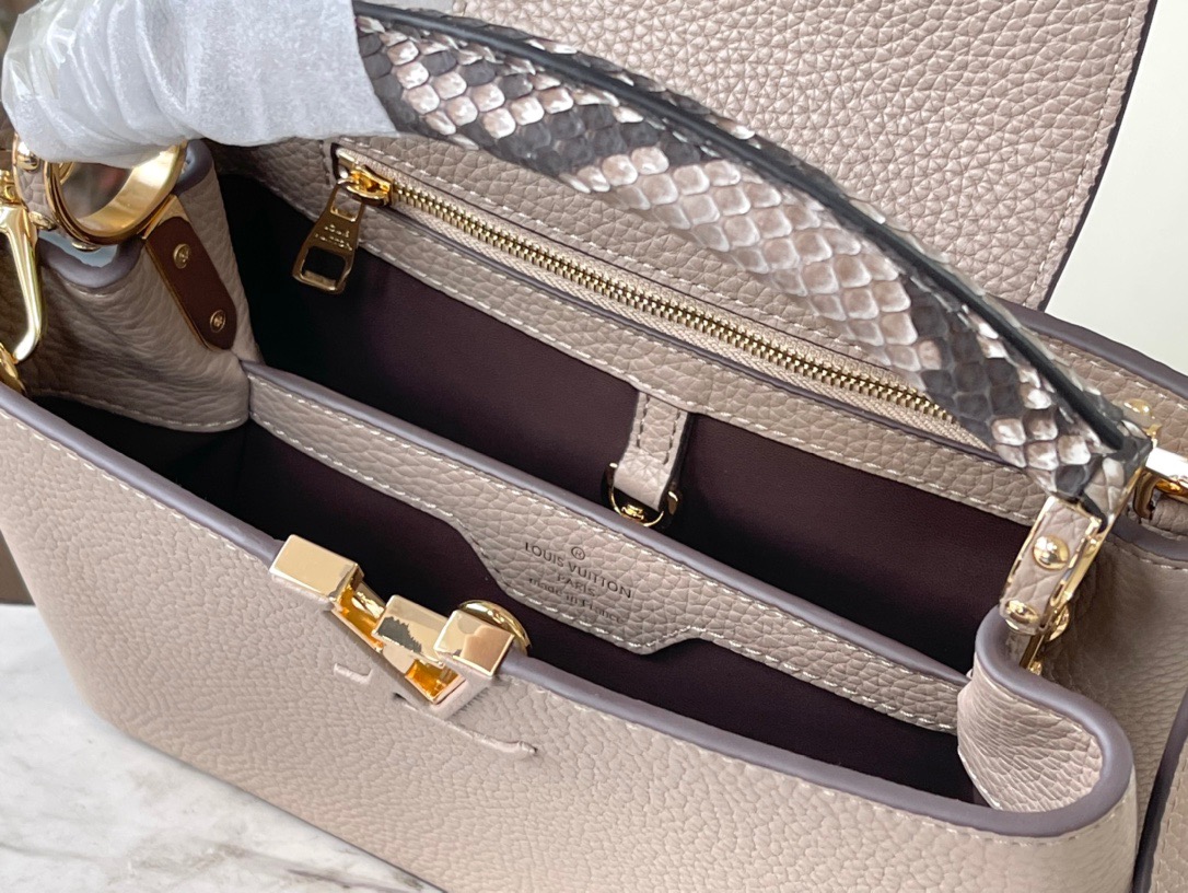 Top Original N92802 Small Light Coffee Snake This new classic Capucines BB handbag is made of full-grain Taurillon leather, incorporating multiple brand iconic designs: leather-wrapped letters, jewelry-style handle rests inspired by traditional hard cases, a chic flap decorated with Monogram flowers. With a luxurious python leather handle, it is refined and elegant. First launched in 2013, the Capucines bag is named after the Parisian street where the store opened in 1854. Dimensions: 27 x 18 x 9 cm