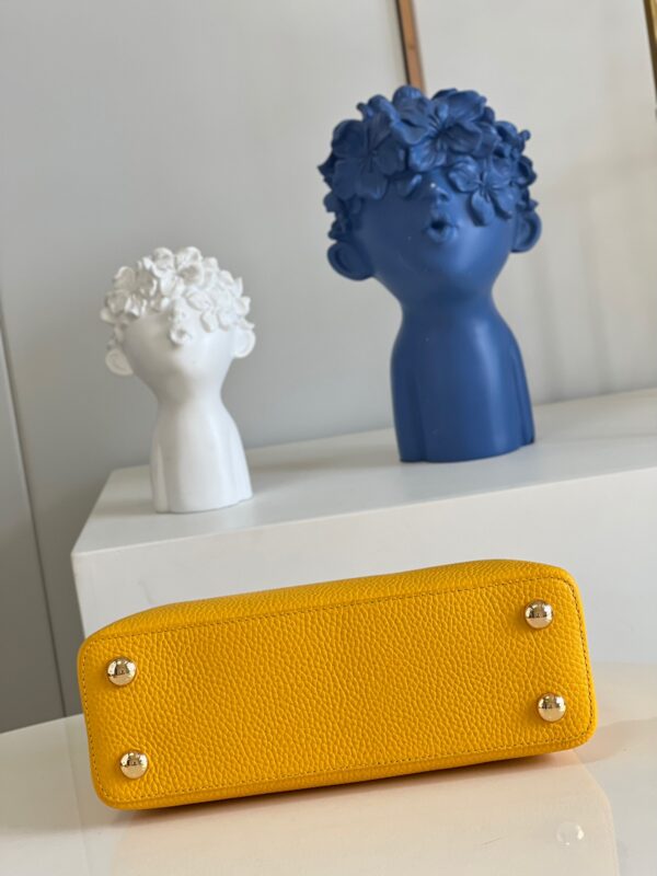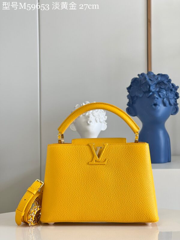 M59653 Light Gold Small Capucines BB Handbag Imported French calfskin. Shiny metal accessories. Unique Capucines cover can be put inside the bag to display the letter logo, and can be turned inside out to present the Monogram Flower pattern. Size: 27 x 18 x 9cm
