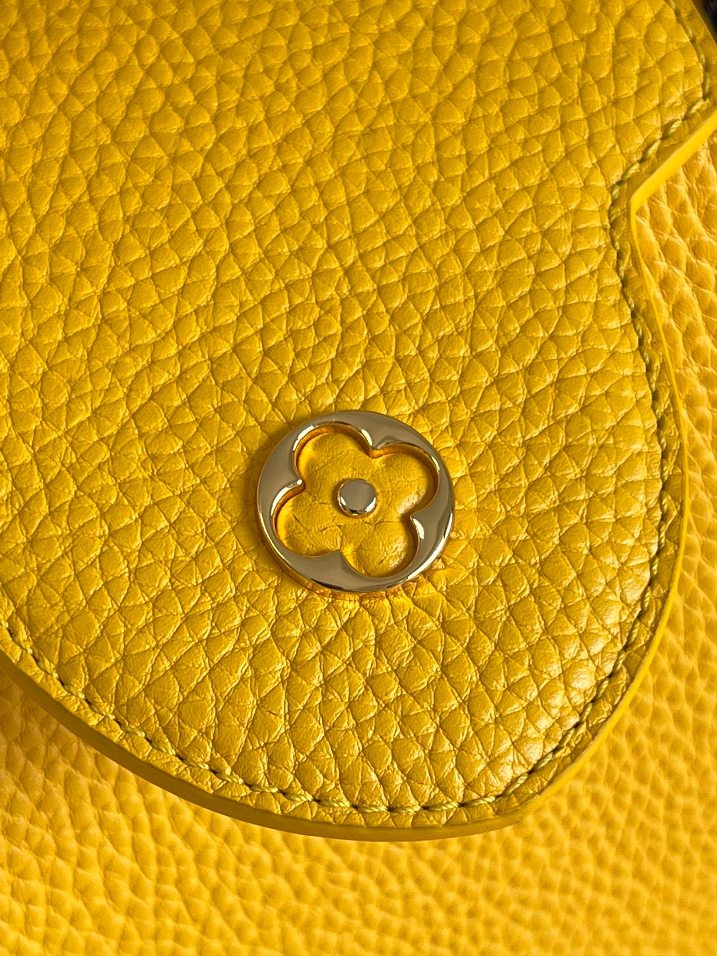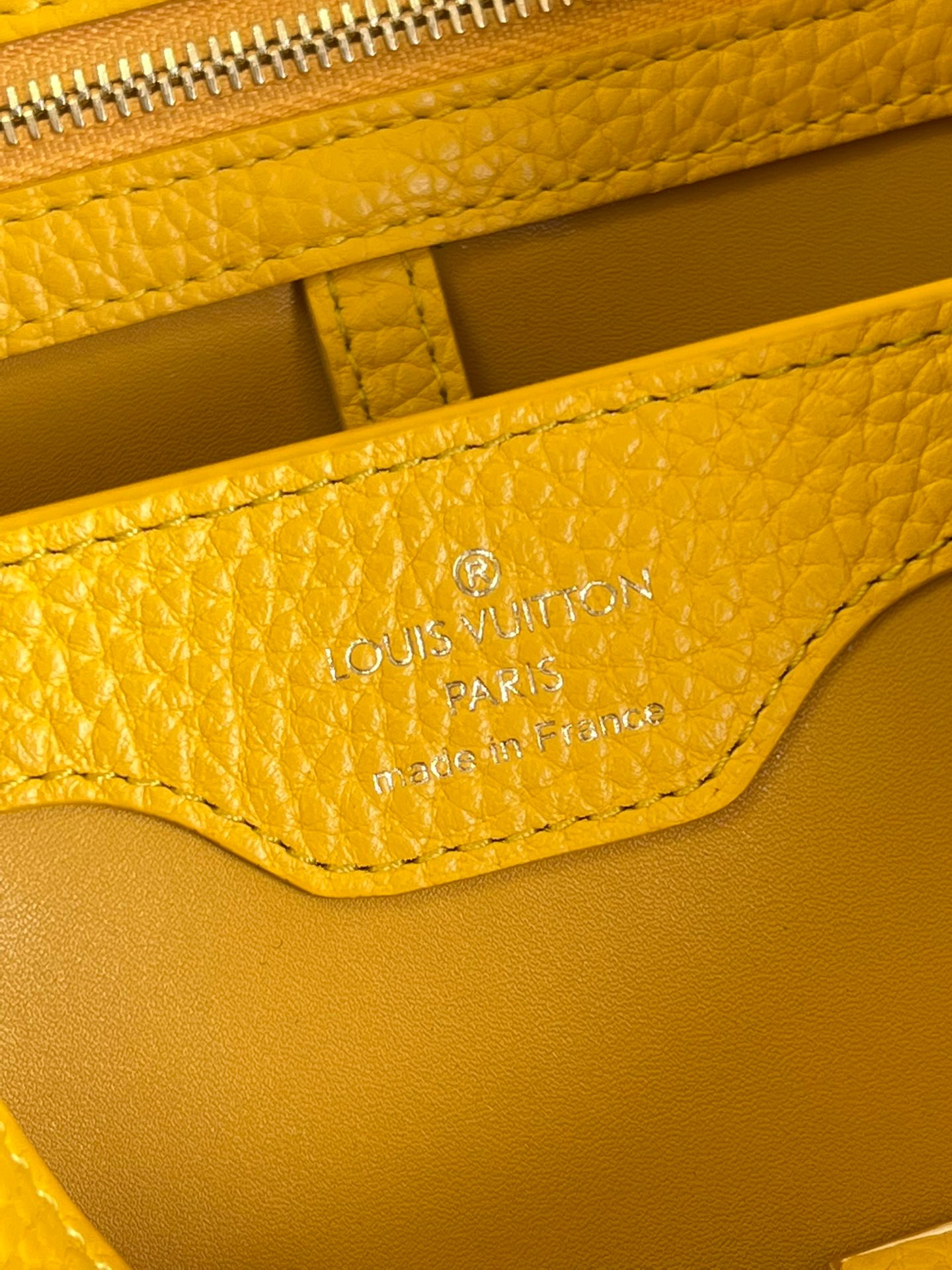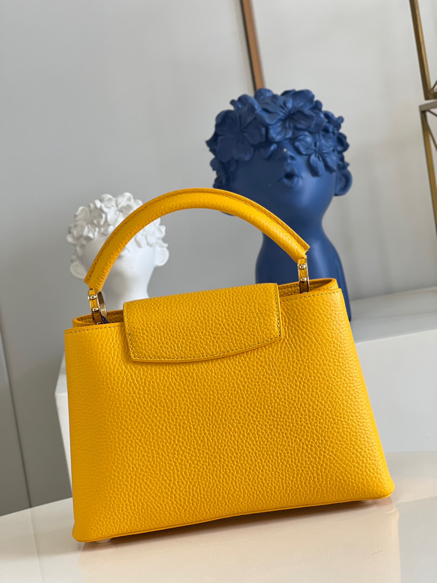 M59653 Light Gold Small Capucines BB Handbag Imported French calfskin. Shiny metal accessories. Unique Capucines cover can be put inside the bag to display the letter logo, and can be turned inside out to present the Monogram Flower pattern. Size: 27 x 18 x 9cm