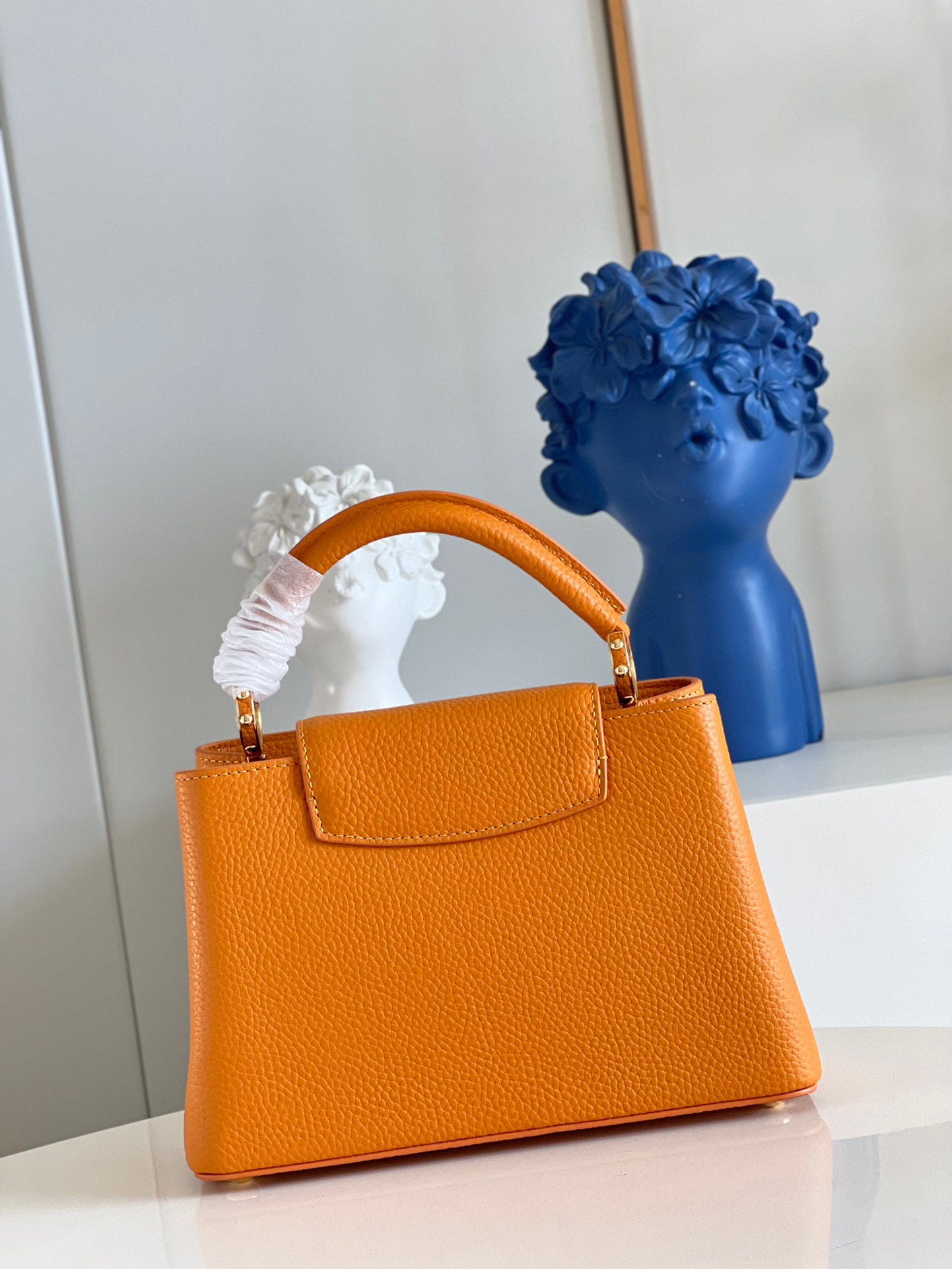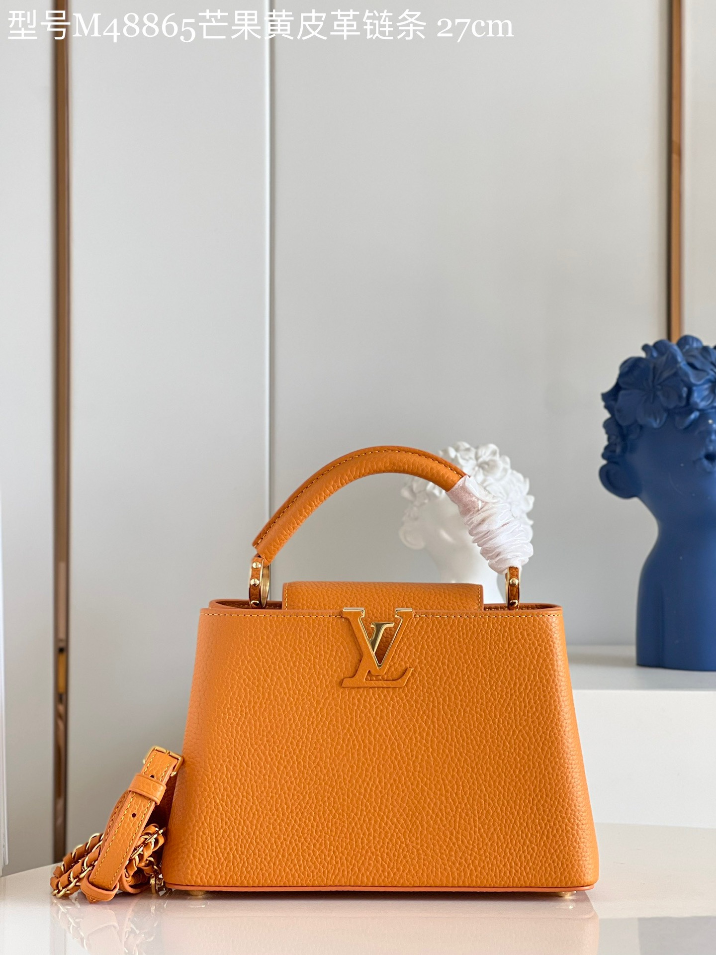 M48865 Mango Yellow Leather Chain Small Capucines BB Handbag Imported French calfskin. Shiny metal accessories. Unique Capucines cover can be placed inside the bag to display the letter logo, and can be turned out to display the Monogram Flower pattern.Size: 27 x 18 x 9cm