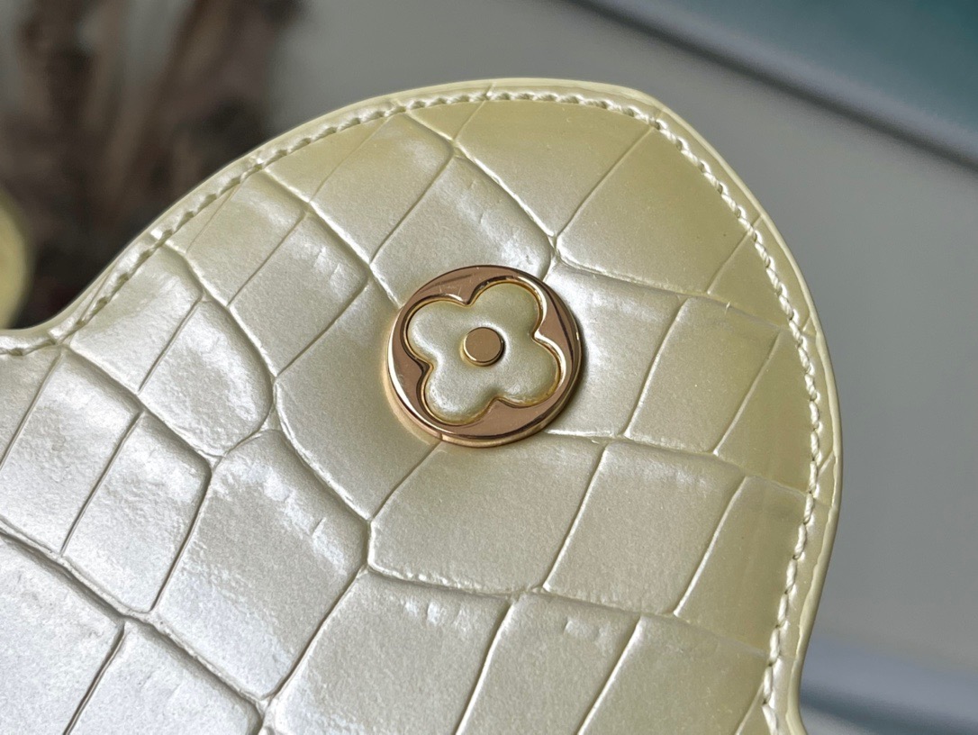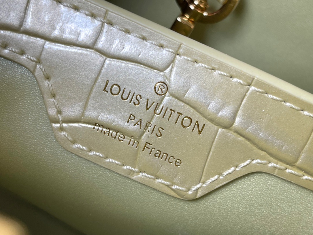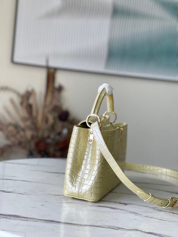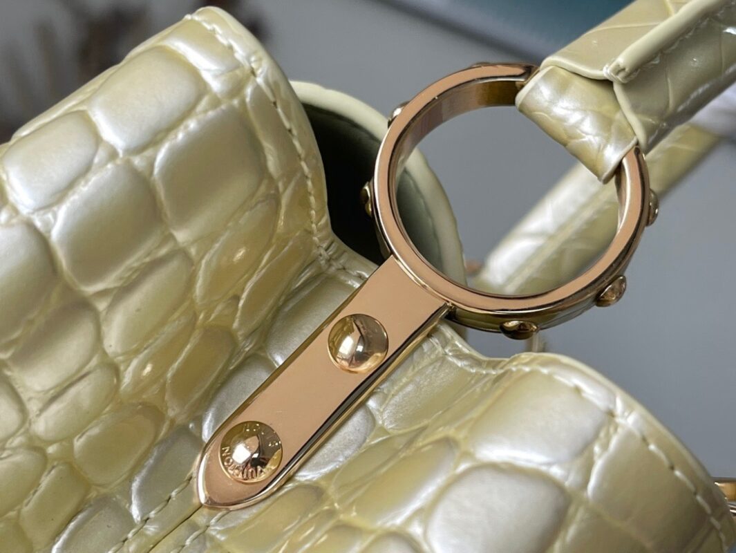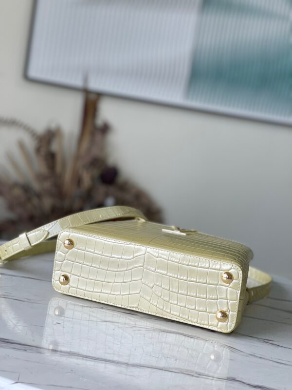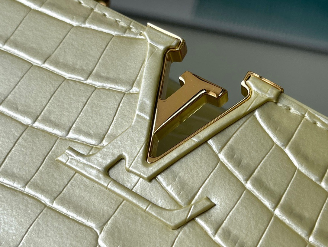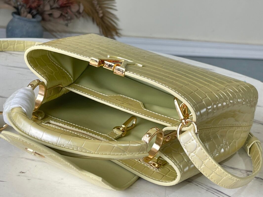 M48865 Pale Yellow Crocodile Pattern This precious Capucines BB handbag is made of crocodile pattern with high gloss treatment, which shines alluring and luxurious goatskin lining and gleaming metal parts. The unique Capucines flap can be stored in the bag. Displays the letter logo and can be turned inside out to present the Monogram Flower pattern. Dimensions: 27x18x9 cm