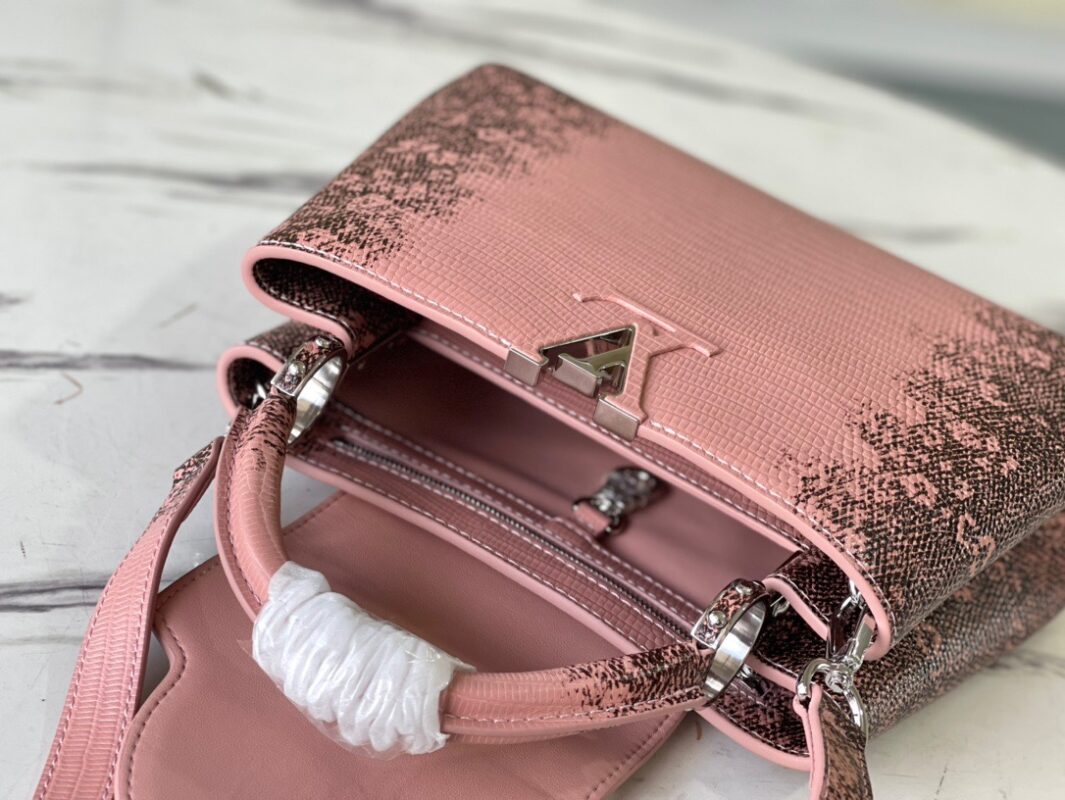 M48865 BB Pink Lizard Pattern Capucines BB handbag delicately blends graceful lizard skin outer layer, delicate sheepskin inner lining and shiny metal parts. The iconic flap achieves two styles of fashion: the inside reads the lv logo and the outside is blooming Monogram flowers. Light up a corner of the eye in the evening. Size: 27x18x9cm