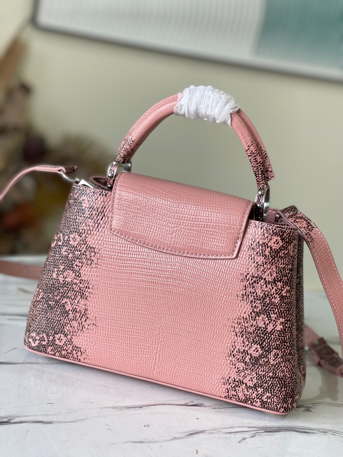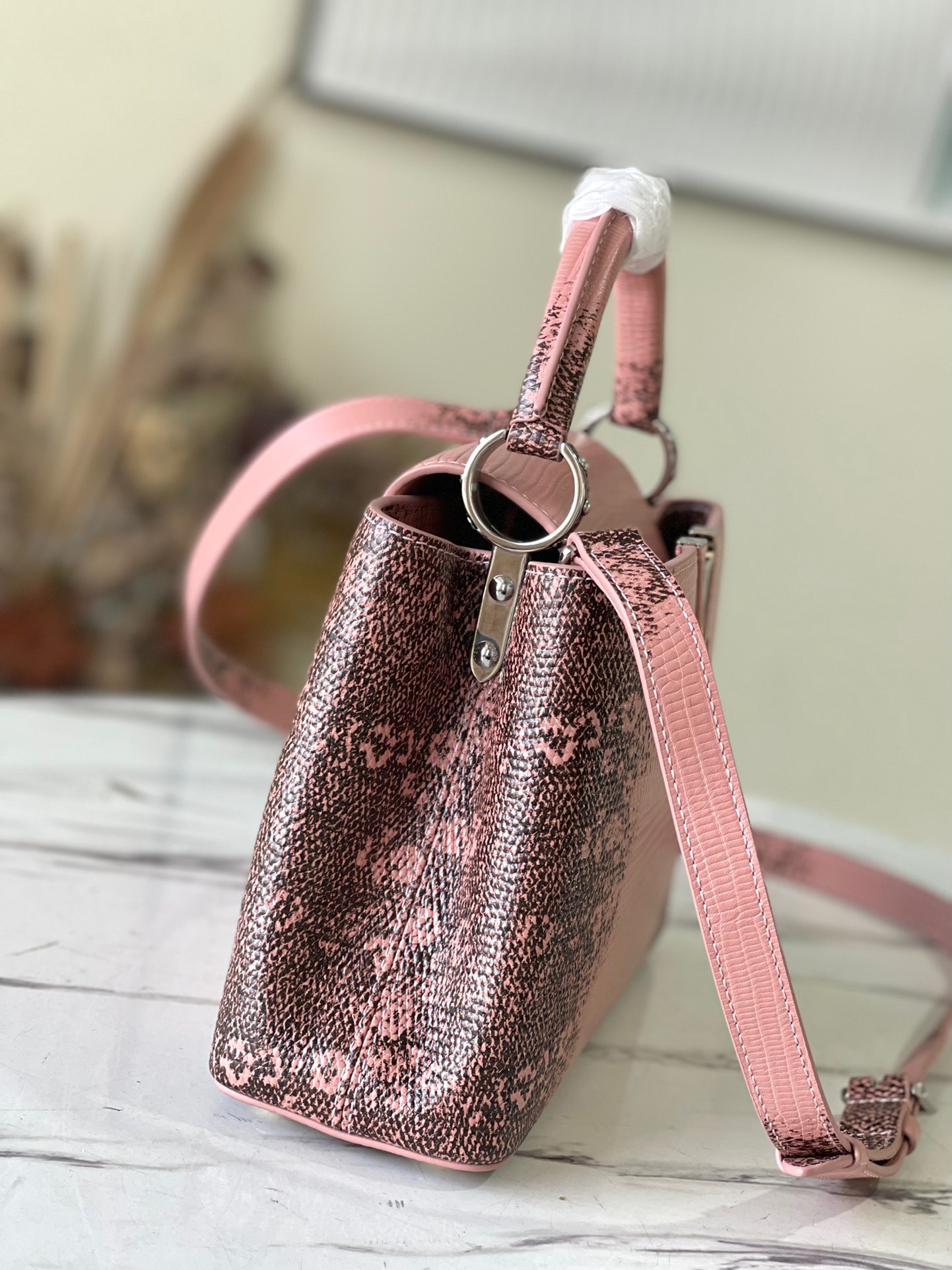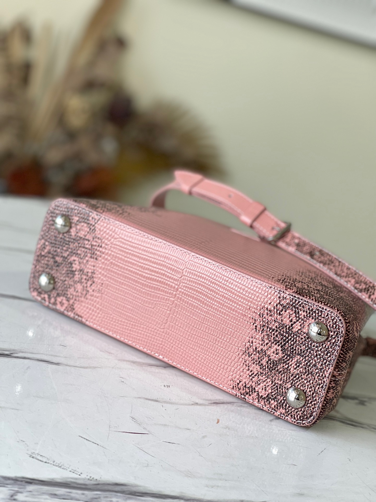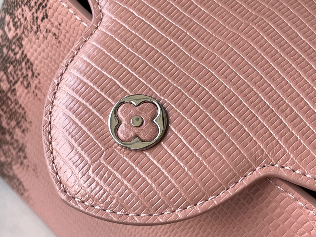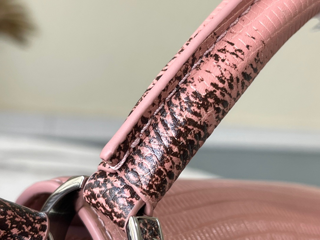 M48865 BB Pink Lizard Pattern Capucines BB handbag delicately blends graceful lizard skin outer layer, delicate sheepskin inner lining and shiny metal parts. The iconic flap achieves two styles of fashion: the inside reads the lv logo and the outside is blooming Monogram flowers. Light up a corner of the eye in the evening. Size: 27x18x9cm
