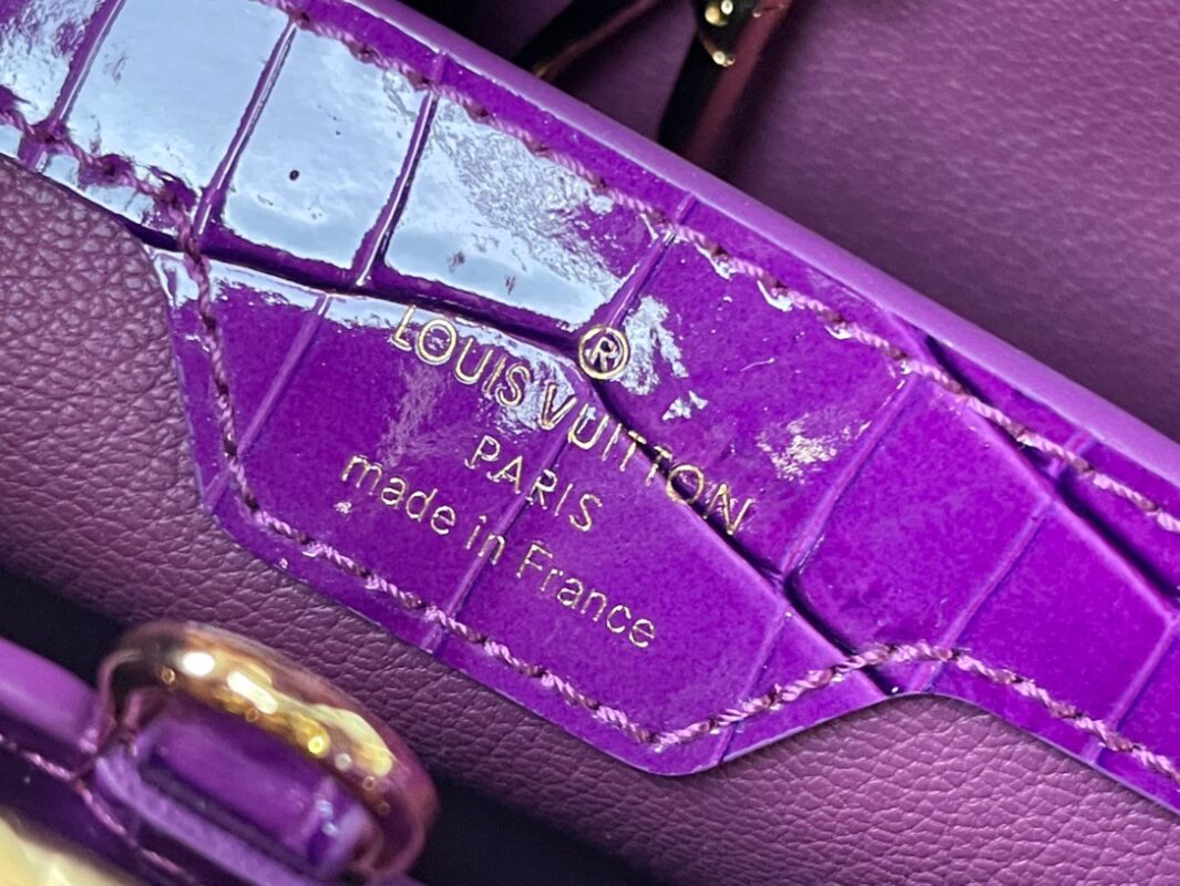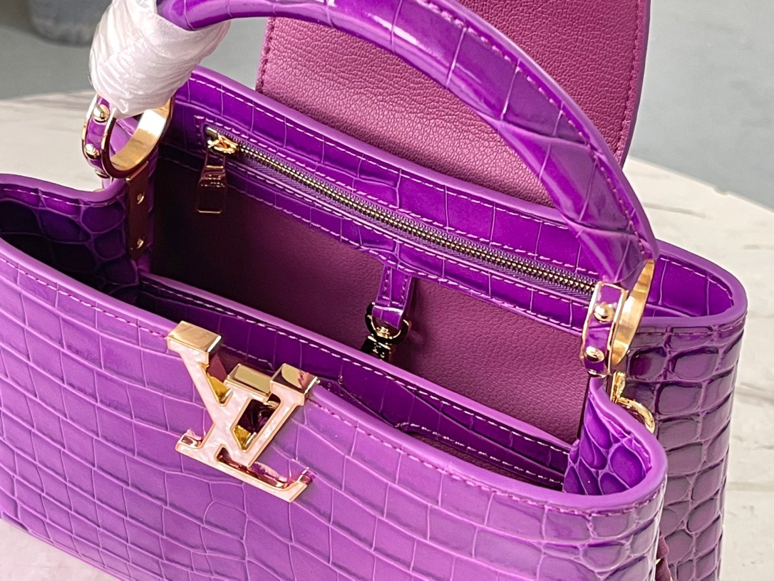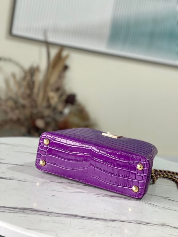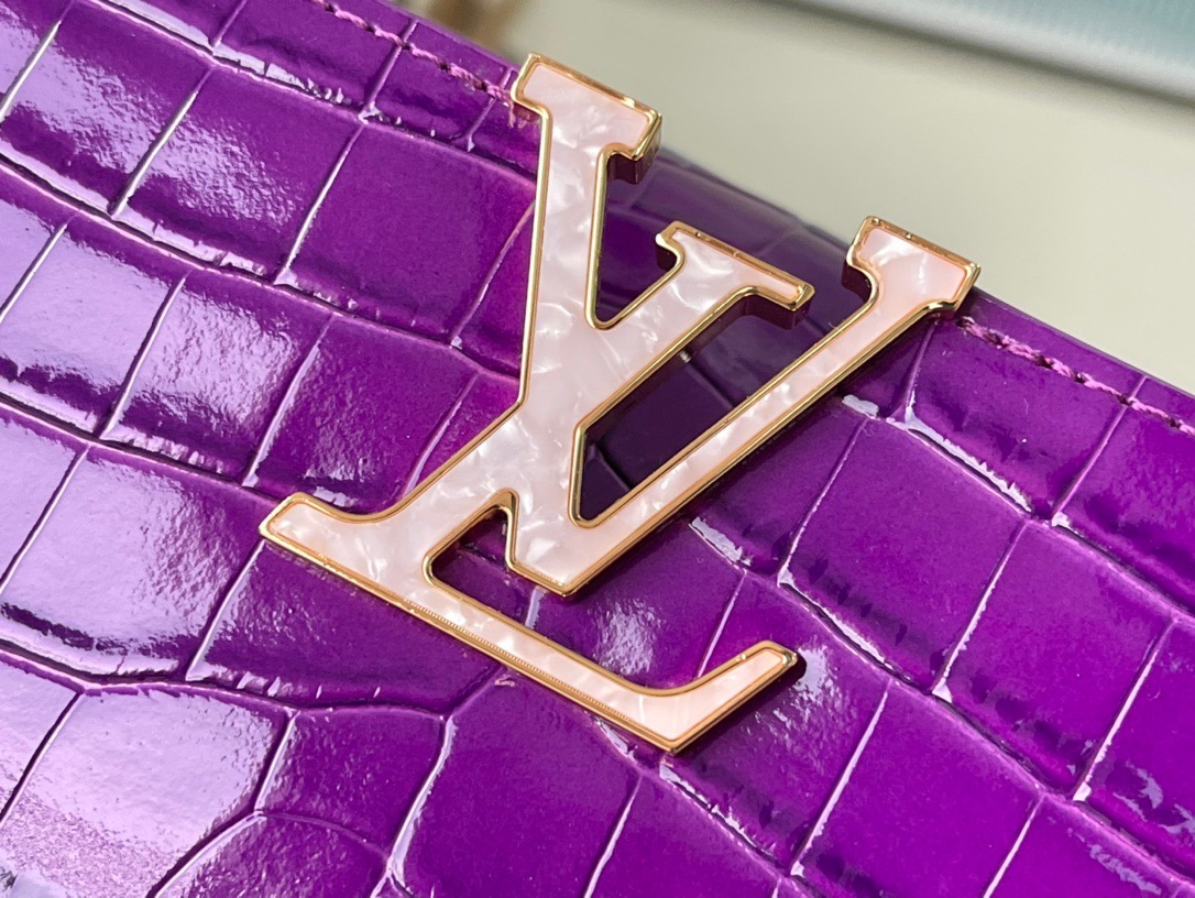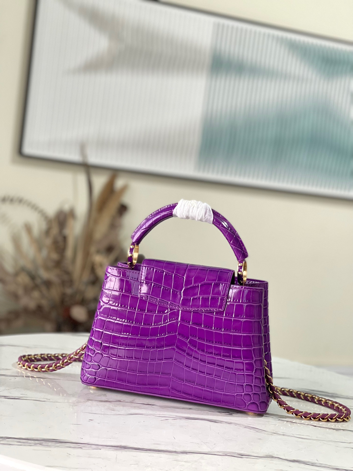 M48865 Purple Crocodile Mother-of-pearl Chain Item/ SmallThis Capucines BB handbag is made of rare leather to declare the modern atmosphere. The crocodile leather braided chain can be removed at will, allowing the shoulder and crossbody to be switched freely. Dimensions:27x18x9cm