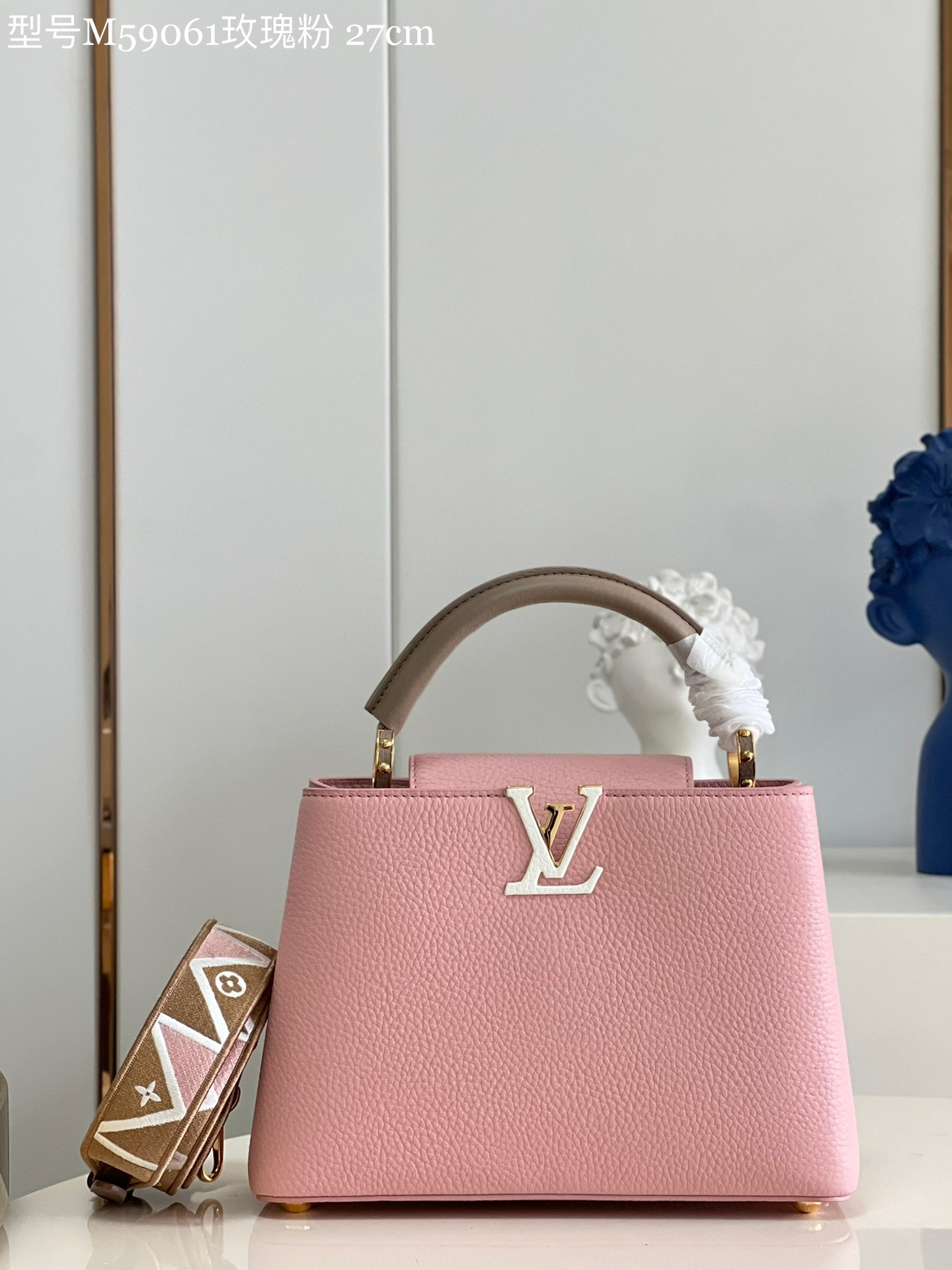 M59061 Rose Pink SmallCapucines BB Handbag Imported French calfskin. Shiny metal accessories. The unique Capucines cover can be placed inside the bag to display the letter logo, and can be turned out to present the Monogram Flower pattern.Size: 27 x 18 x 9cm