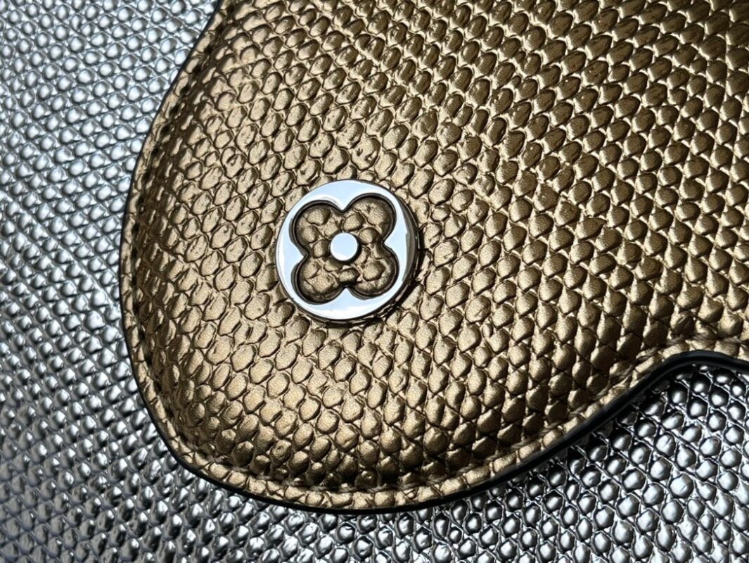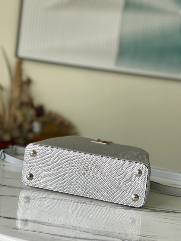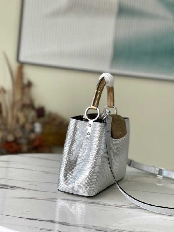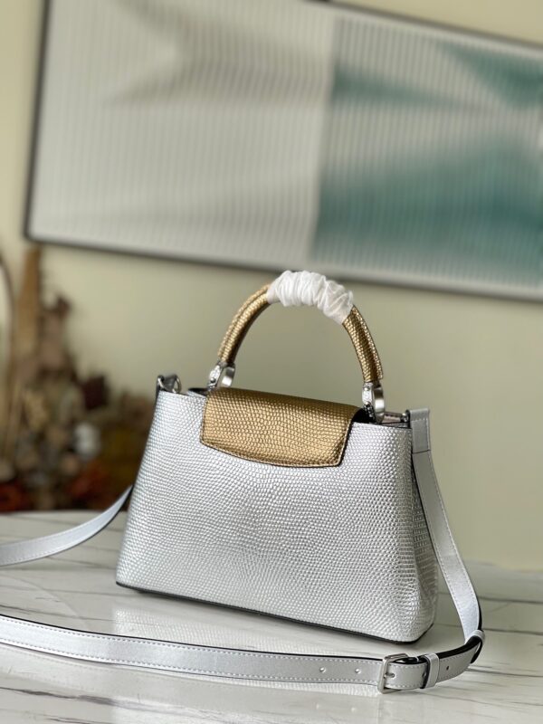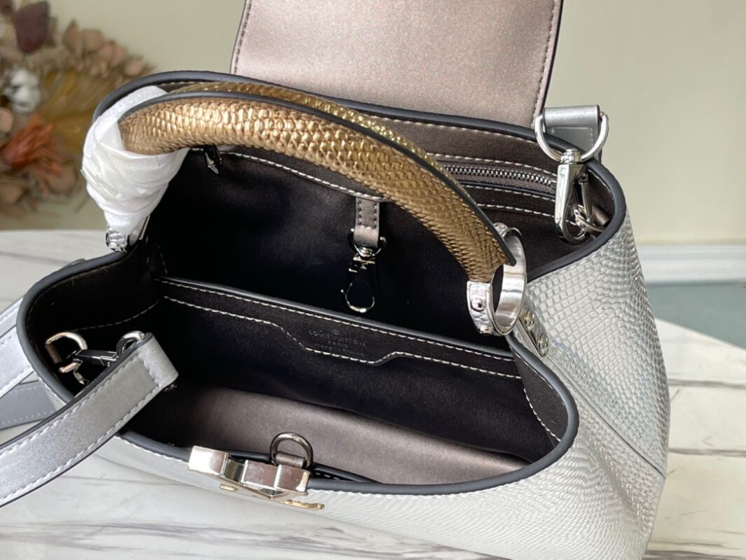 Top original single M48865 Gold and Silver Lizard Small Capucines Handbag exquisitely blends graceful lizard skin outer layer, fine sheep leather lining and lustrous metal parts, and the iconic flip achieves two styles of fashion: inside to read the logo, and outside to bloom Monogram flowers, to light up the eye-catching corner for evening occasions. Size:27x18x9cm
